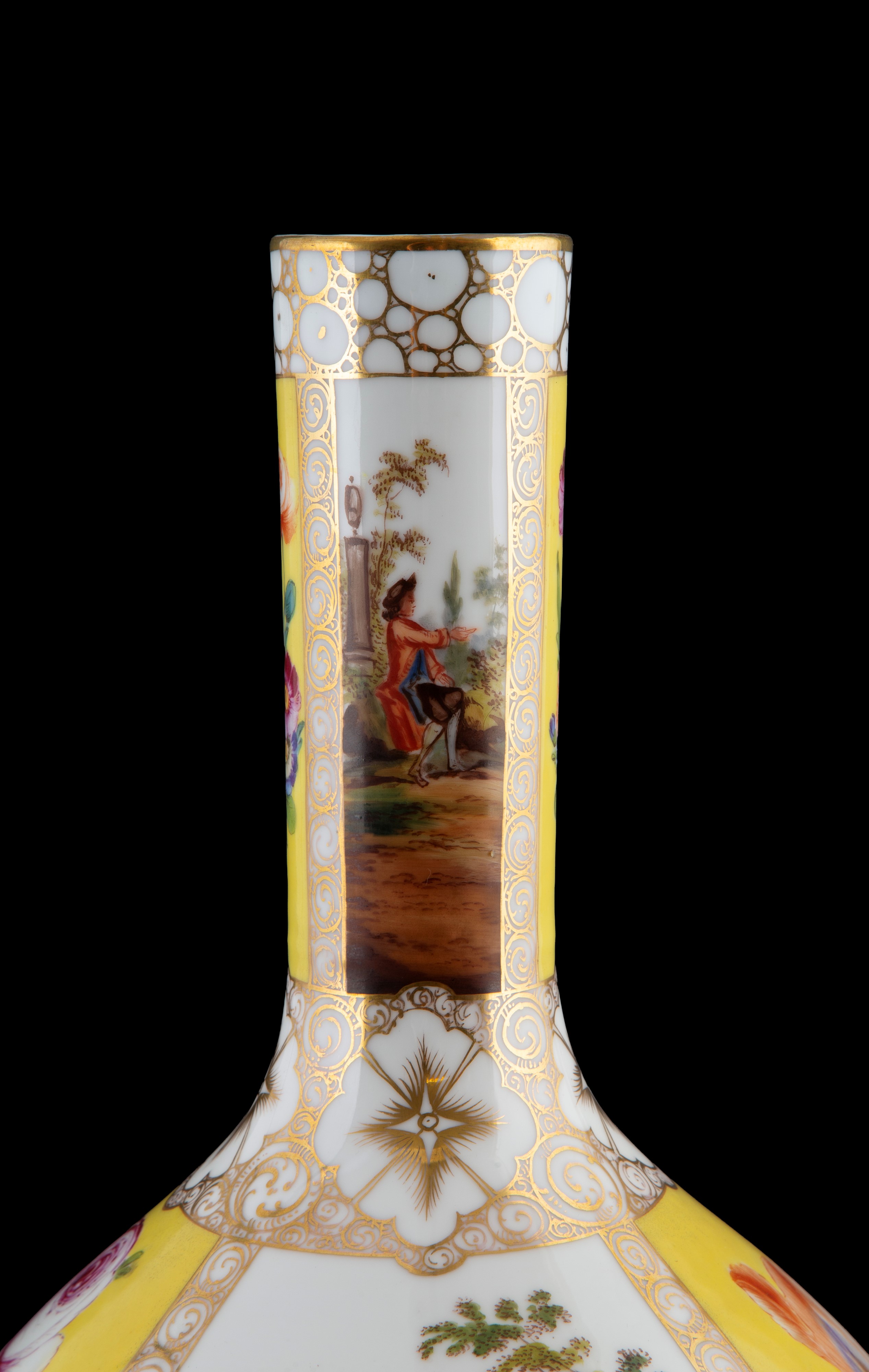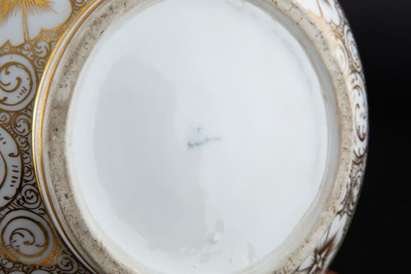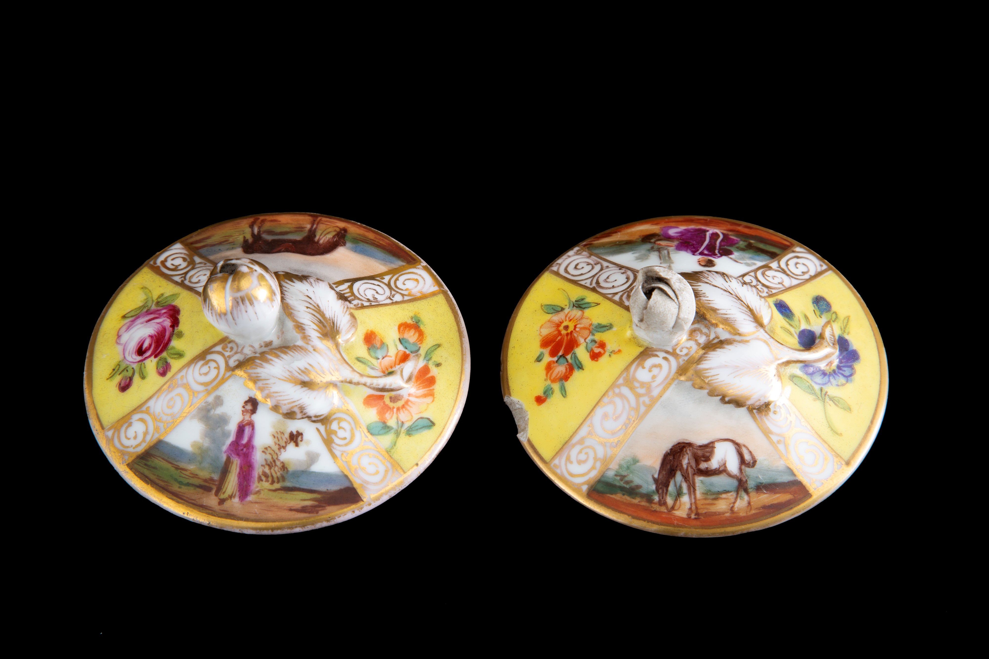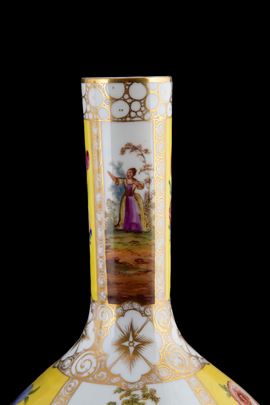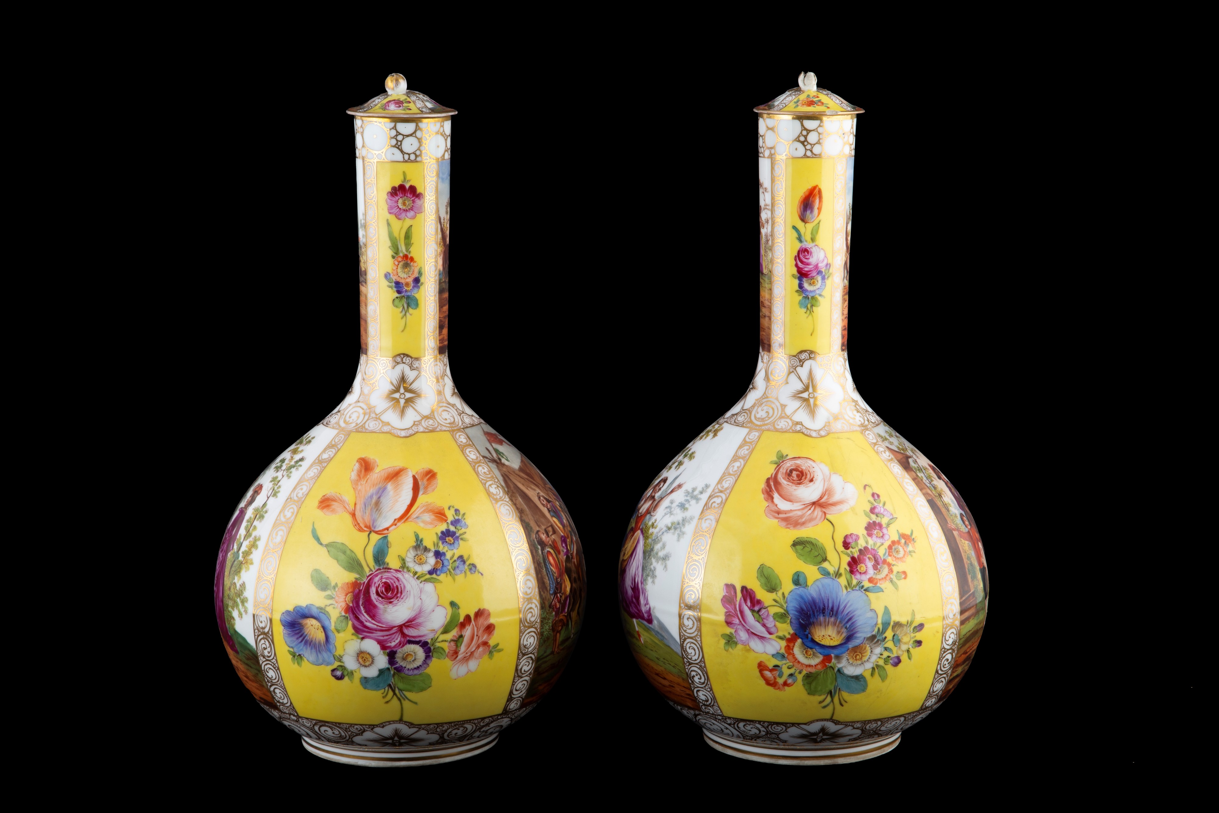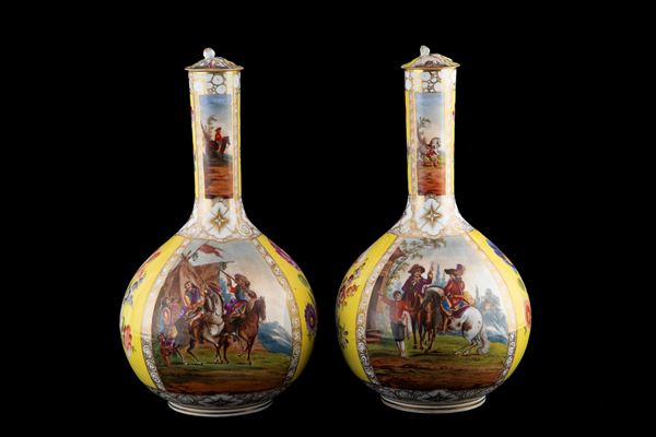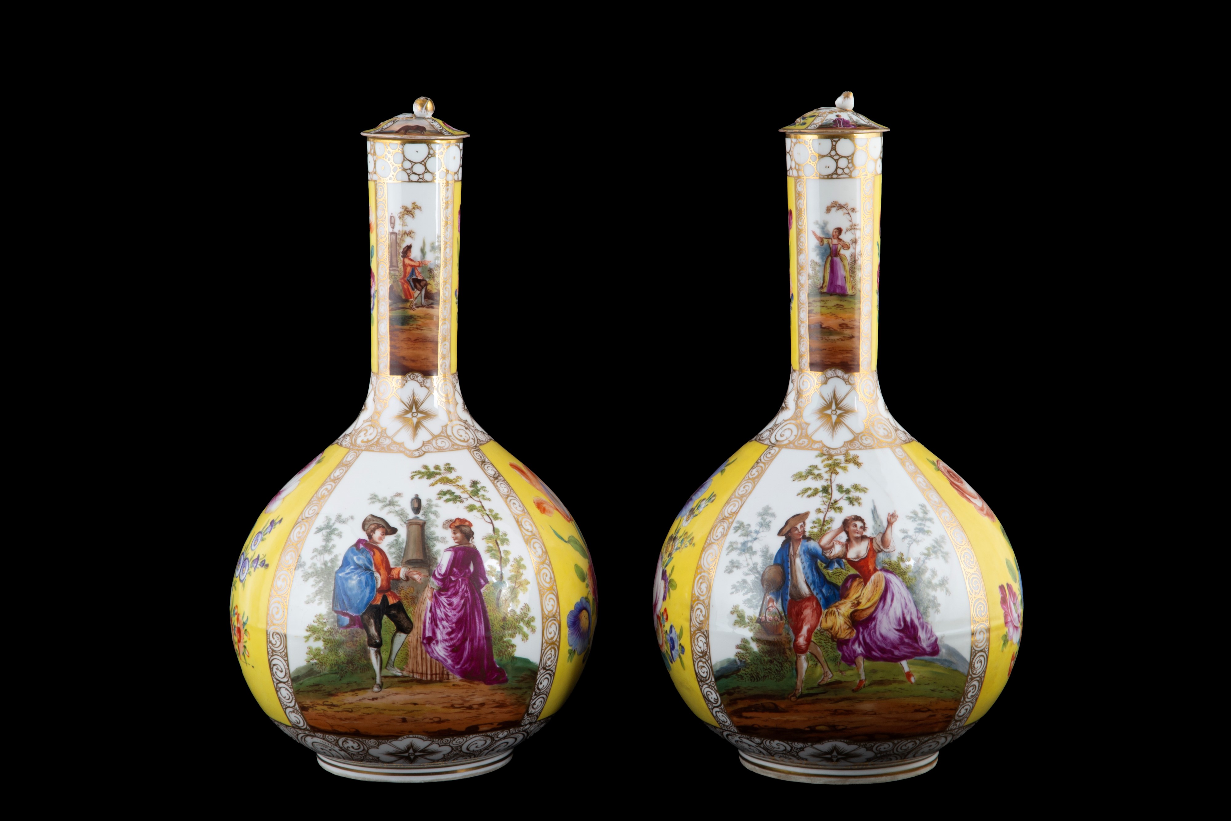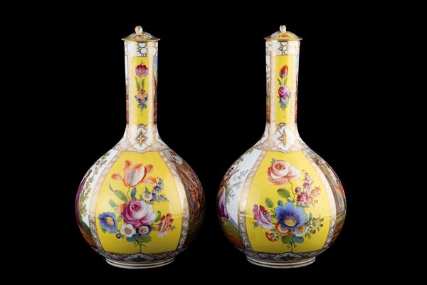 Pair of polychrome porcelain vases with lids, yellow-ground, with romantic scenes and flowers within reserves. Unidentified mark on the bottom. Germany. 19th century. Minor defects.
