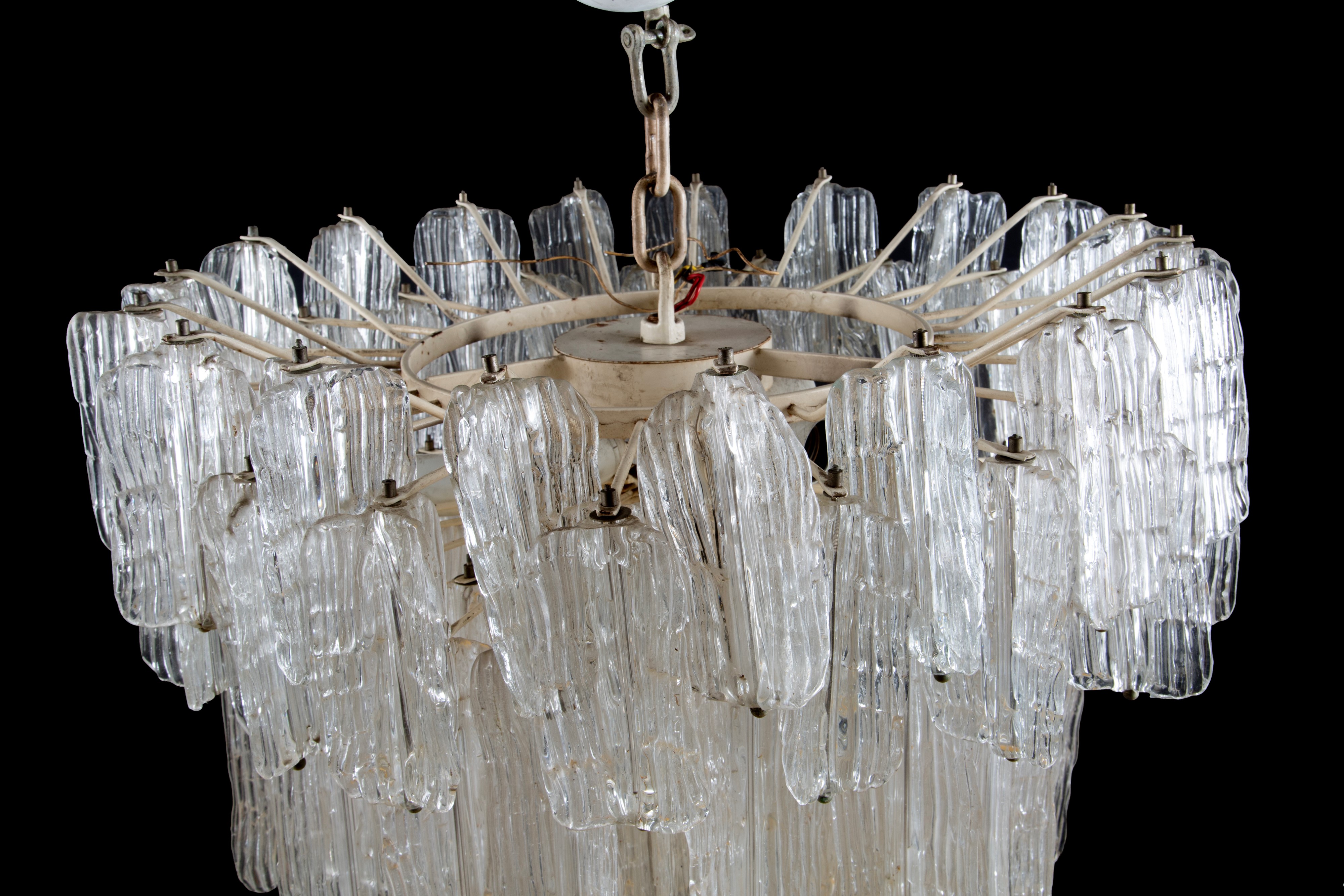 Eight-light chandelier in Murano glass, white painted metal, and iron. Produced by VENINI. 1950s.