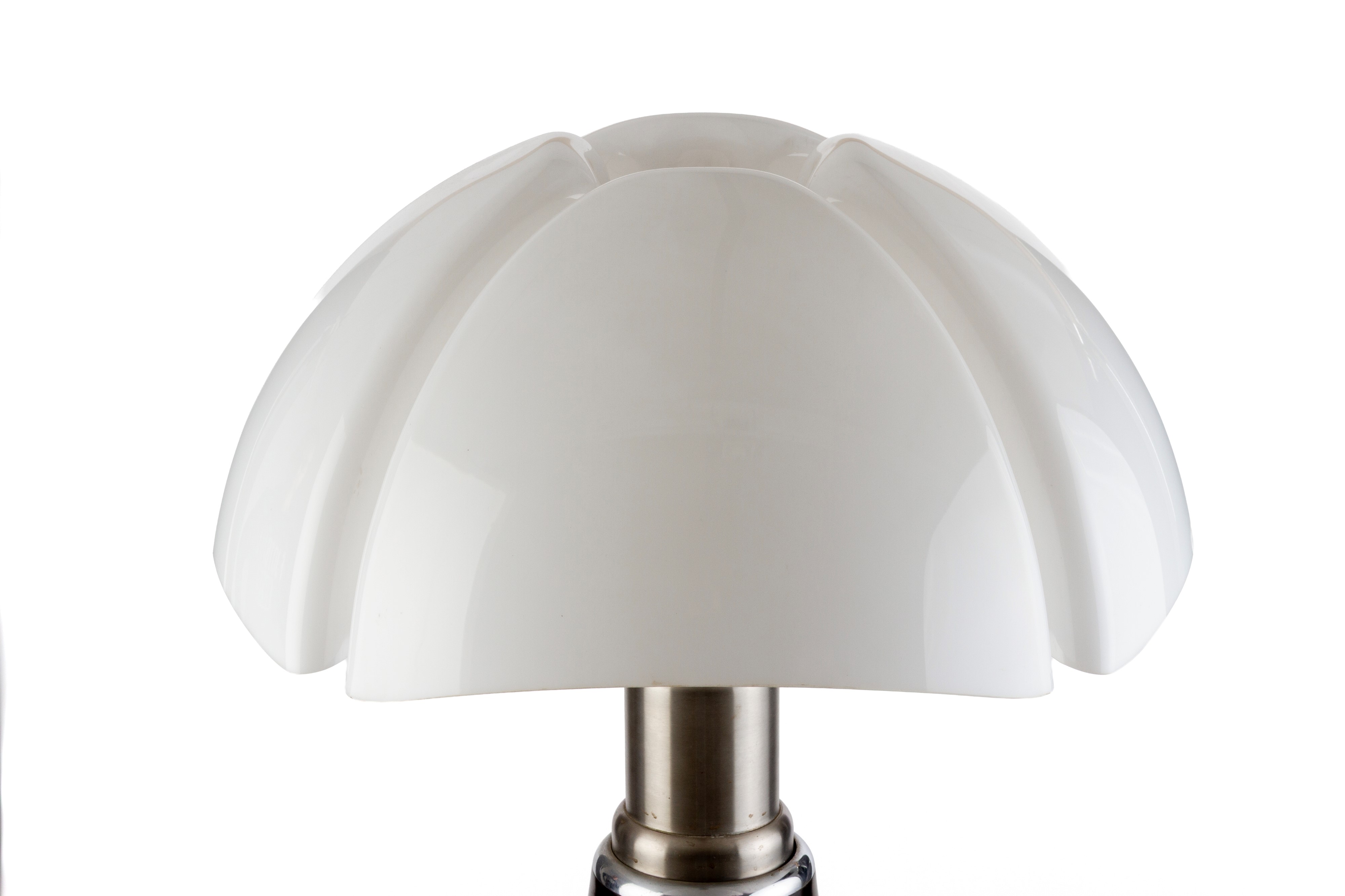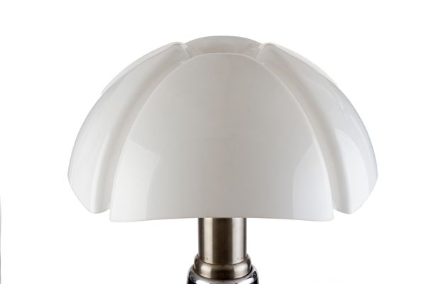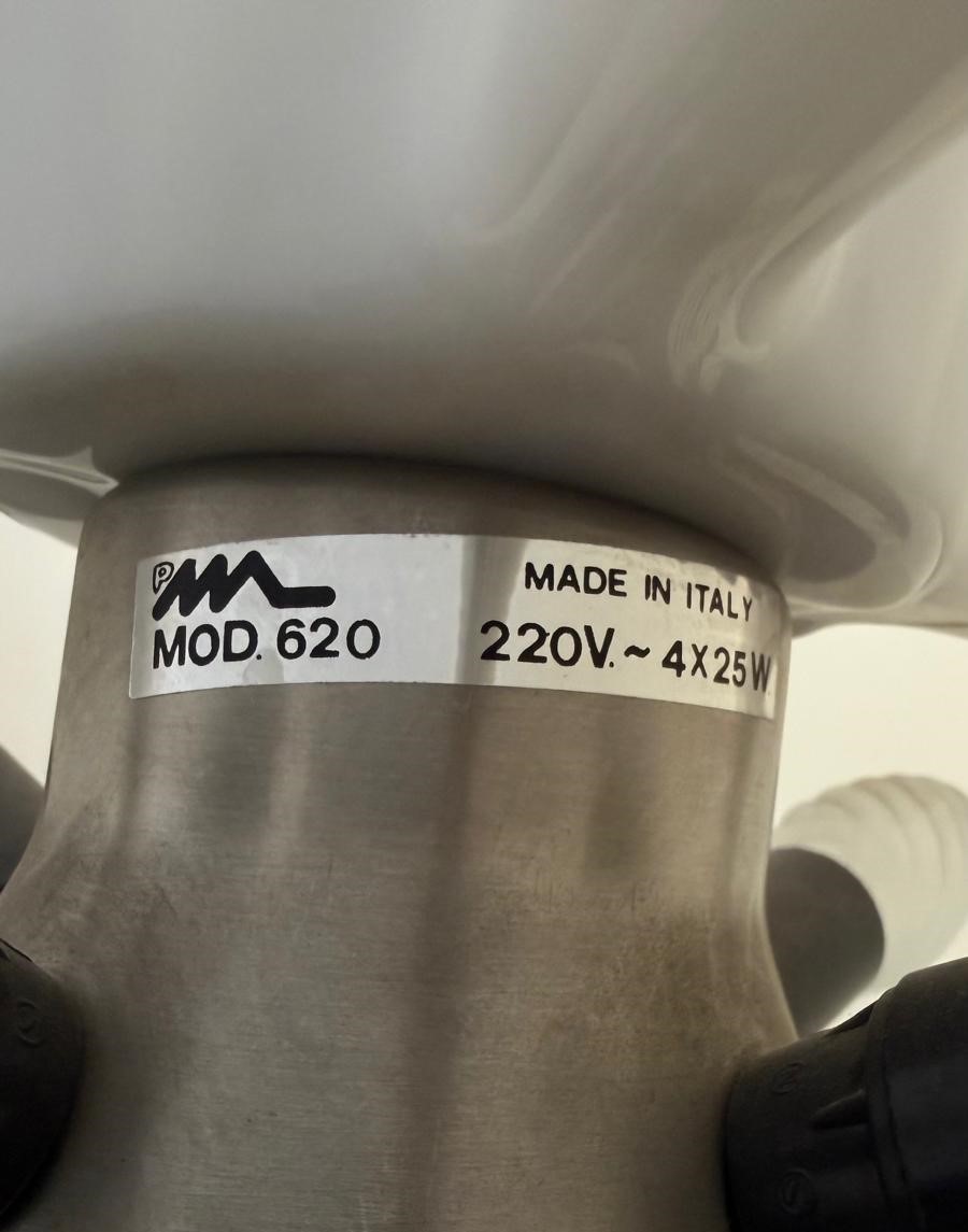 Pipistrello lamp, model 620, with four lights, in chromed metal, steel, and black with a plastic diffuser. Made by MARTINELLI LUCE. Marked on the bottom and with a manufacturer's label on the stem. 1960s.