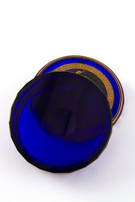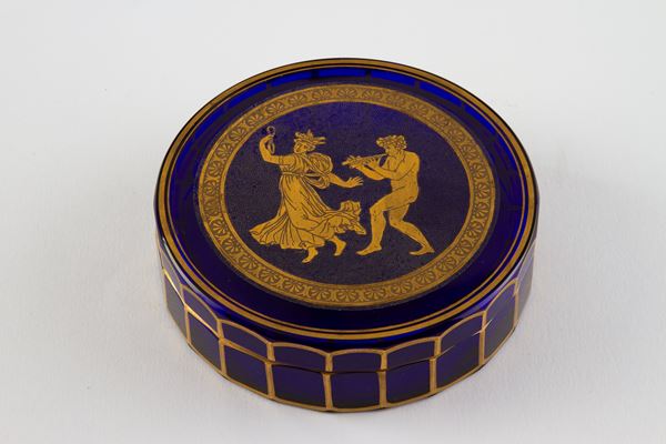 Blue glass box with gold decorations and a bacchanalian scene on the lid. Signs of wear.