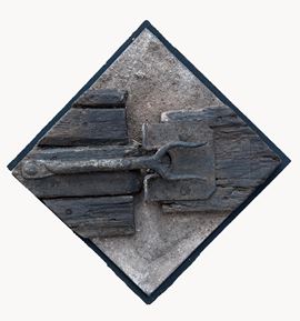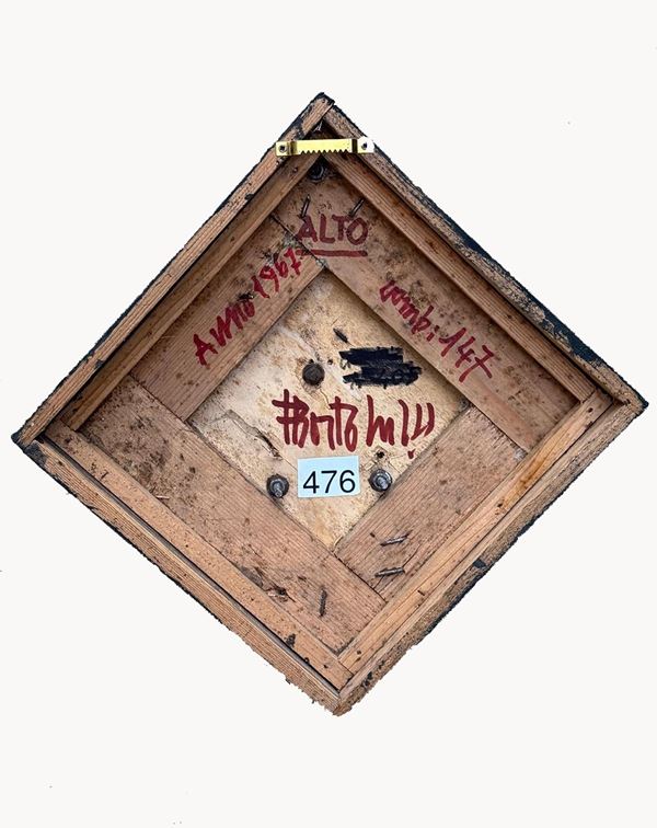 Mixed media wood, iron, and refractory clay on hardboard, titled "COMPOSIZIONE N.147, 1967." Signed, dated, and titled on the back.