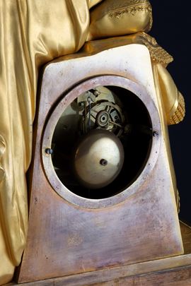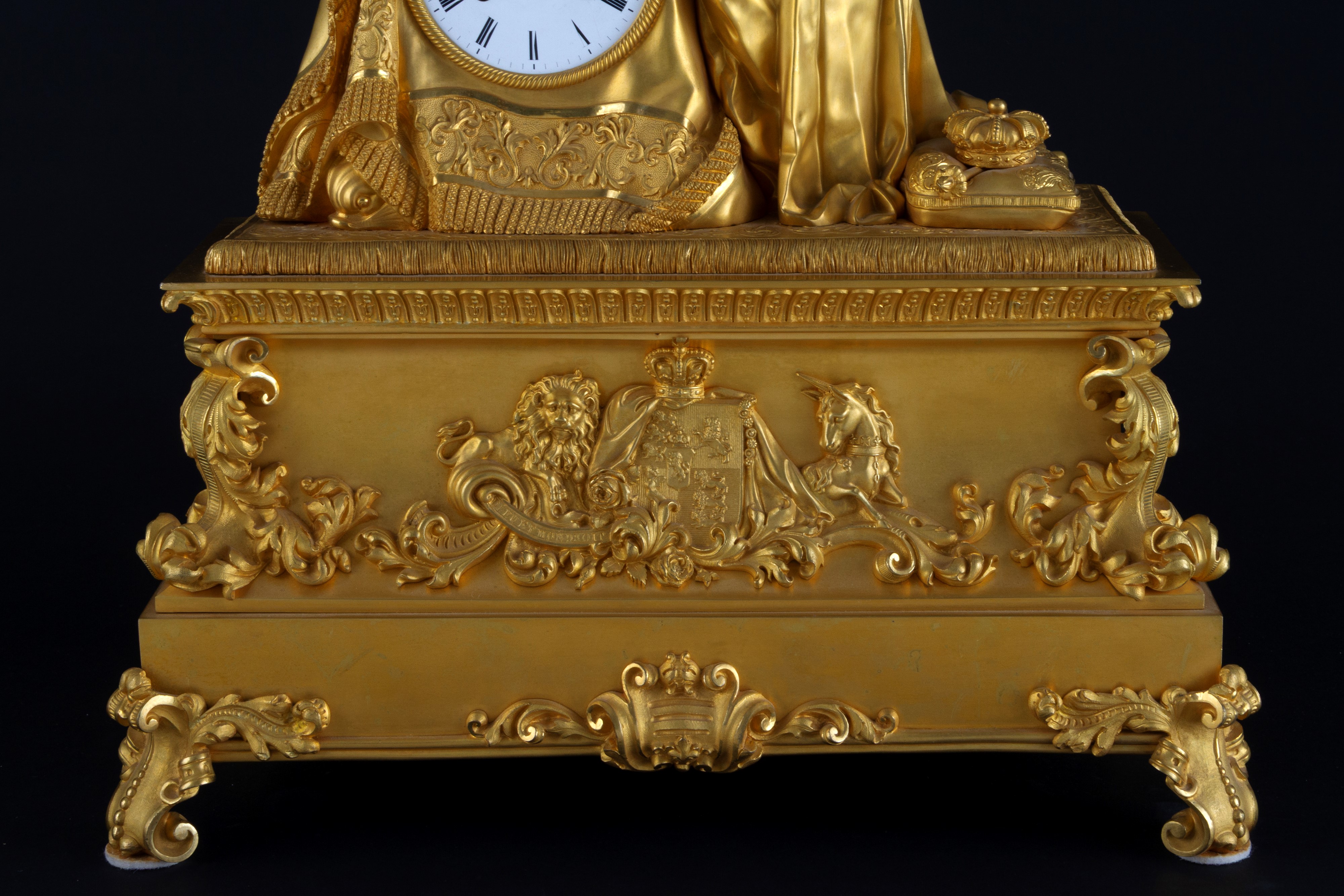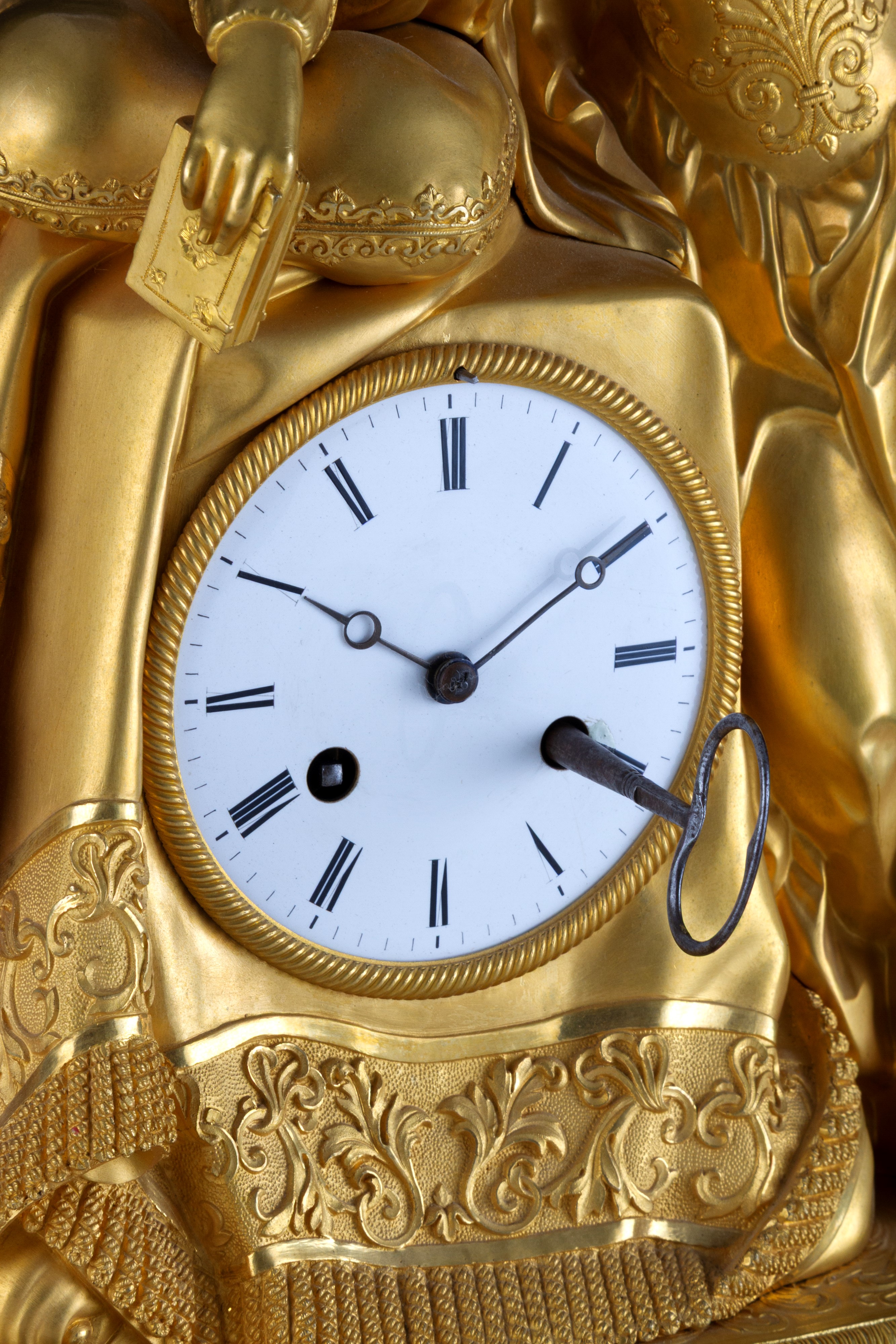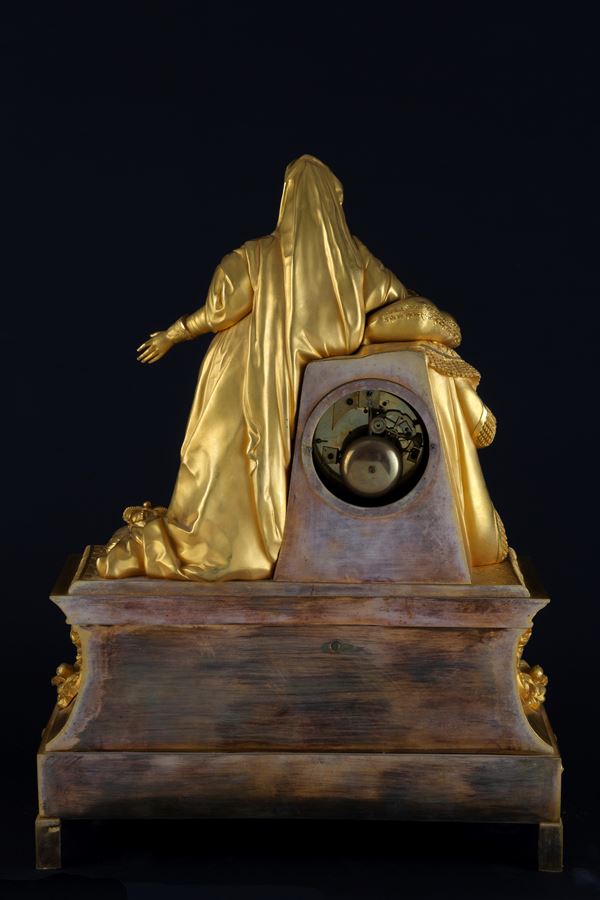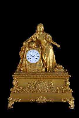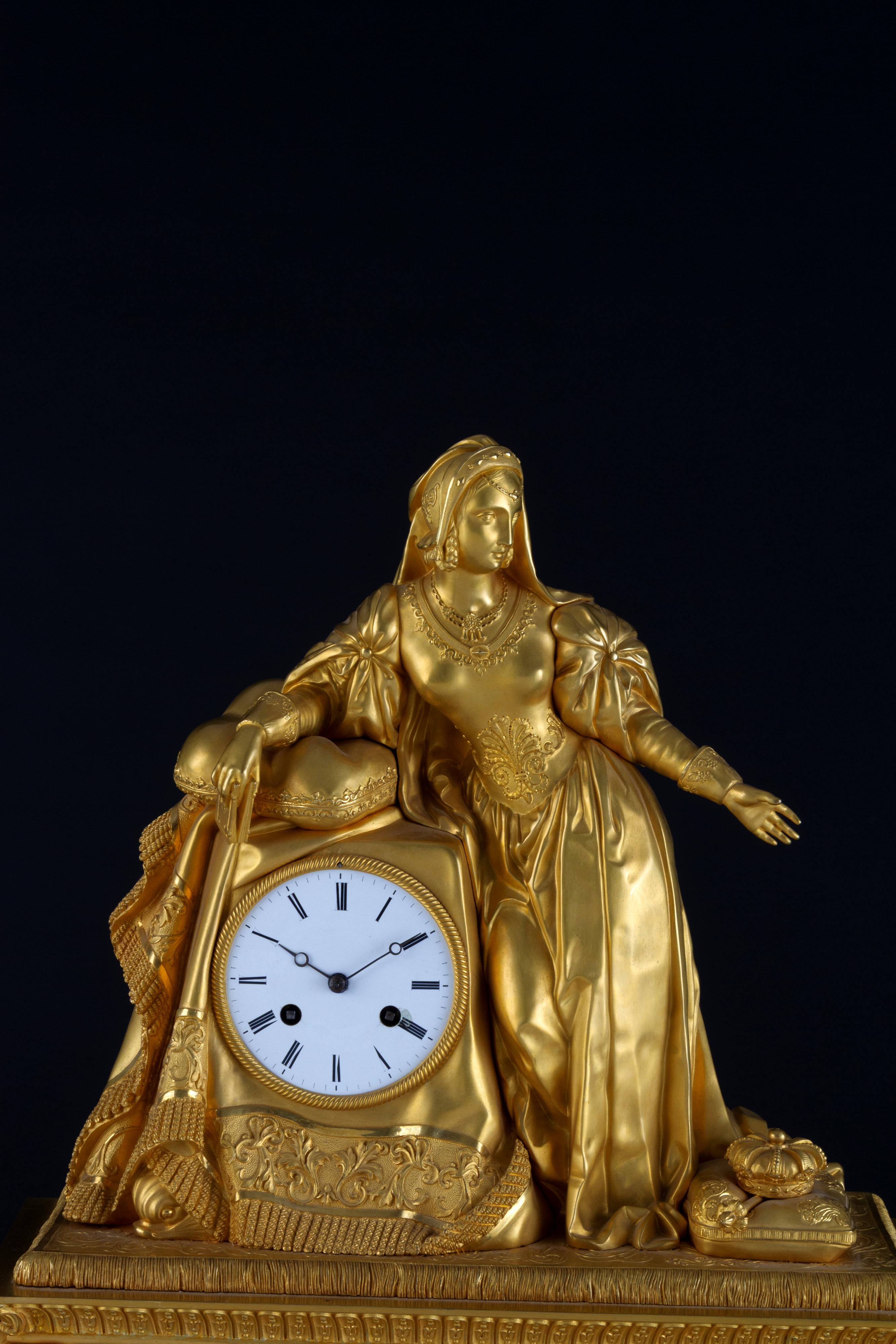 Gilded bronze and finely chiseled metal clock depicting "LADY". White enamel dial with Roman numerals. 19th century.