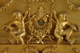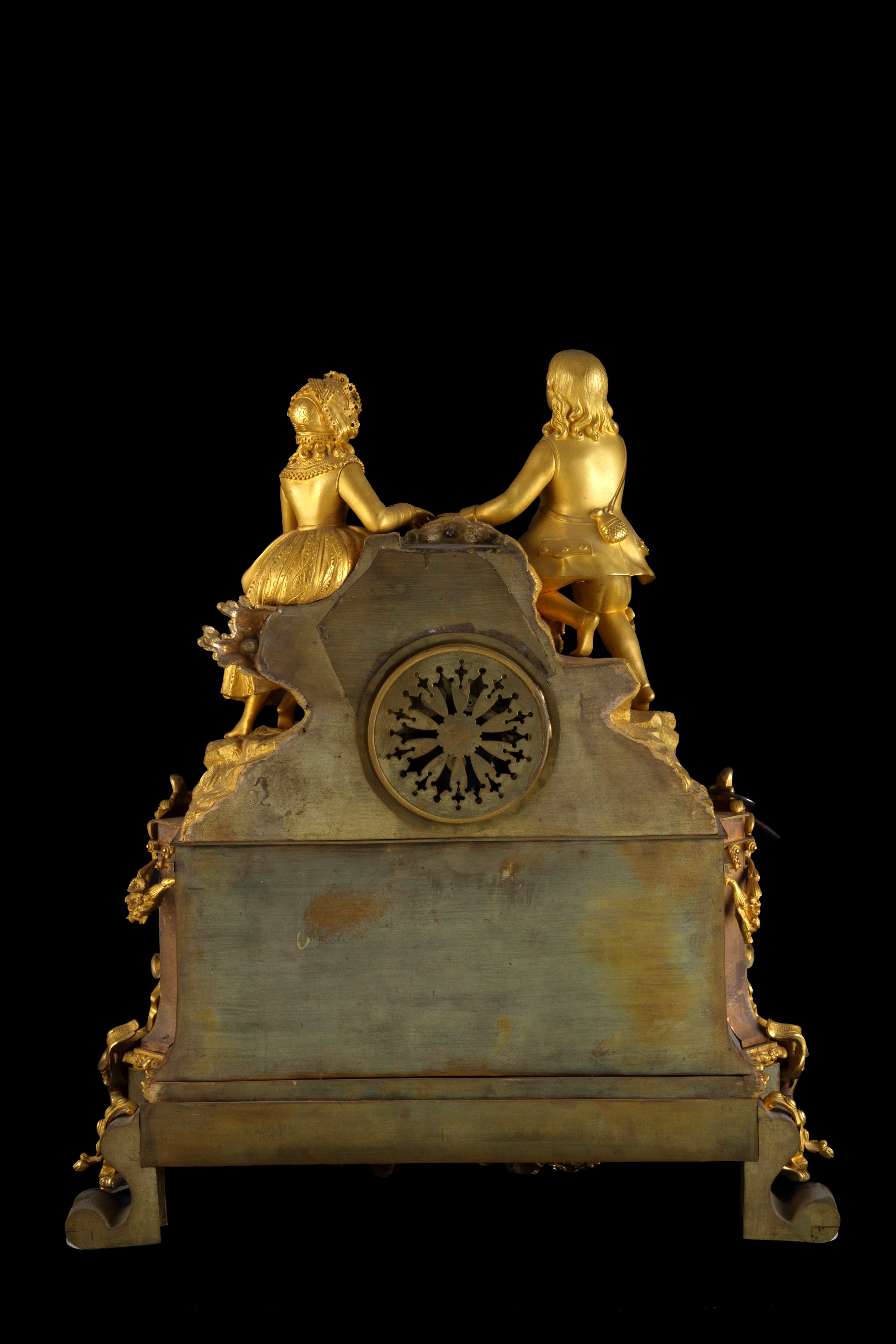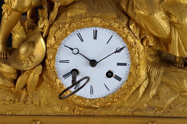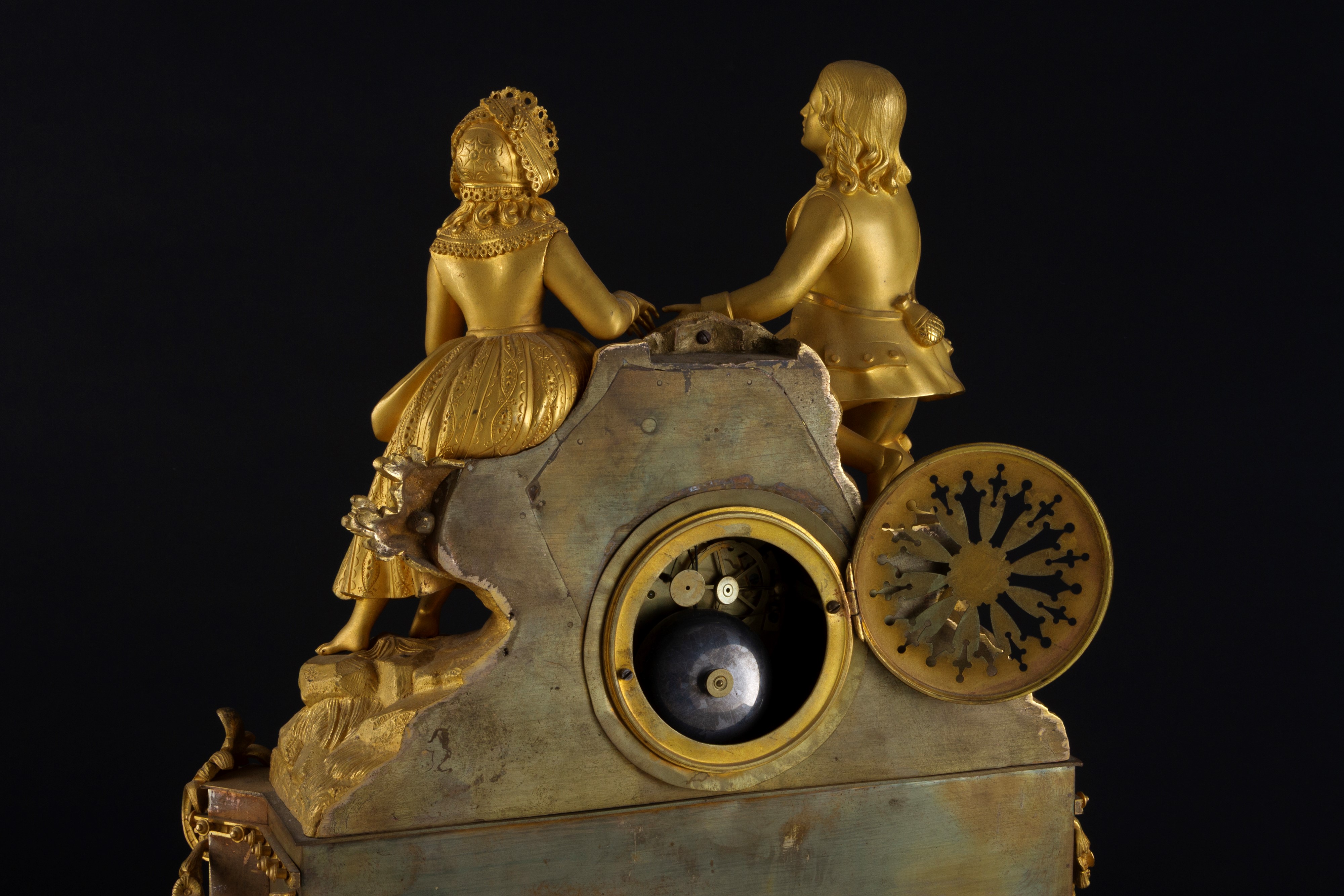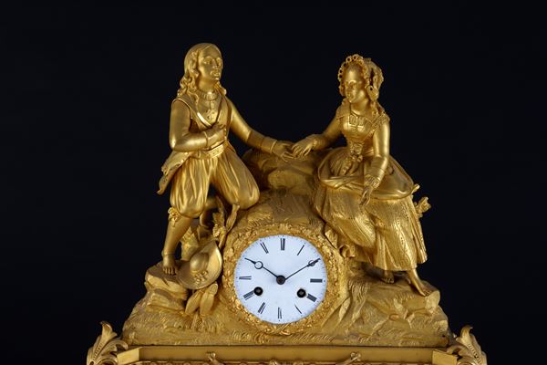 Finely chiseled gilded bronze clock depicting "ROMANTIC SCENE". 19th century.