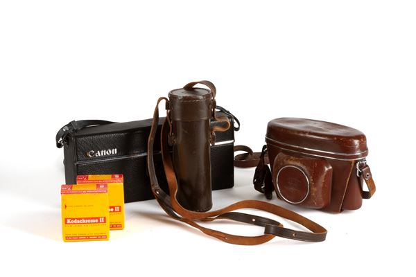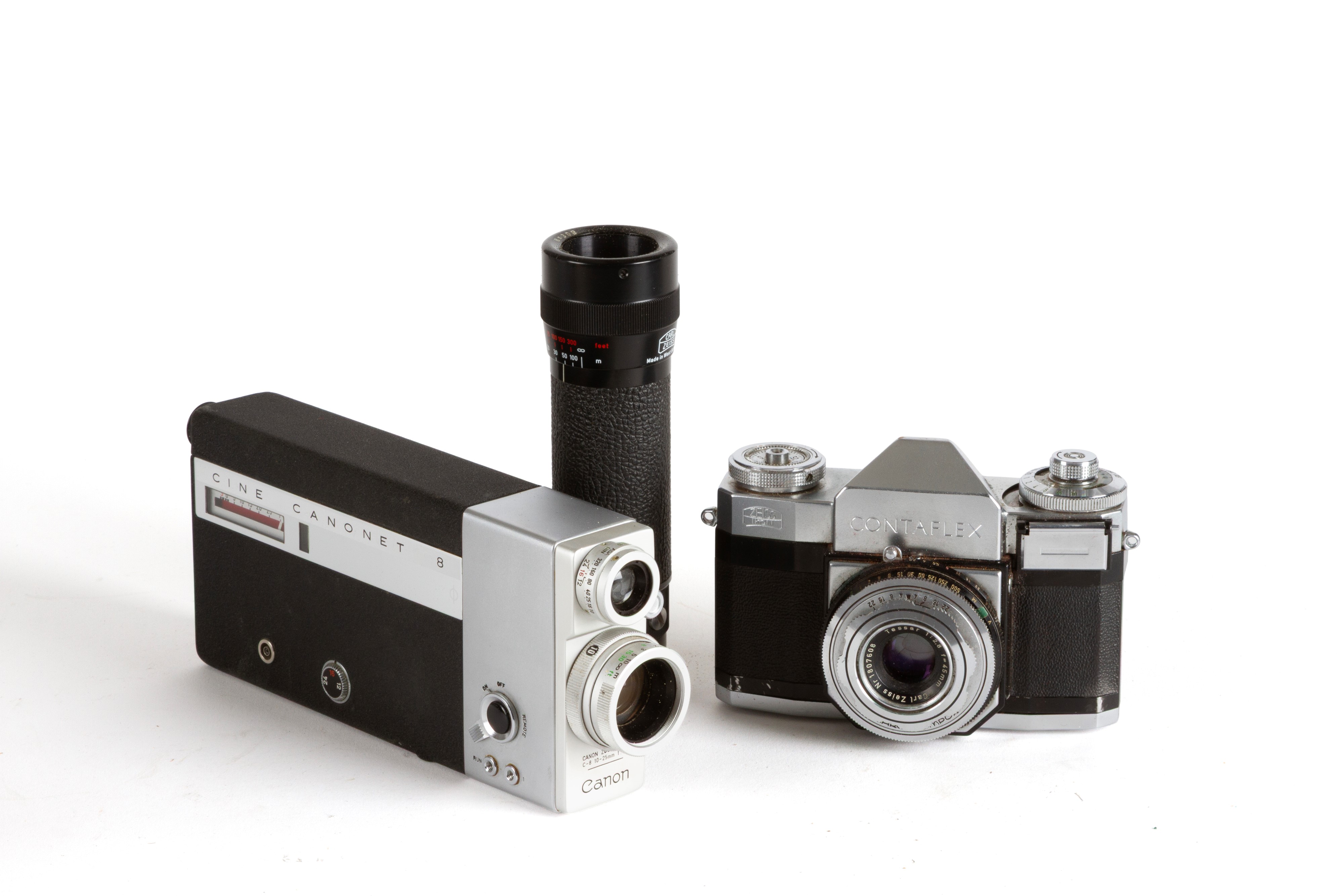 Lot composed of a Zeiss Ikon Contaflex camera, a Canon movie camera, a Carl Zeiss spotting scope, and two boxes of 8mm Kodachrome II film. All in their original cases.