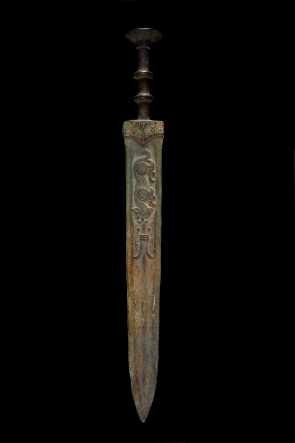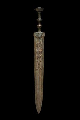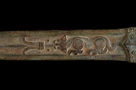 A chiseled bronze short sword with tigers in relief near the hilt. China.