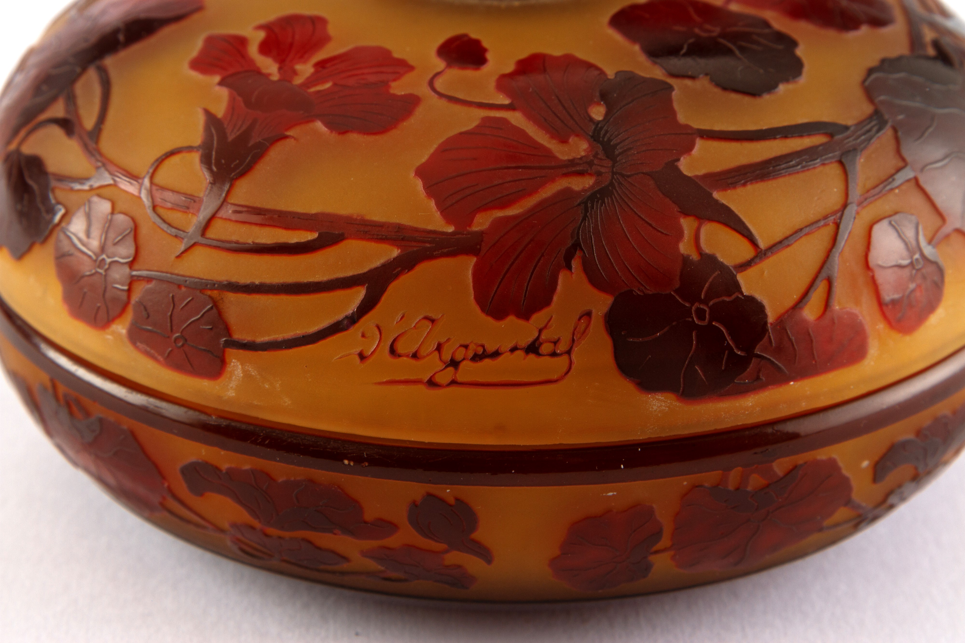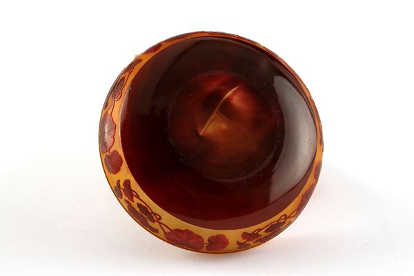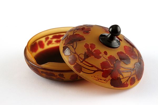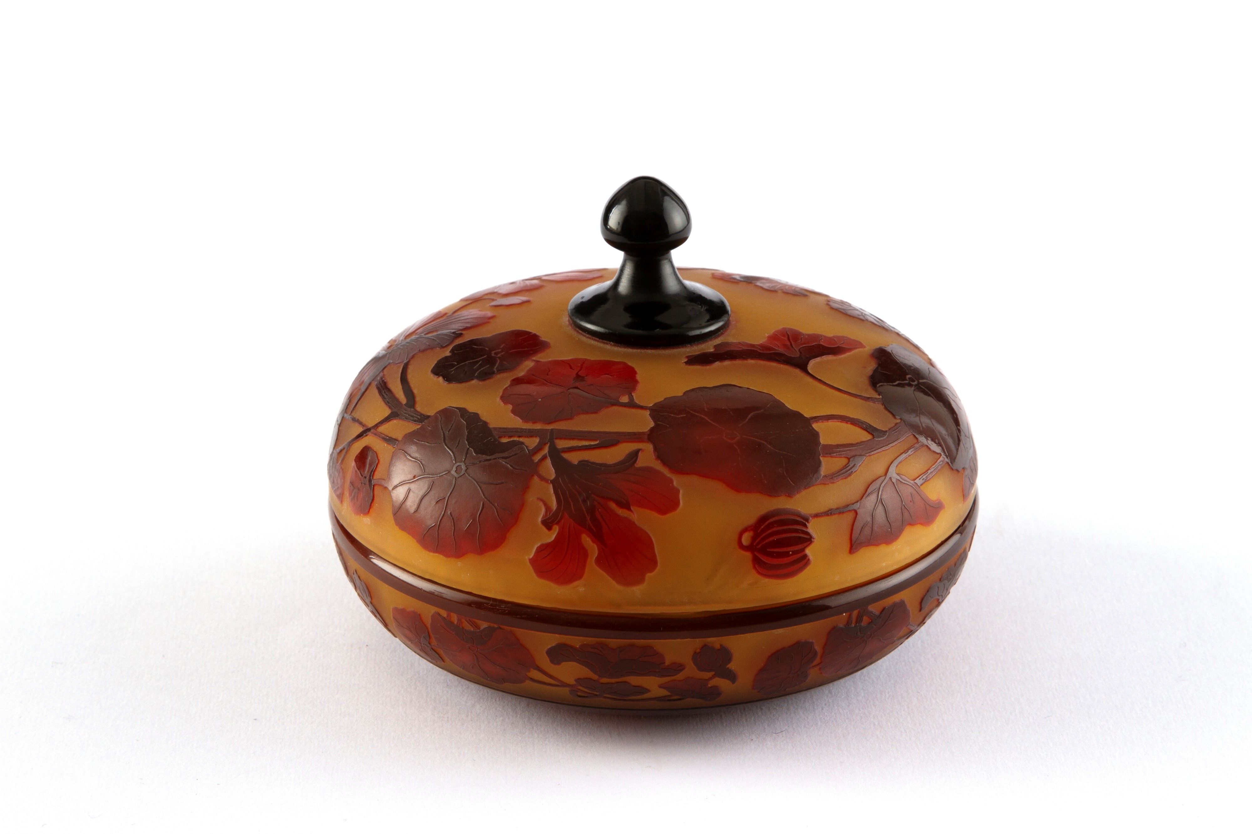 Glass jar with a floral decoration and lid. Signed on the lid. Signs of wear.