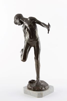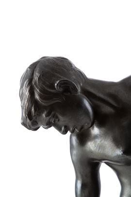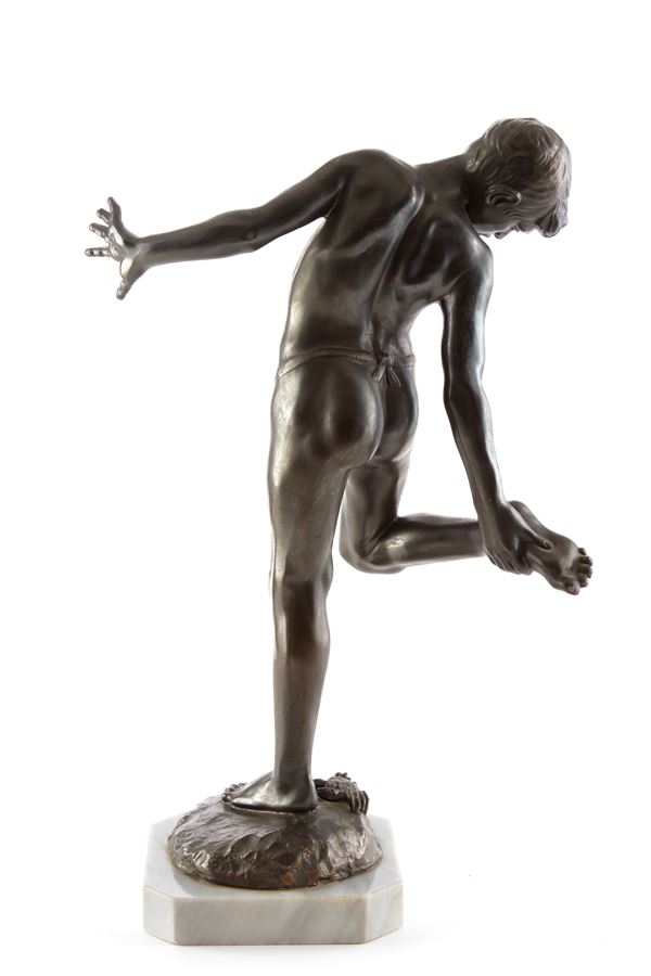 Bronze sculpture depicting "BOY BITTEN BY A CRAB". Gray marble base.
