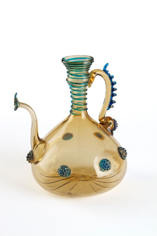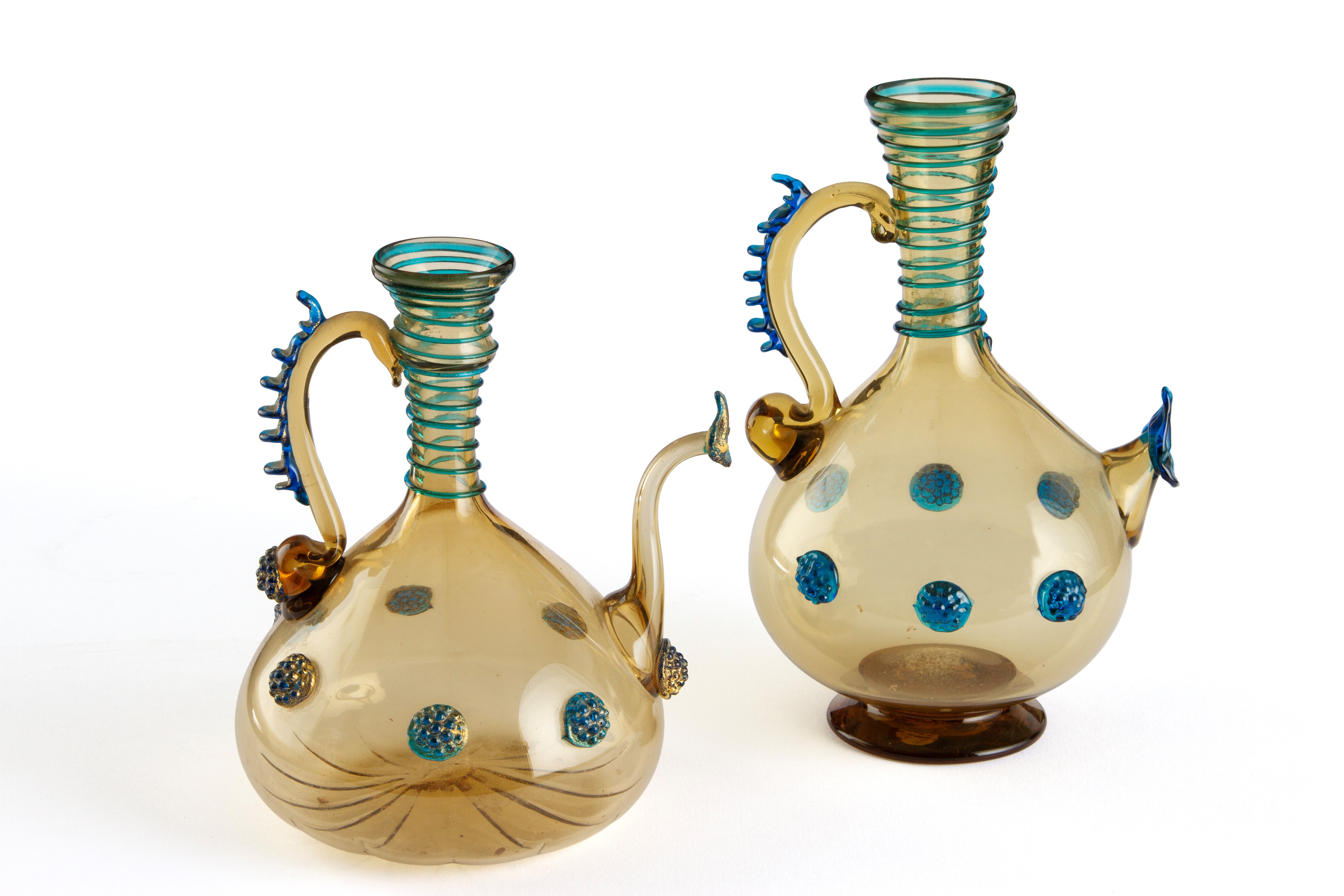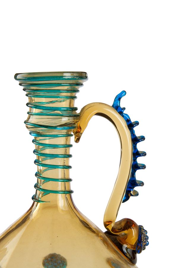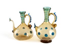 Two jugs in diluted glass in shades of ochre with decorative motifs in relief in green and blue glass paste.