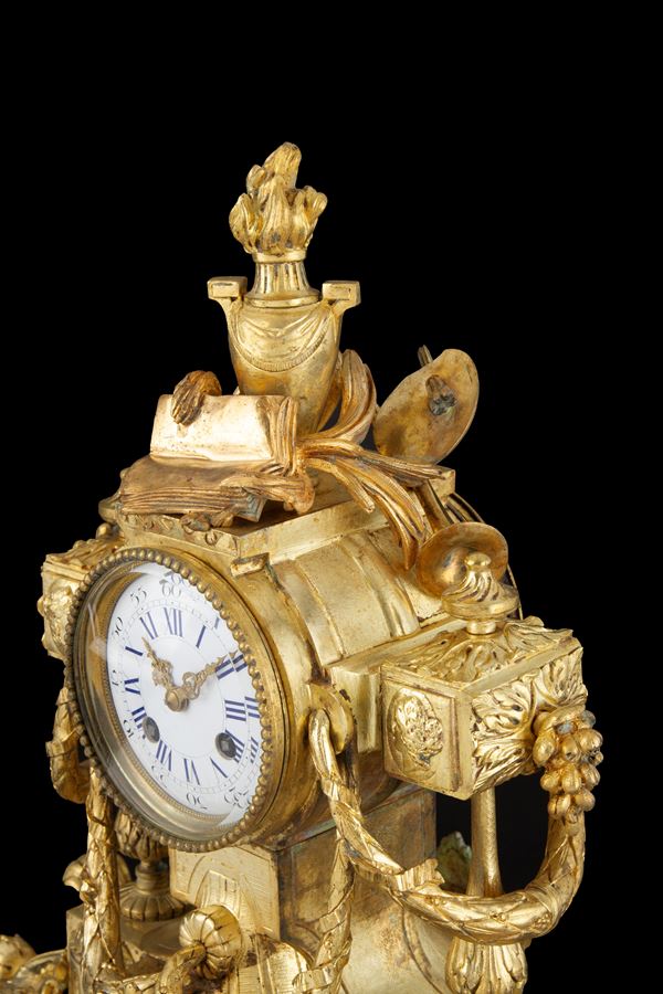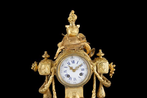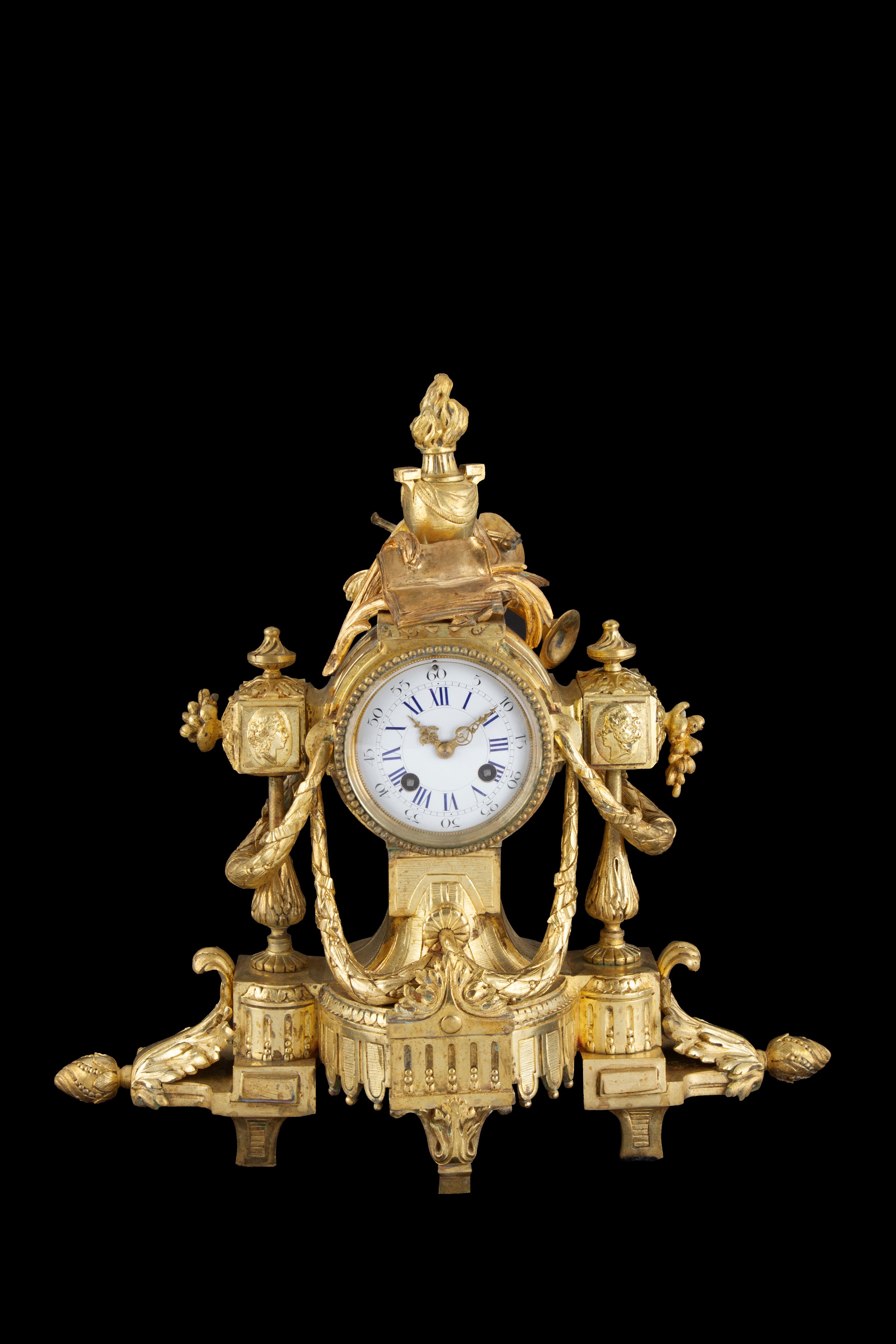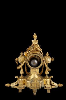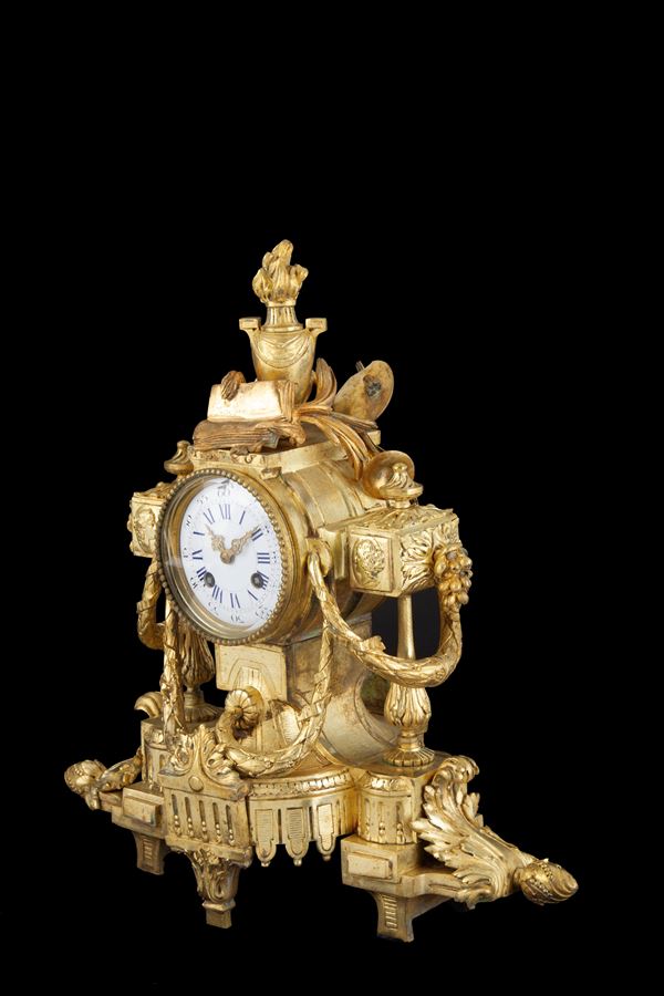 Gilded bronze clock decorated with Rococo motifs and garlands. White enamel dial with Arabic and Roman numerals. Louis XV period. Minor defects.