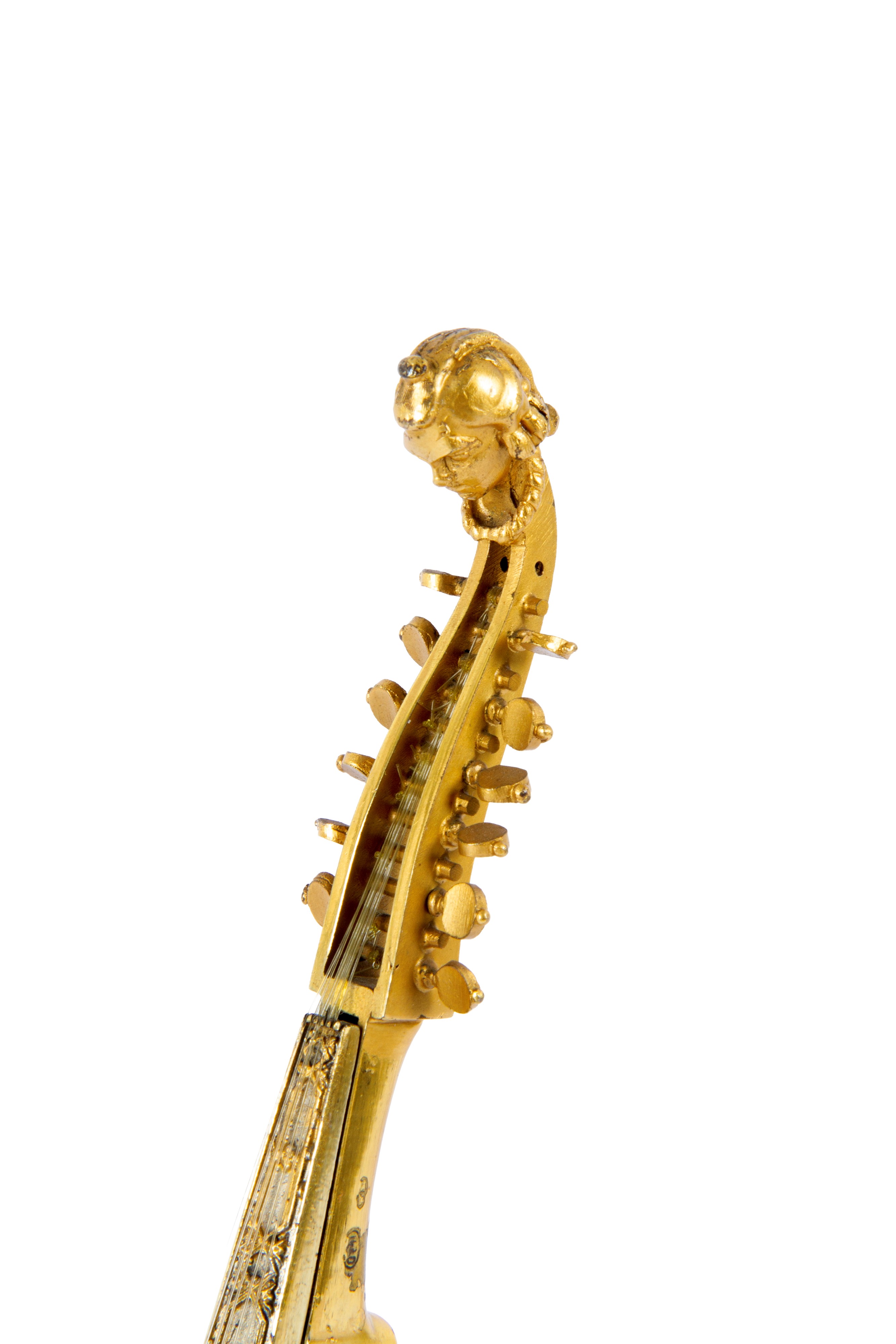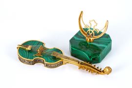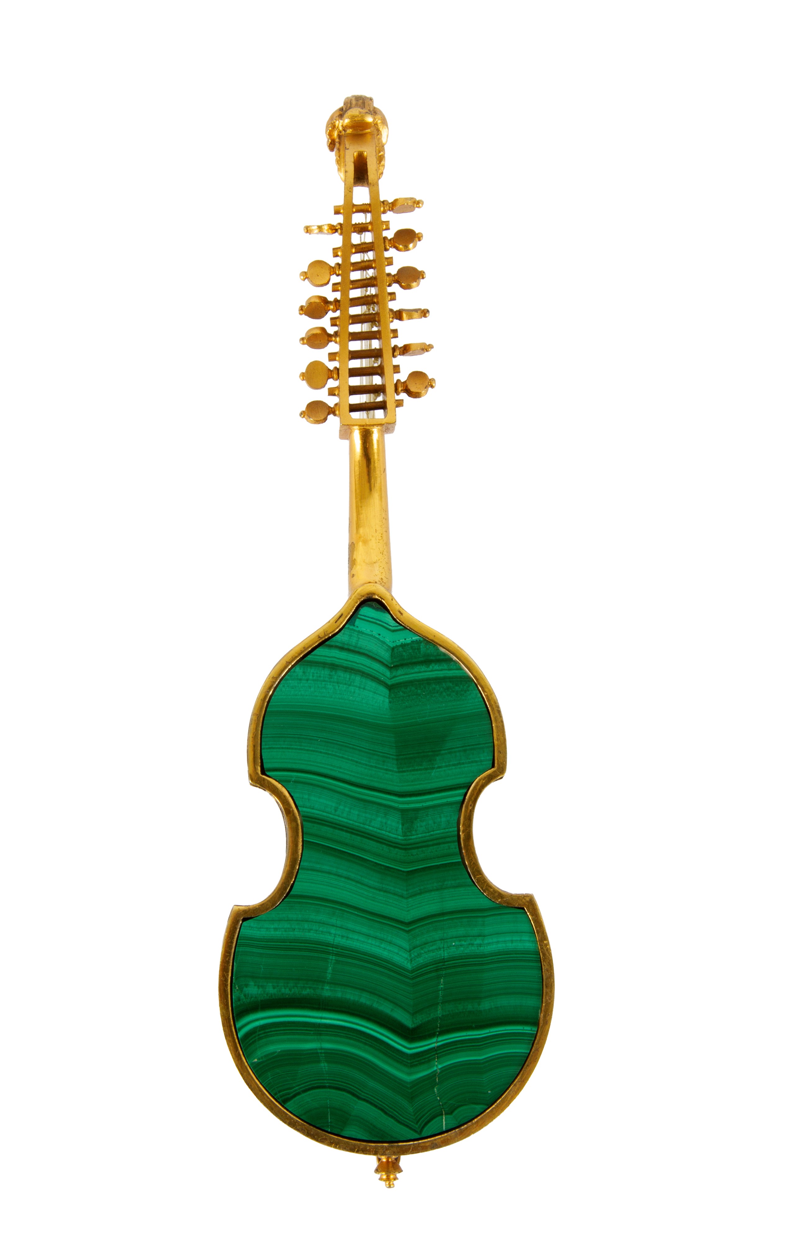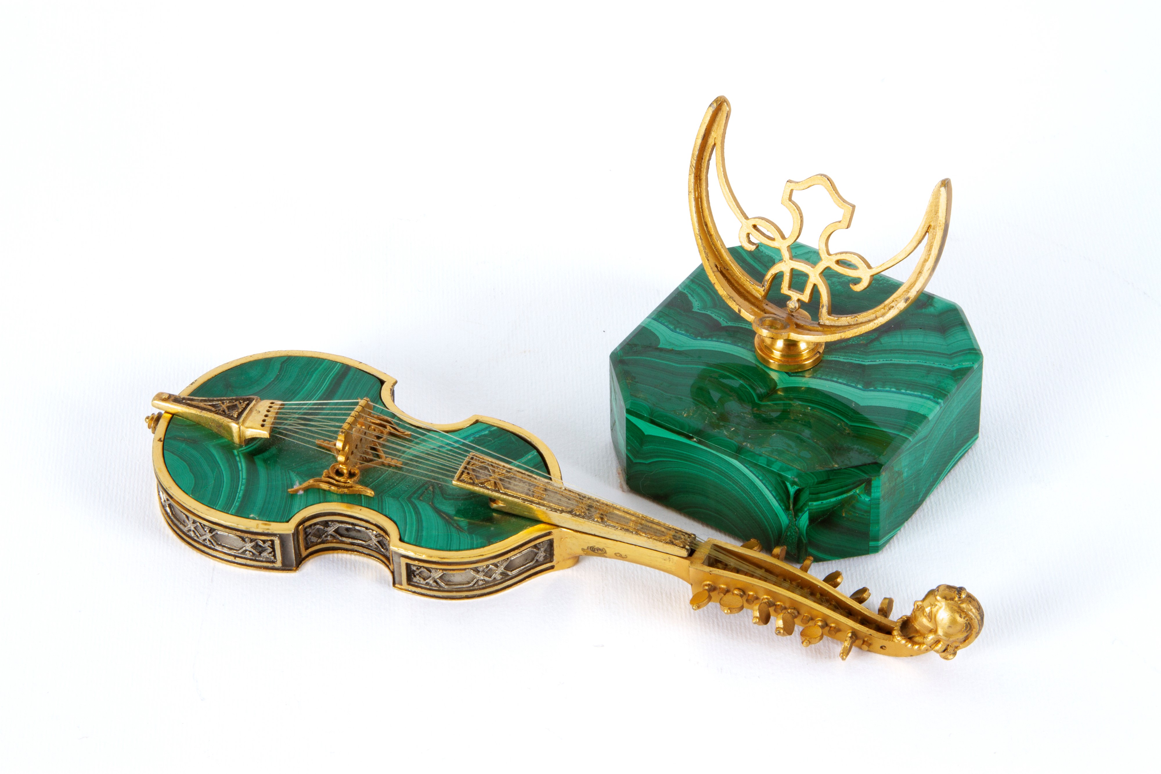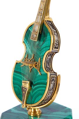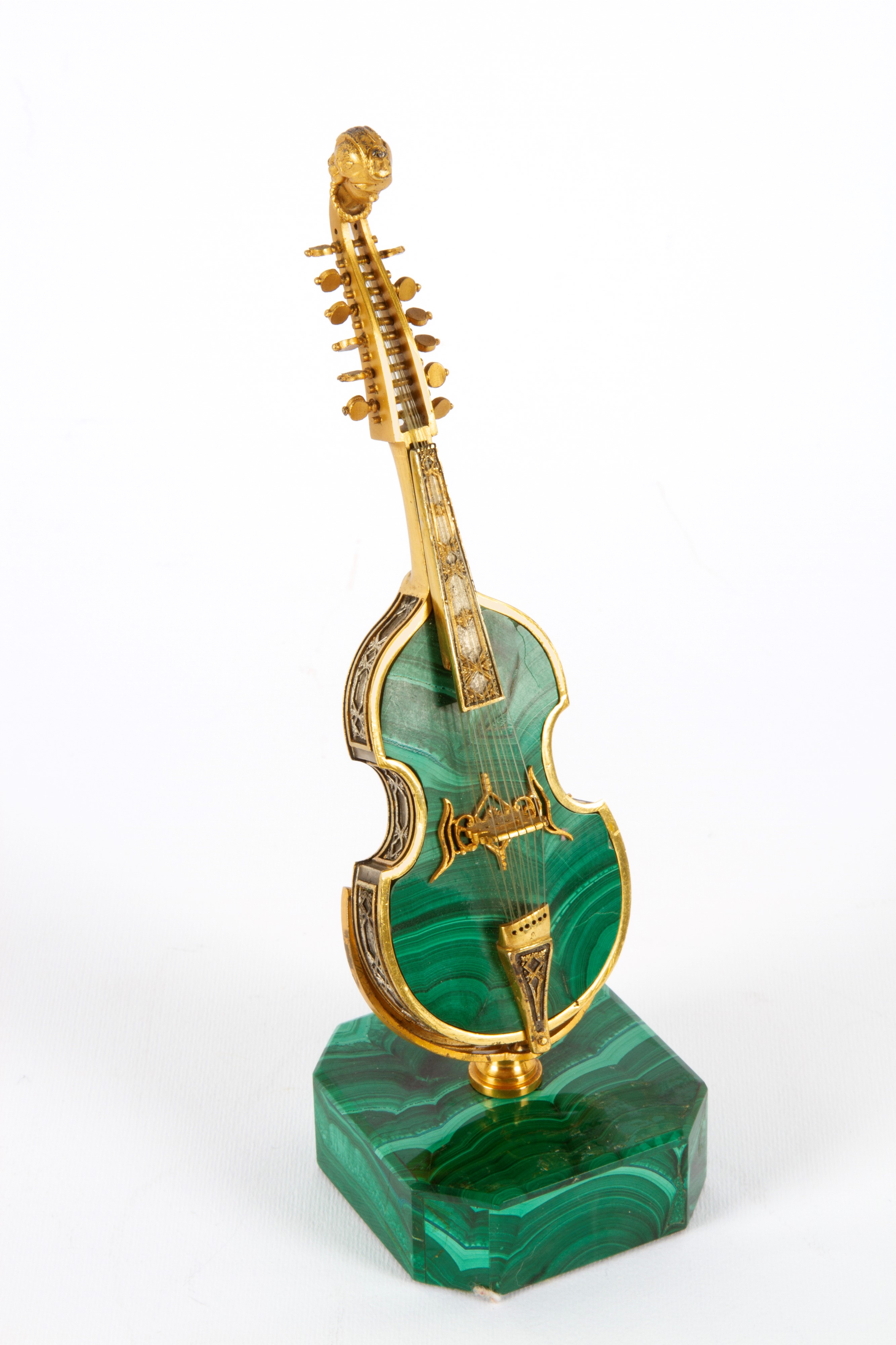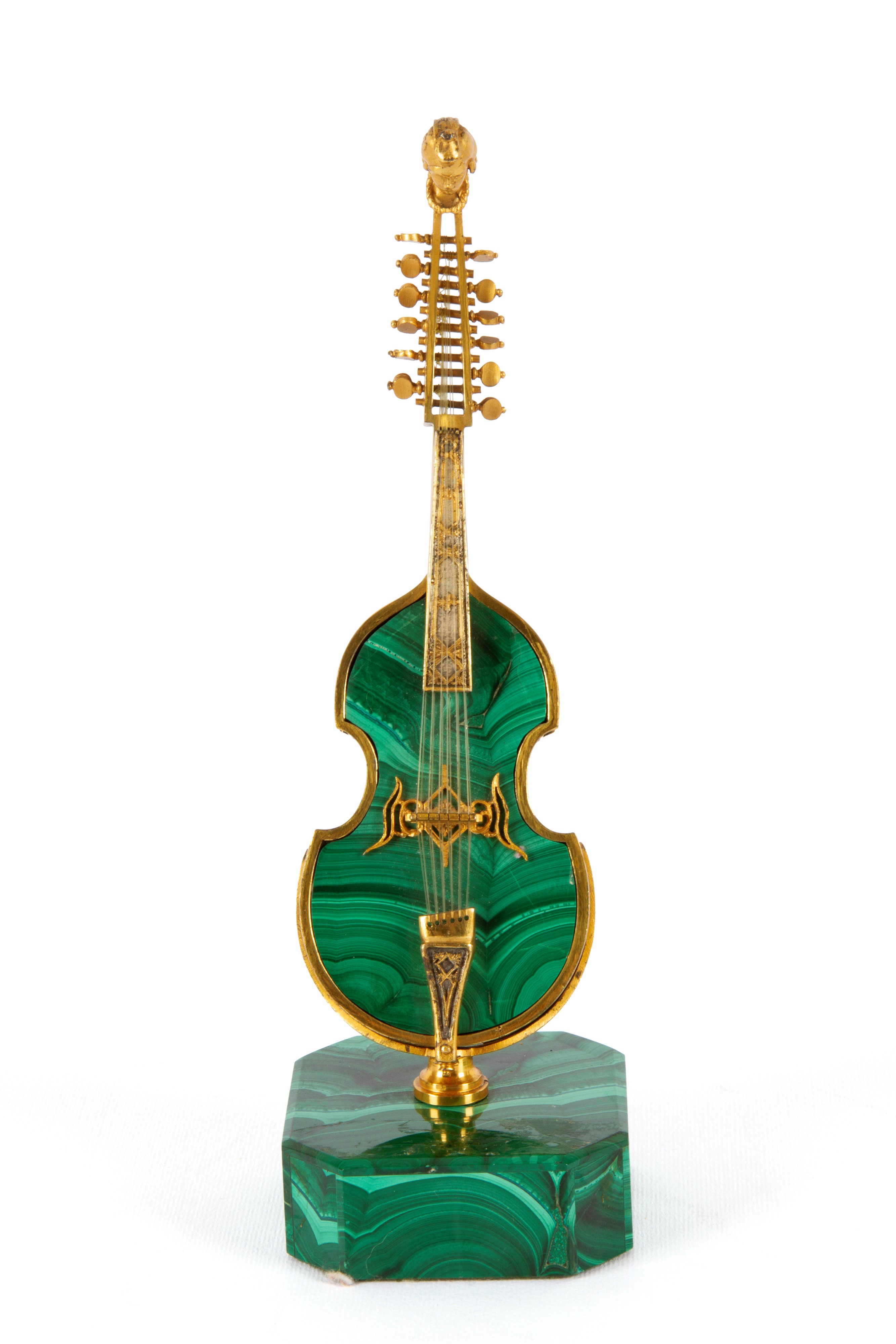 Model of a viola da gamba in malachite and finely chiseled and gilded silver. Malachite base. 20th century.
