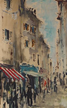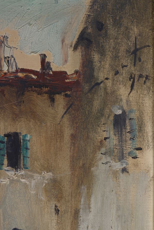 Oil painting on canvas depicting "CITY VIEW." Signed upper right. Framed. Defects.
