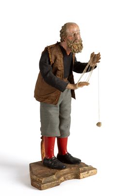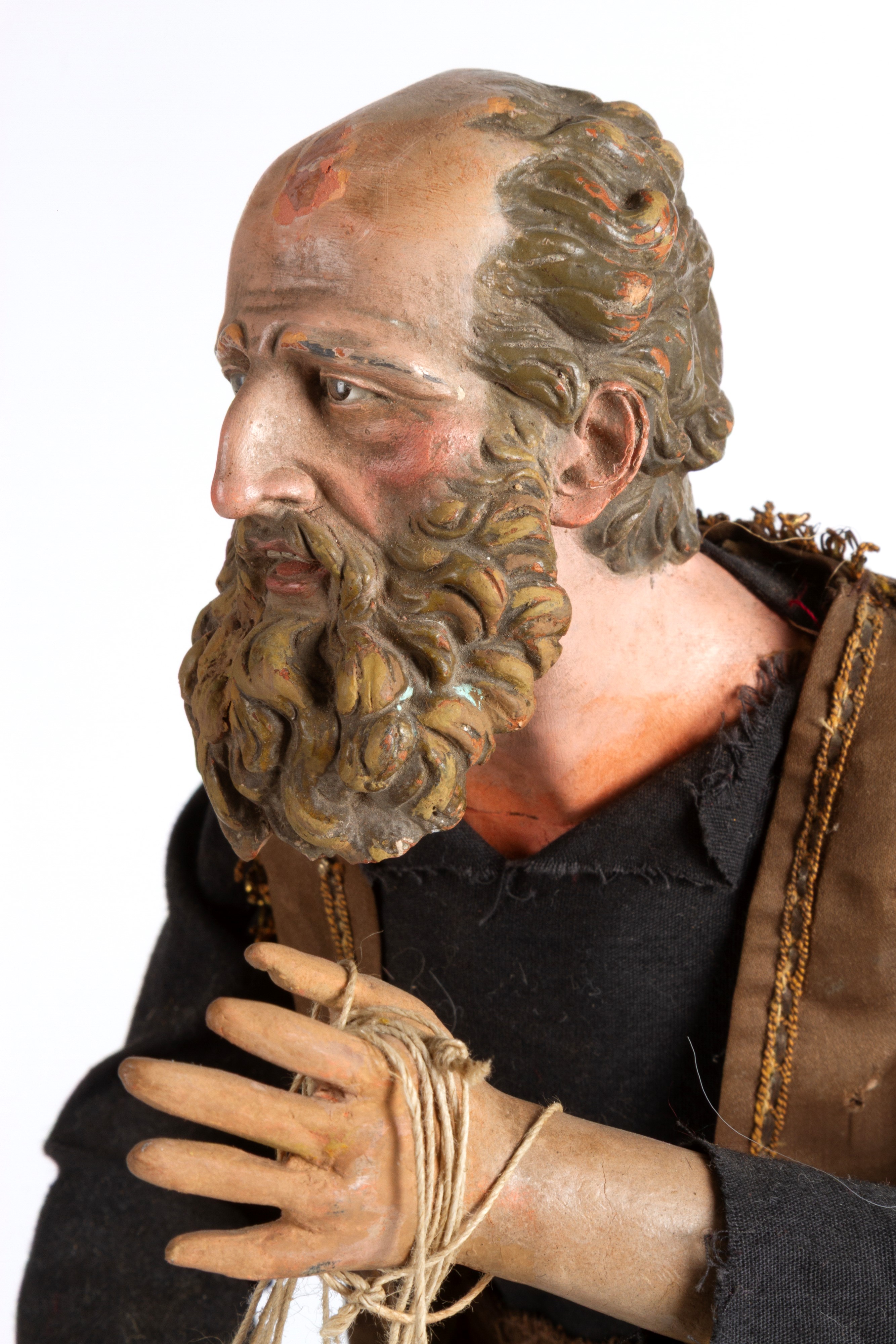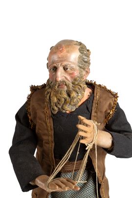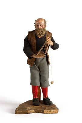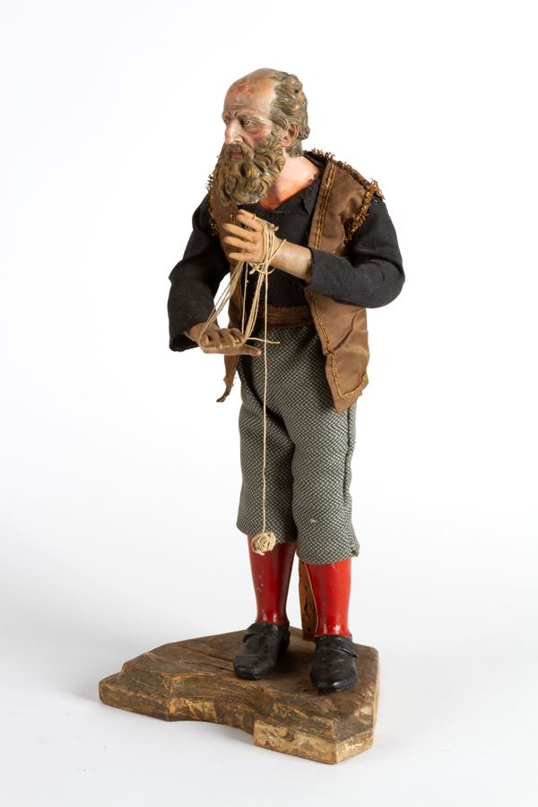 Nativity scene statue with painted terracotta head and hands depicting "CRAFTSMAN". Wooden base. Naples. 19th century. Minor defects.
