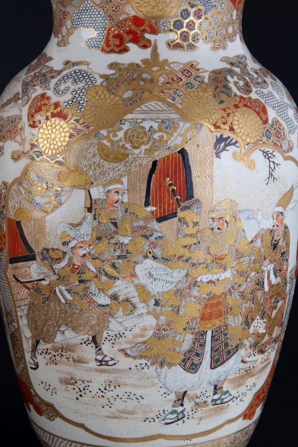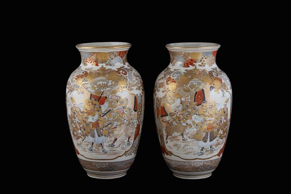 A pair of Satsuma porcelain vases decorated with scenes of oriental life within reserves. Japan. Meiji period. Minor defects on the rim.