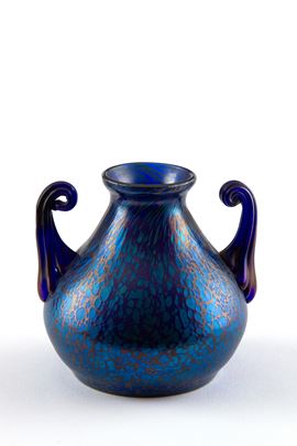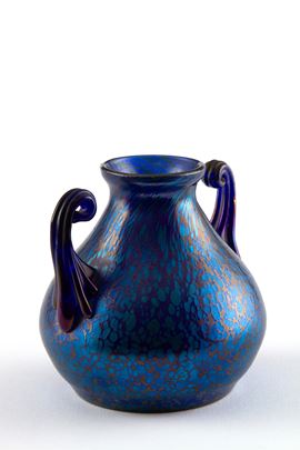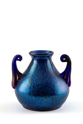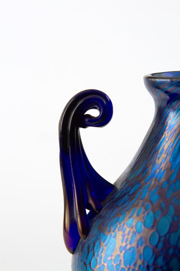 Papillon vase with iridescent glass handles in shades of blue. LOETZ manufacture.