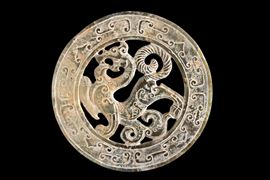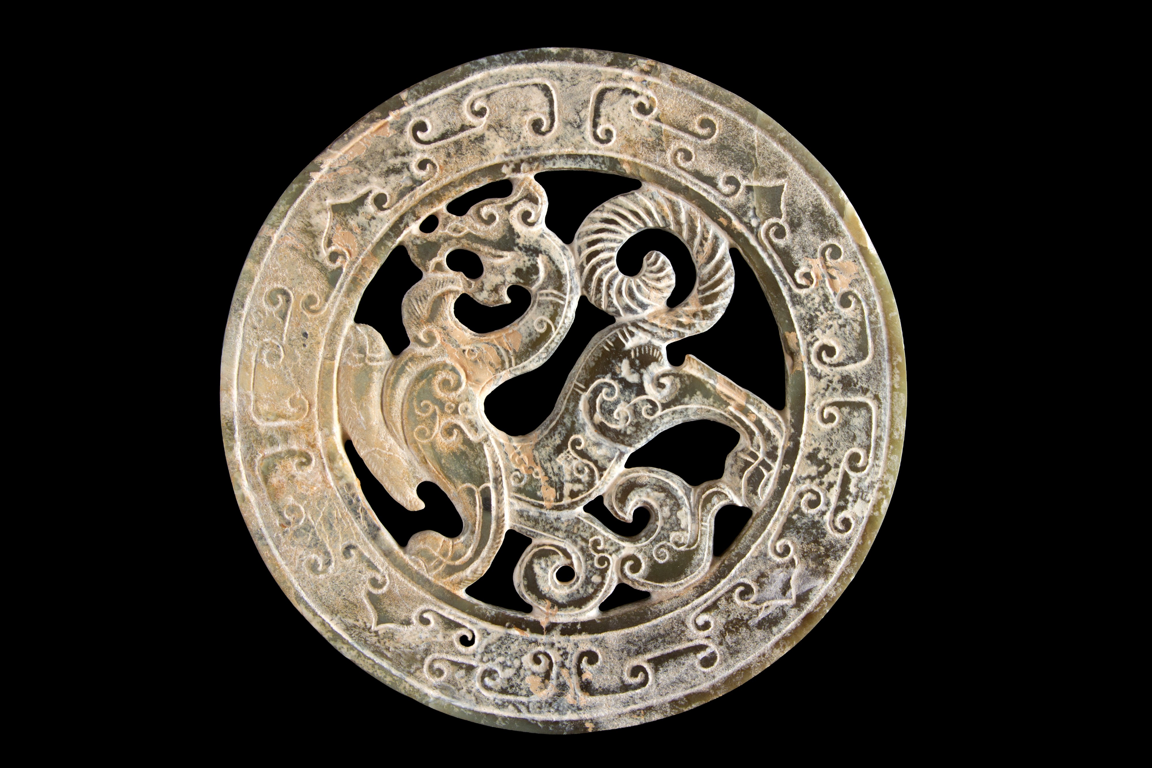 A carved and perforated jade disc depicting a "DRAGON." China.