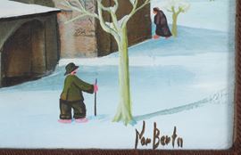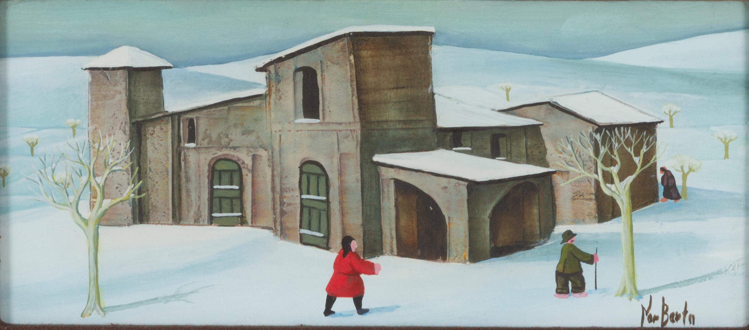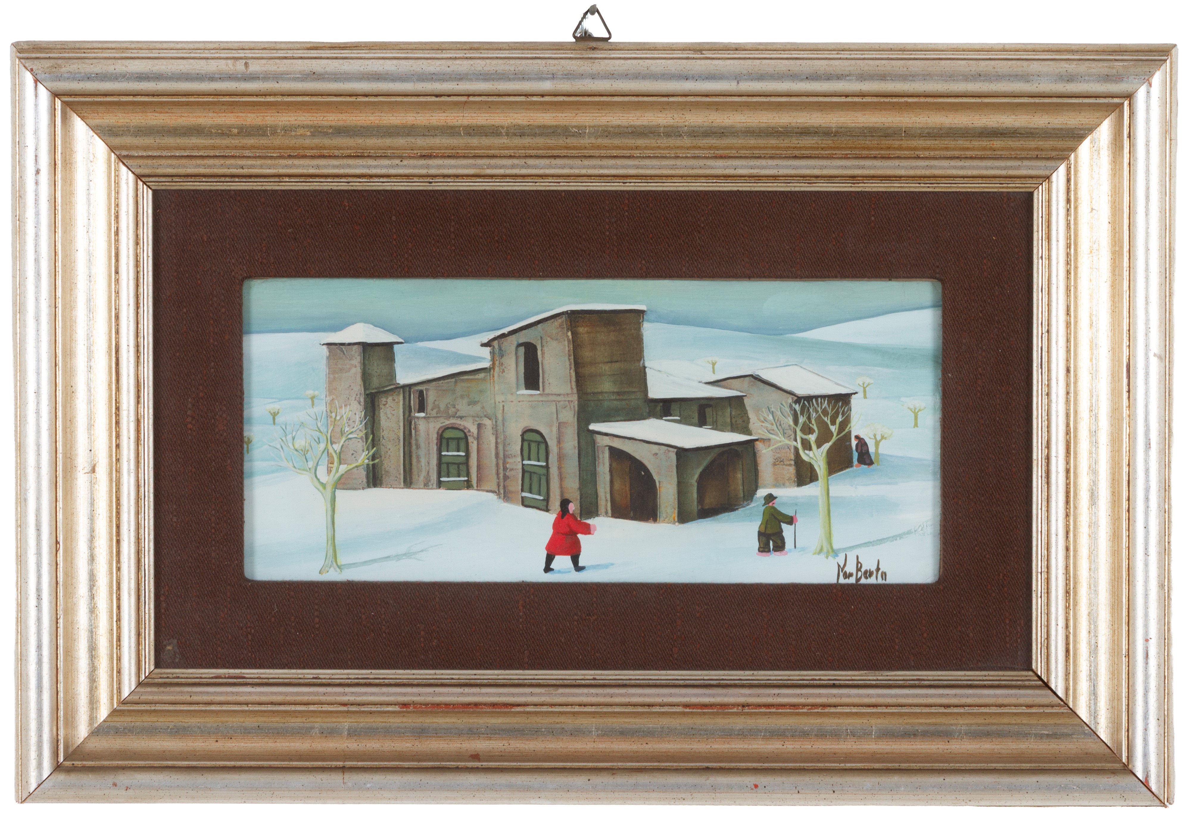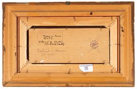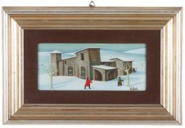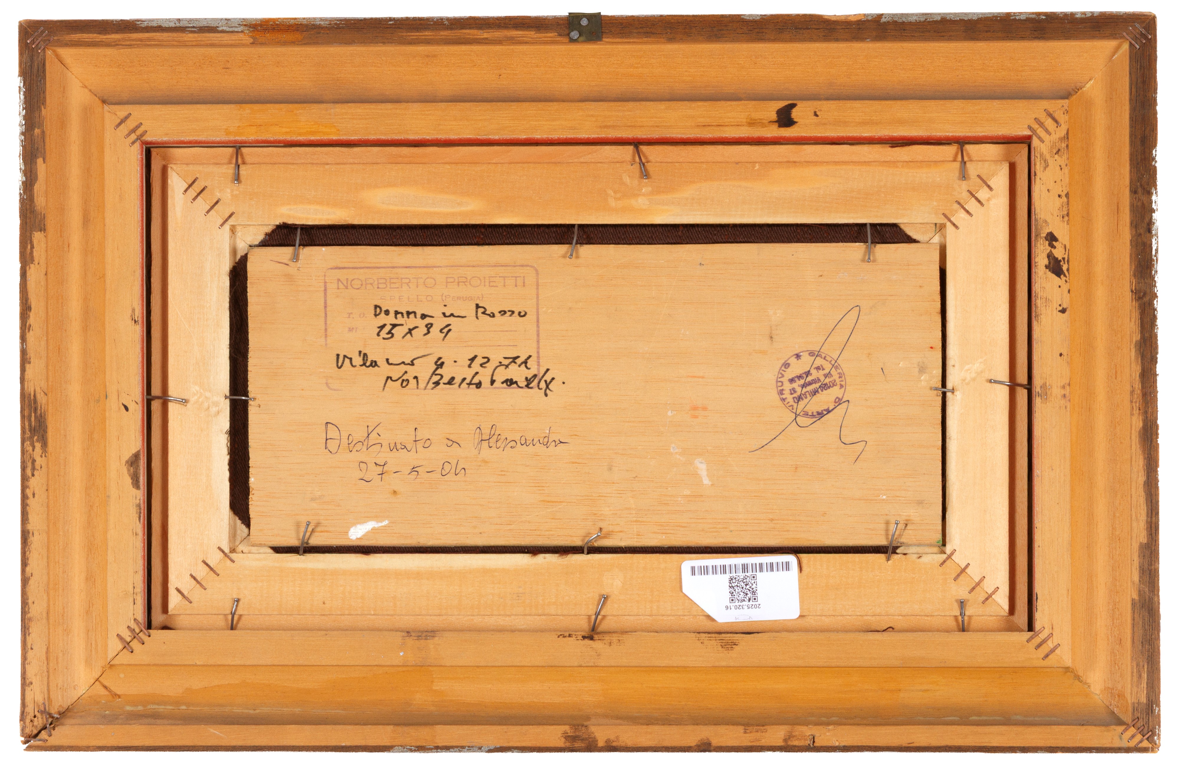 Oil painting on panel titled "WOMAN IN RED." Signed lower right. Titled, dated Milan, December 4, 1974, countersigned, and stamped by the artist and Galleria d'Arte Vitruvio, Milan, on the reverse. Framed.