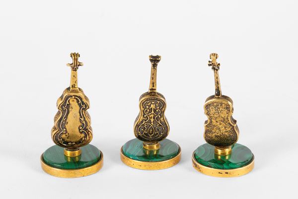 Three models of musical instruments in malachite and finely chiseled and gilded silver. 20th century. Minor defects.