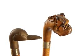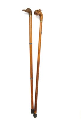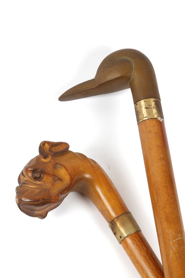 Two beech canes with handles shaped like a boxer's face and a duck's face. 20th century. Defects.