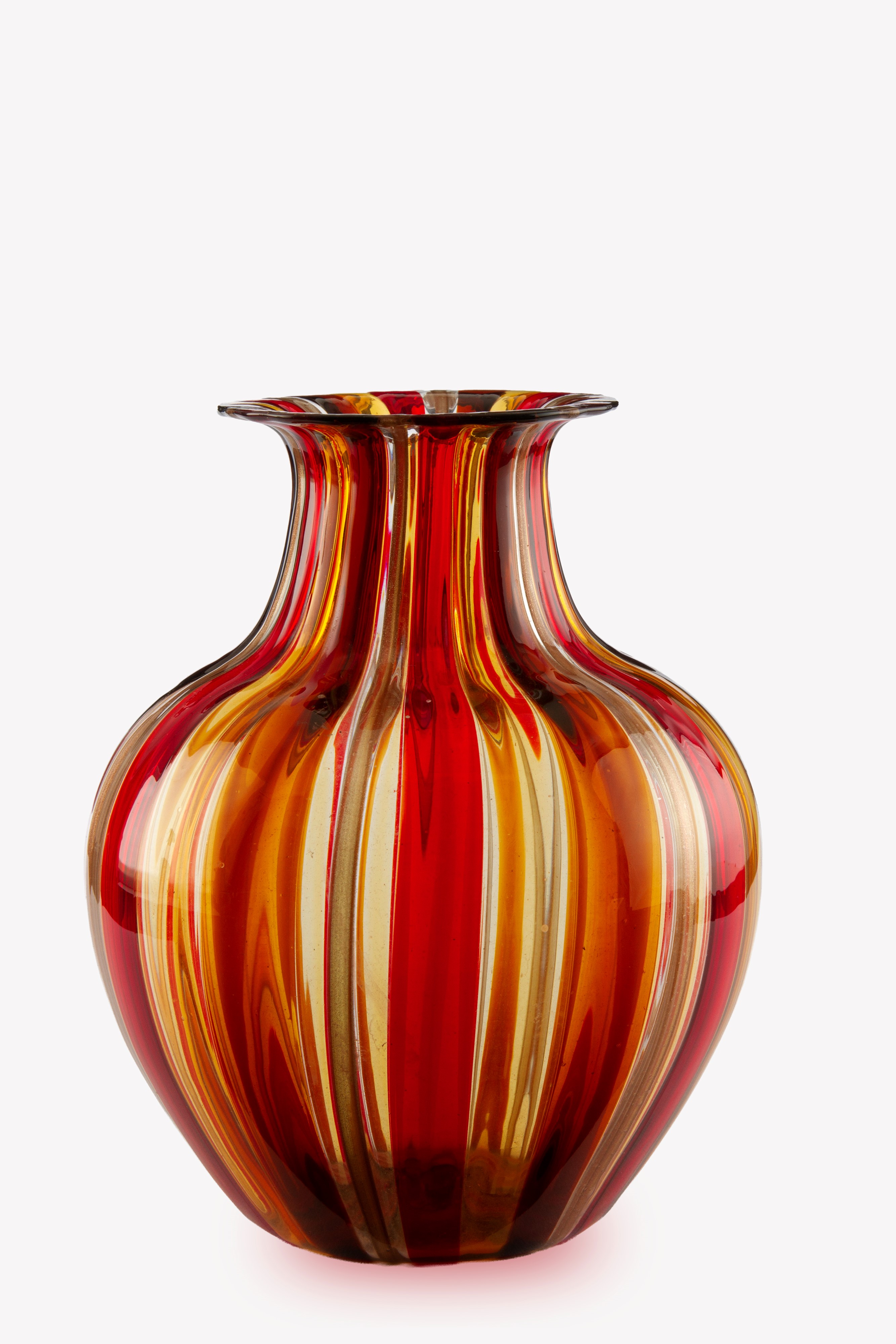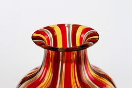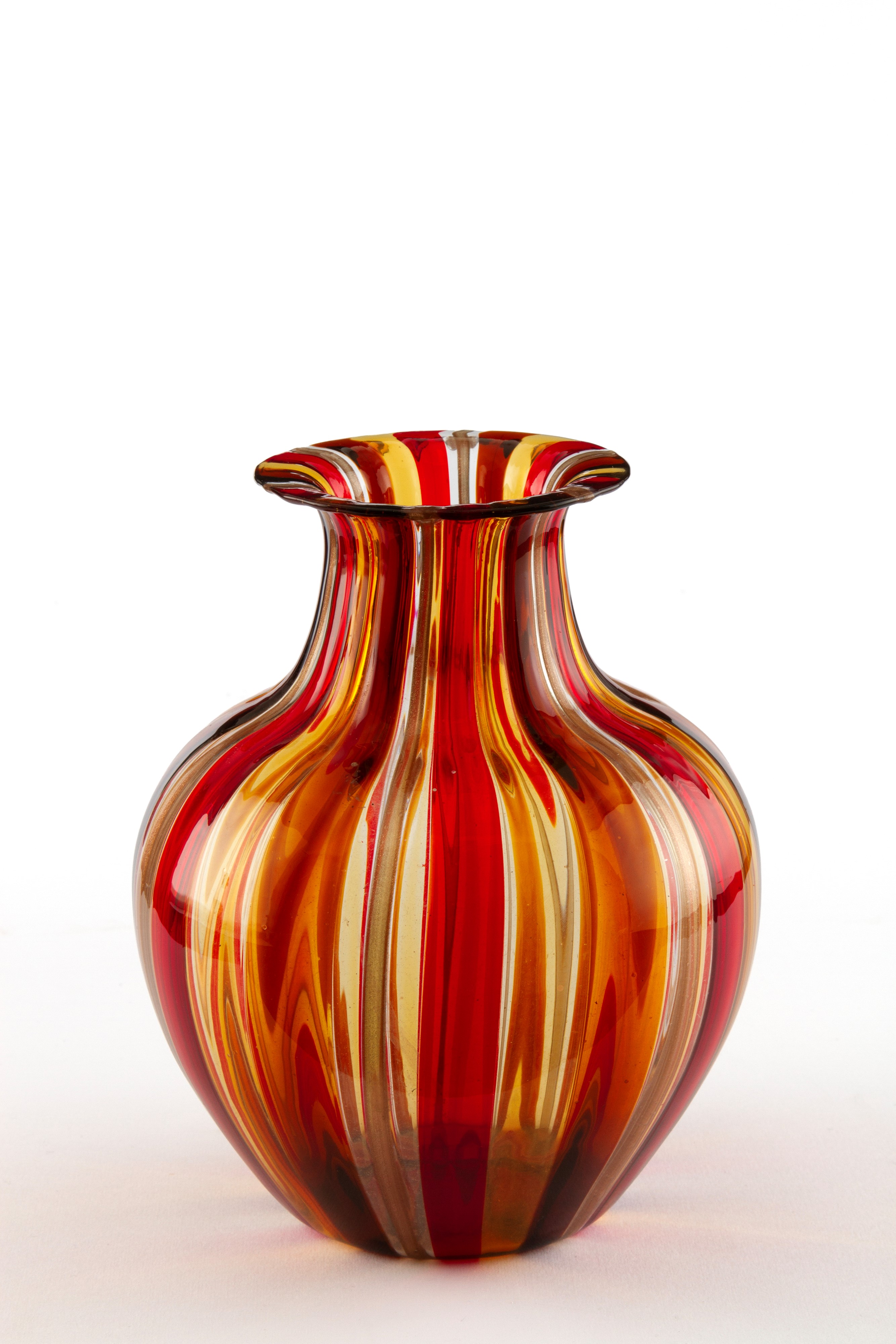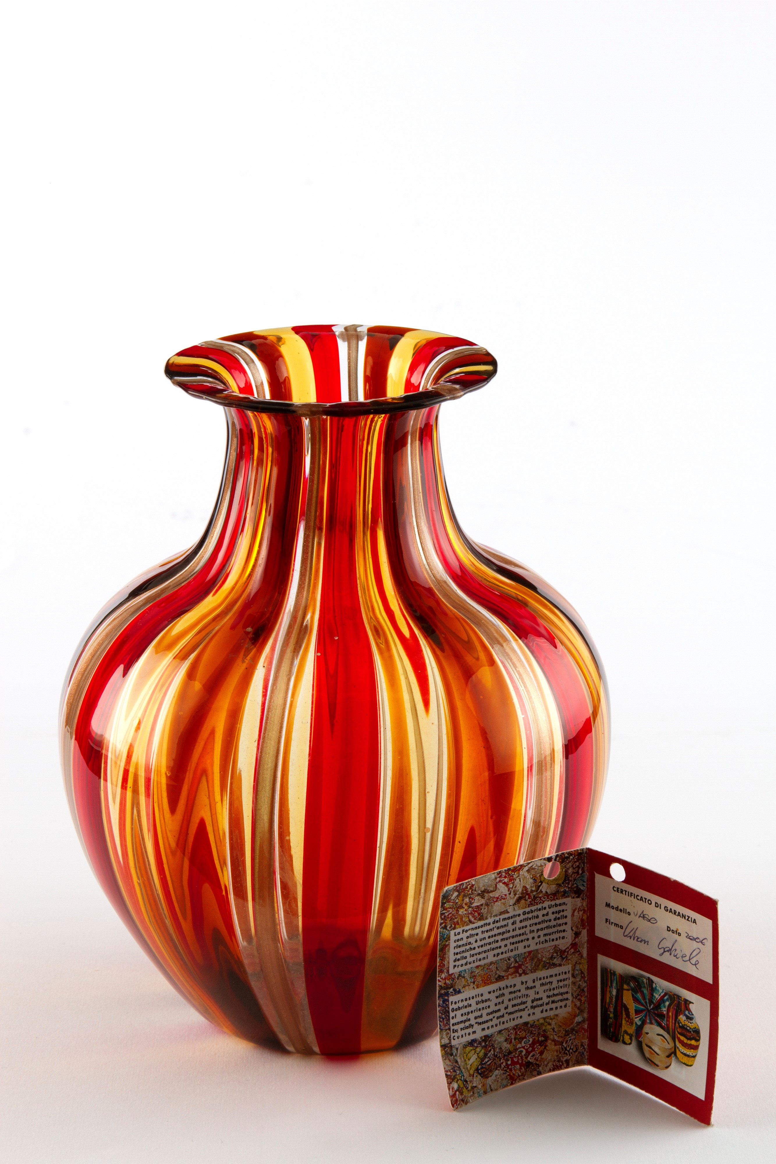 Red, yellow, and ochre striped glass vase. With a certificate of guarantee.