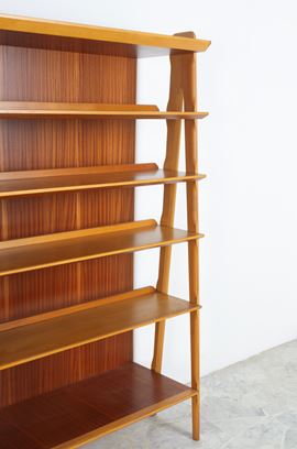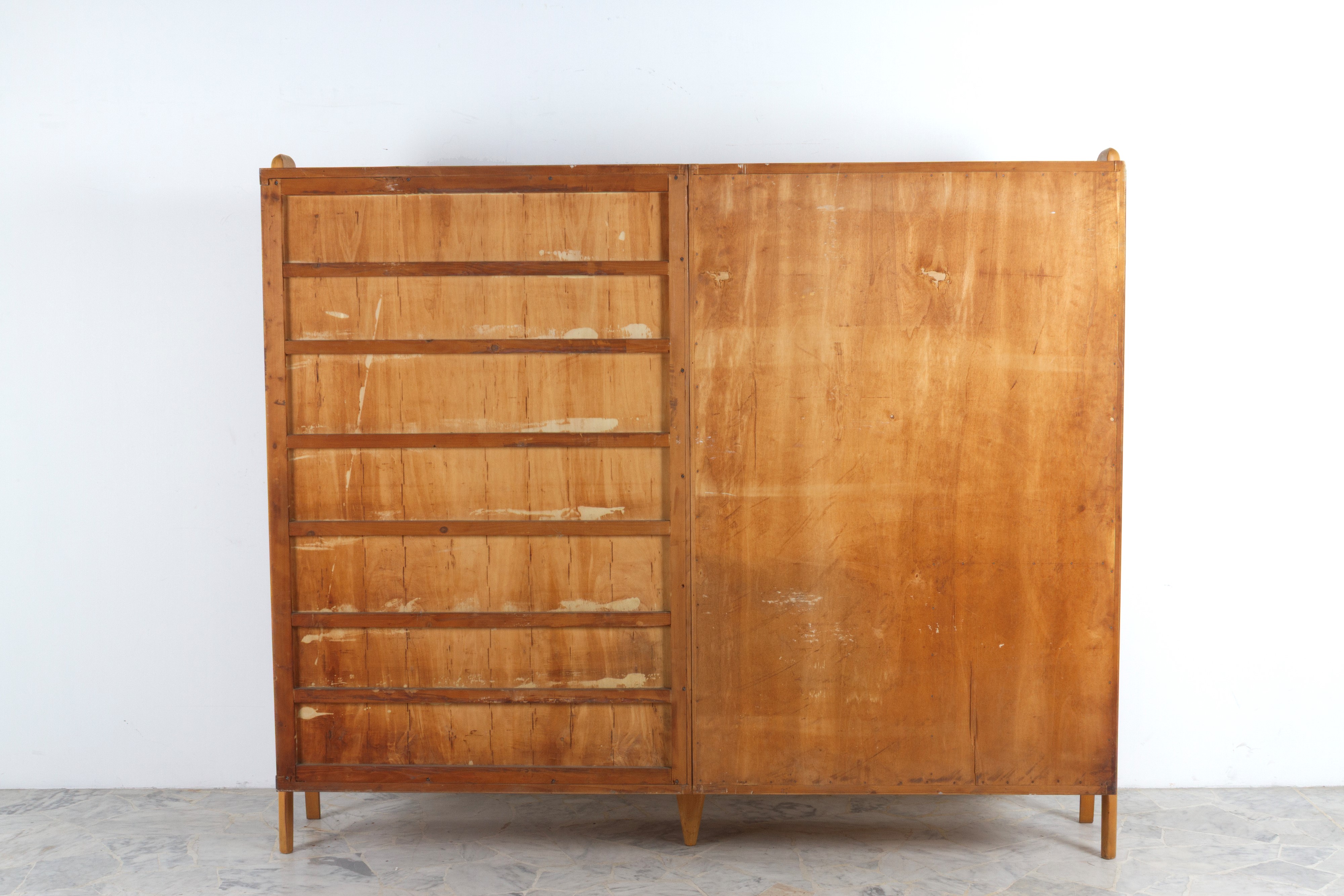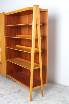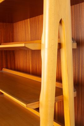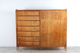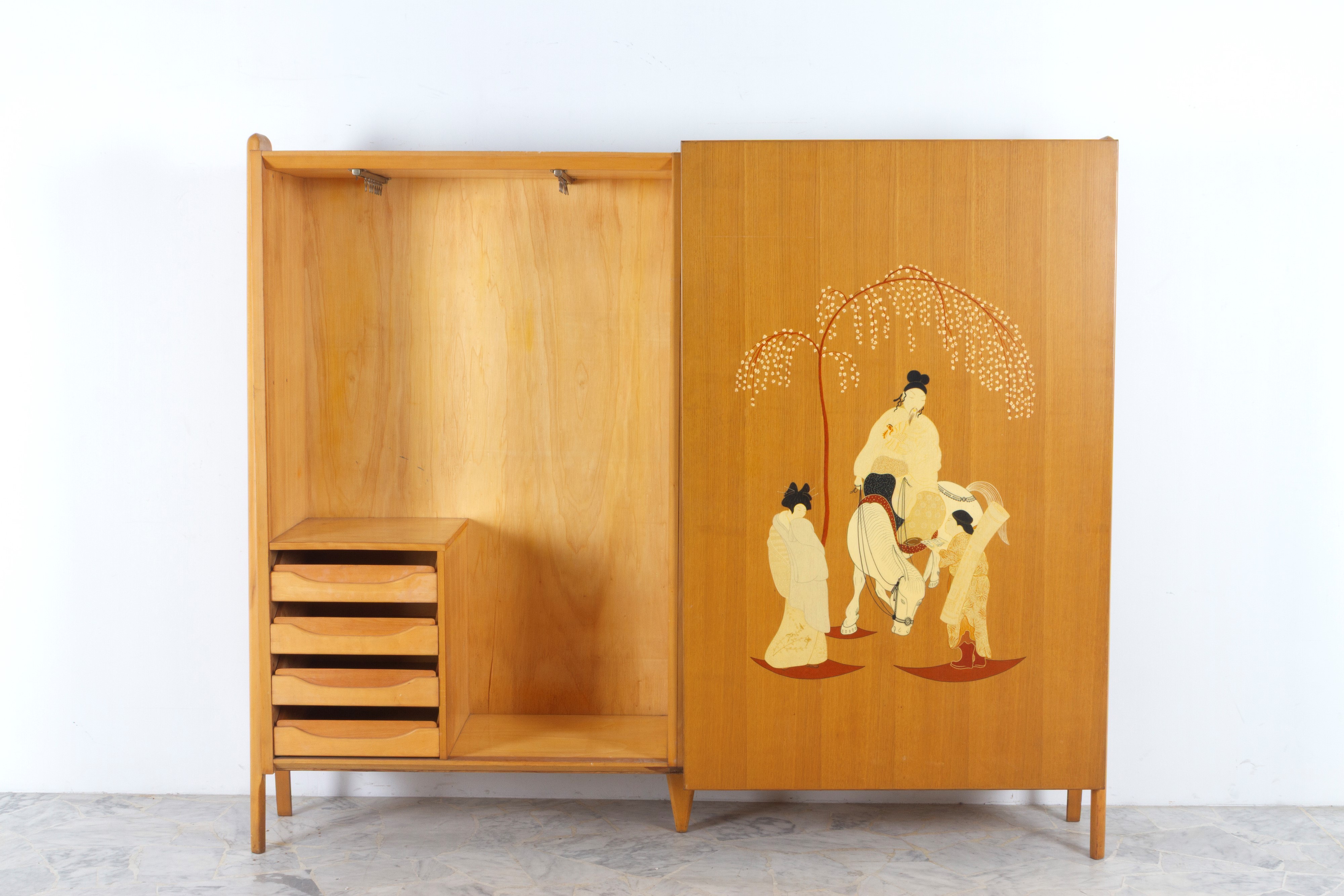 Maple wood cabinet with an oriental scene painted on the sliding door and shelves and drawers inside. 1960s-70s. Signs of wear.