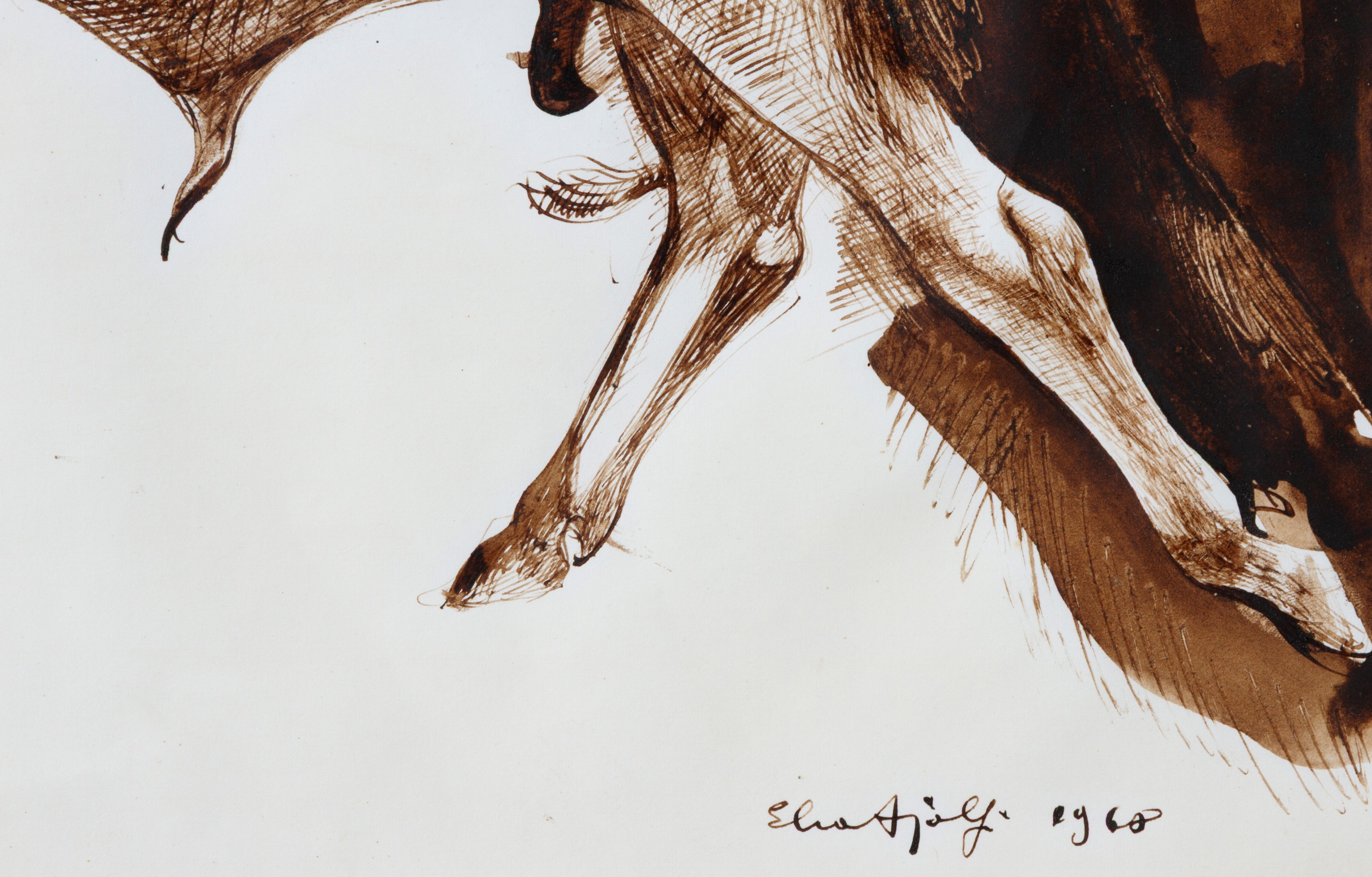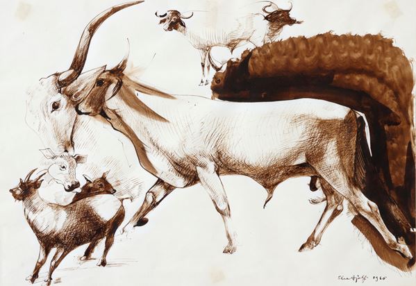 Watercolor on paper depicting "BULLS". Signed and dated 1960 lower right. Framed.