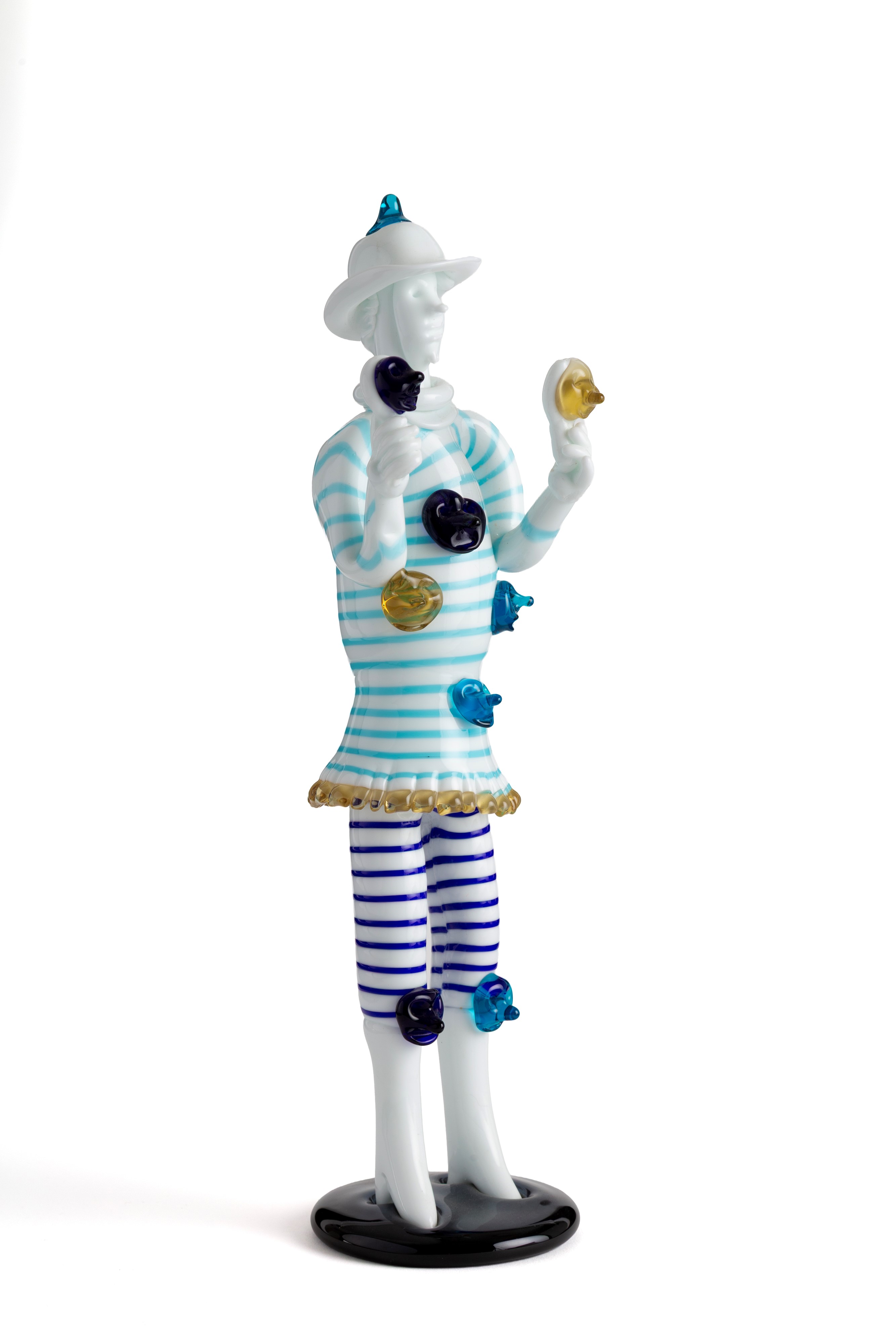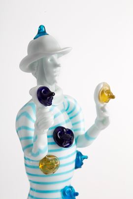 Milk glass figurine with polychrome decorations depicting "BRIGHELLA". Signed with acid on the bottom. VENINI, Murano. 1947-48. Published in "Fulvio Bianconi alla Venini", M. Barovier and C. Sonego, ed. Skira 2015, p . 326.