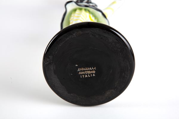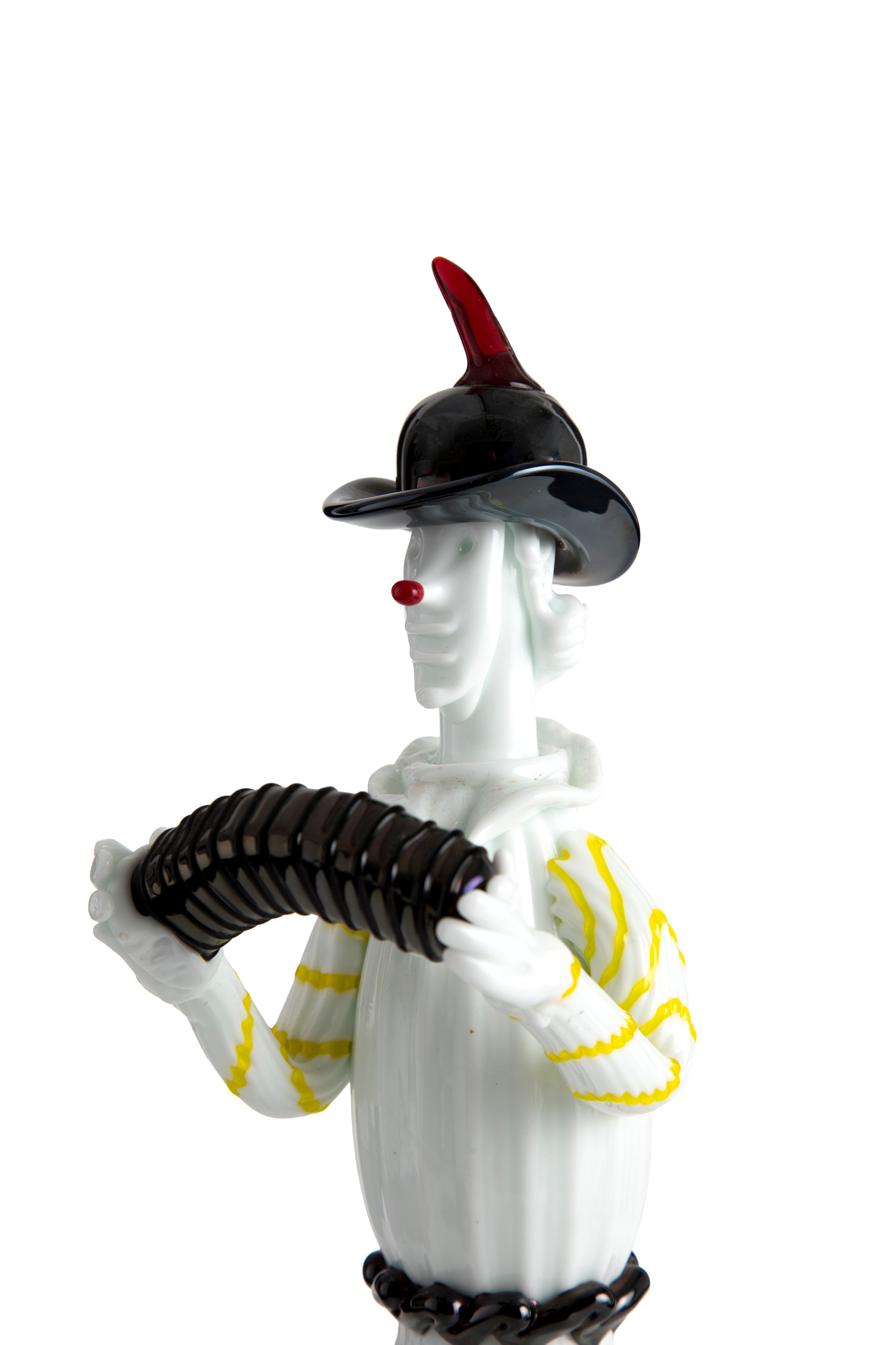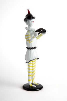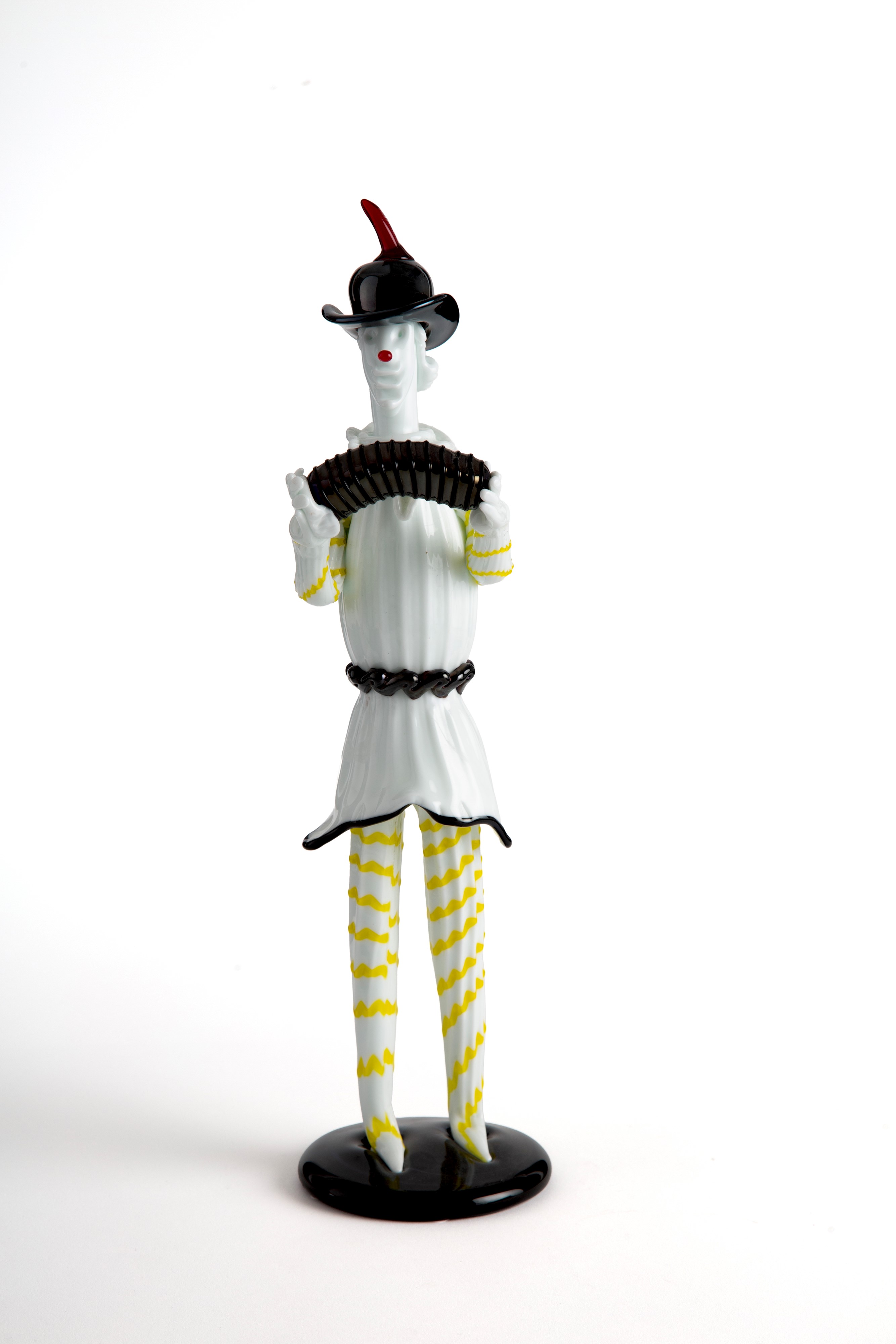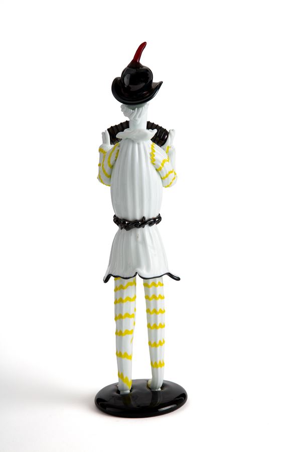 Milk glass figurine with polychrome decorations depicting "GIANGURGOLO". Acid-etched on the bottom. VENINI, Murano. 11947-48. Published in M. Barovier e C. Sonego, "Fulvio Bianconi alla Venini", ed. Skira 2015, p. 332.