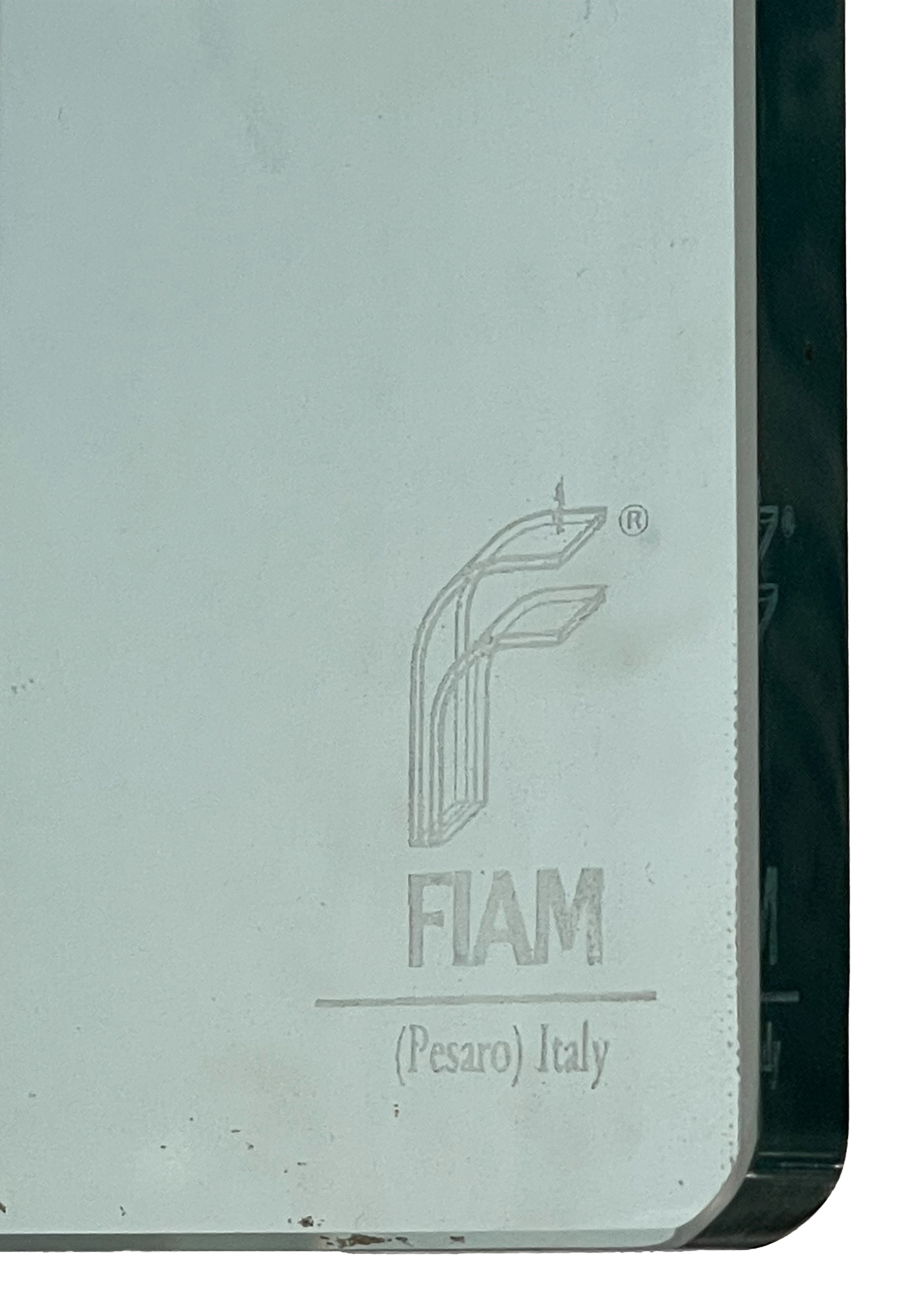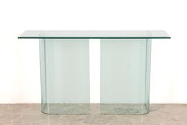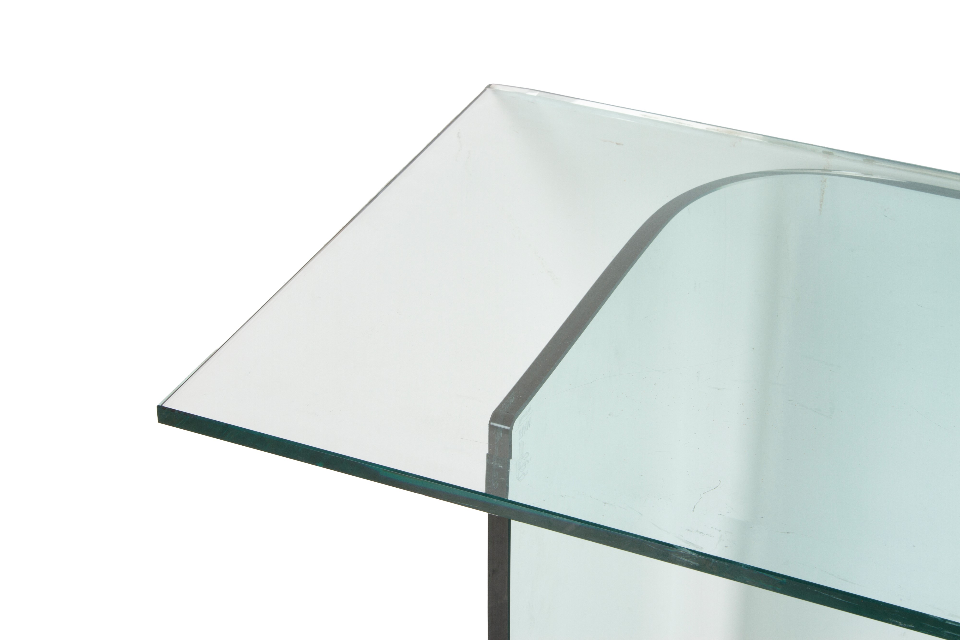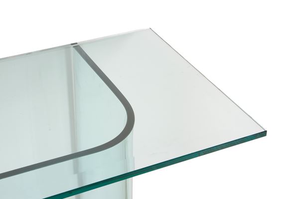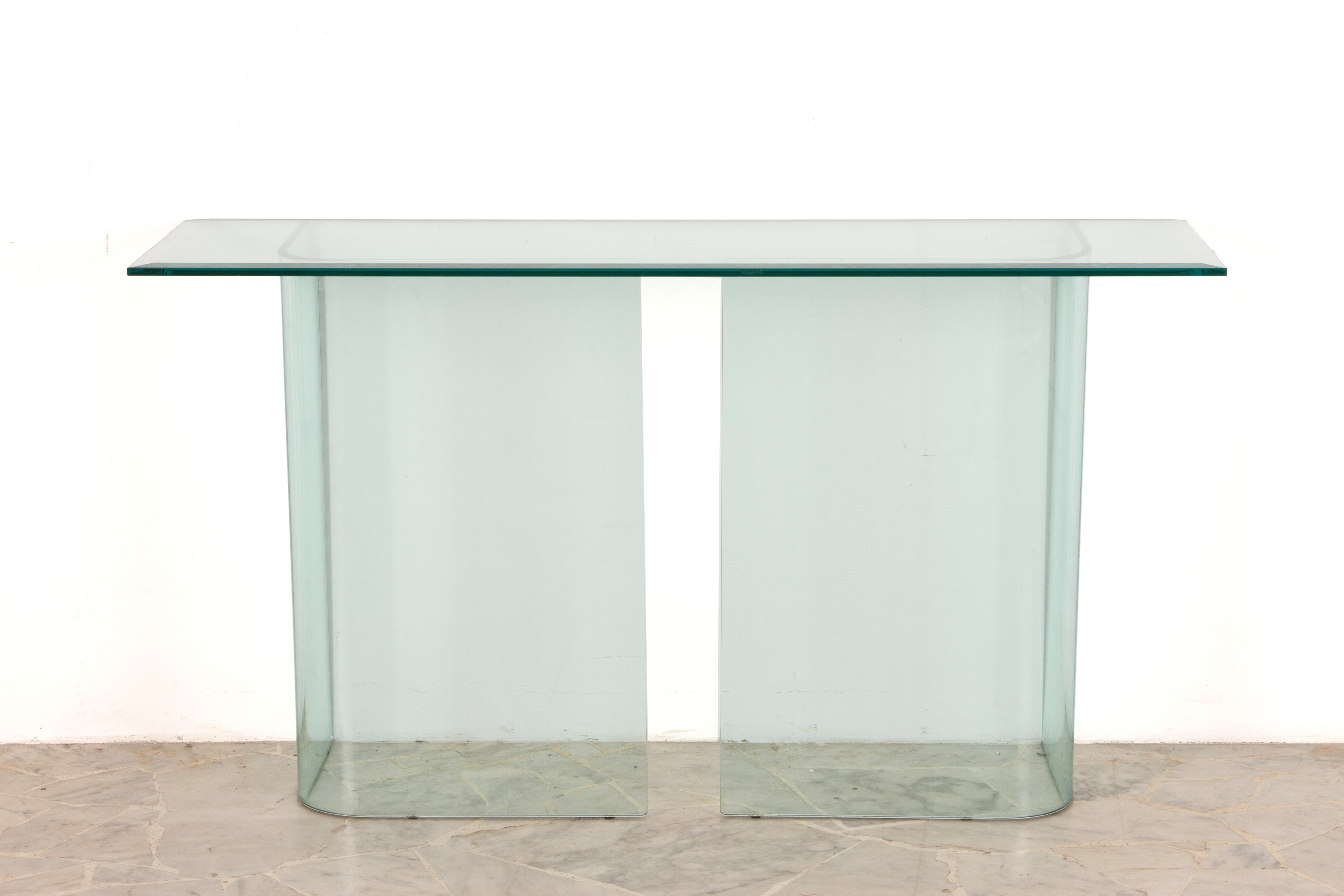 Tempered glass console table. FIAM, Pesaro. With manufacturer's mark on the legs. Unmarked top.