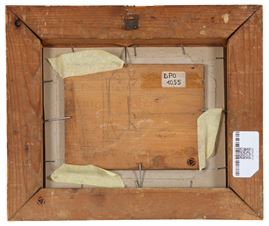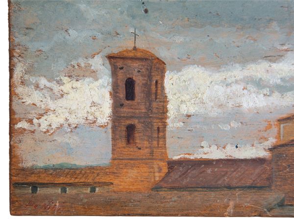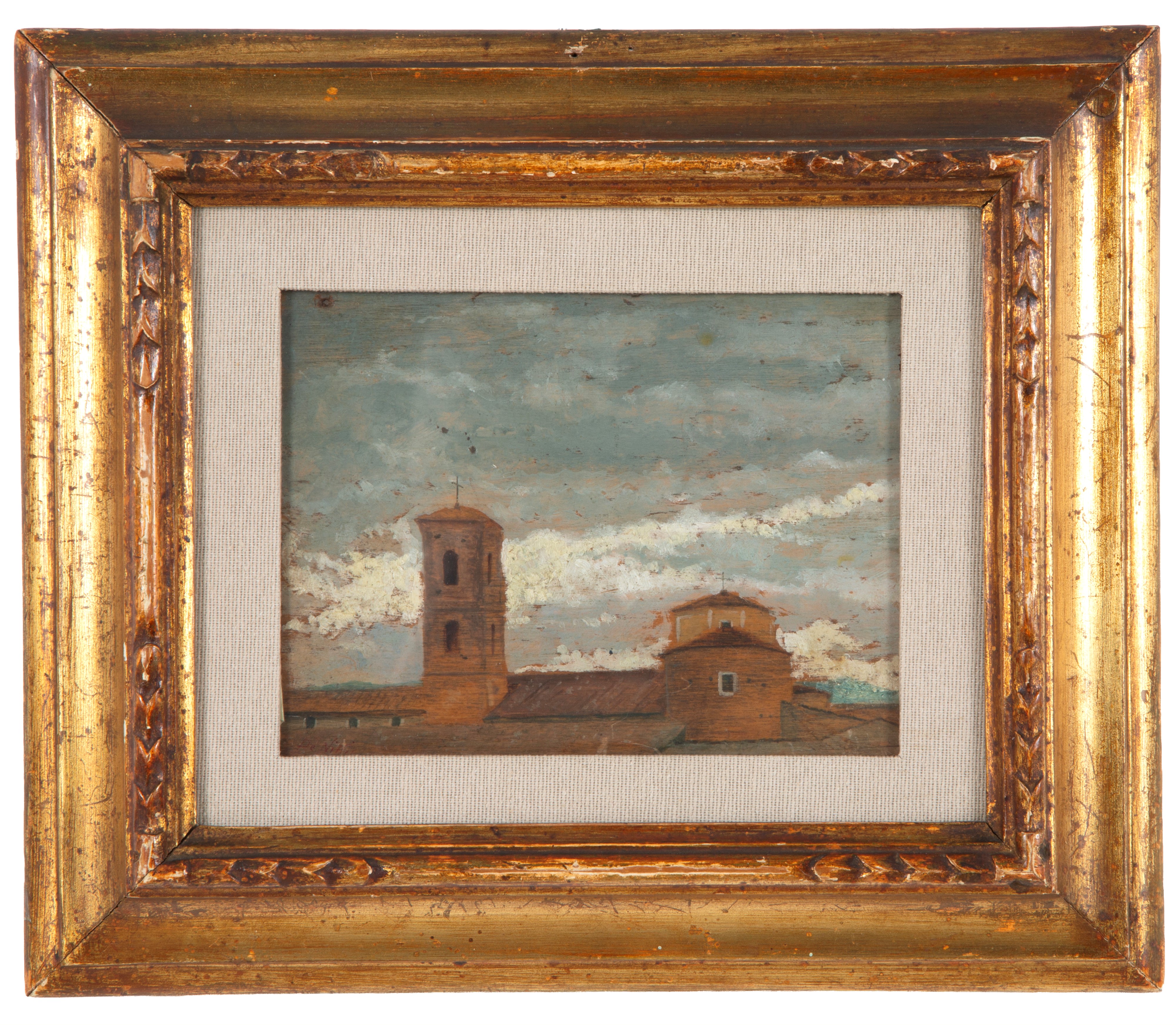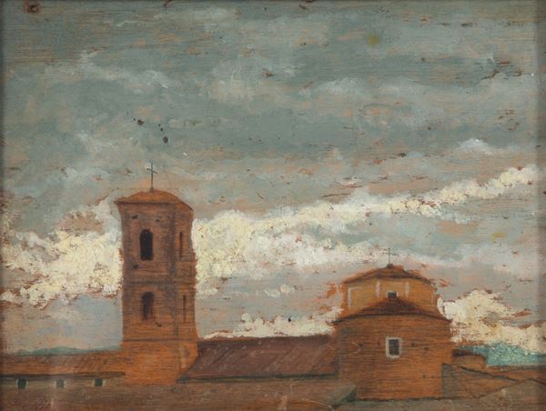 Oil painting on panel depicting "GLIMPSES OF ROOFS WITH BELL TOWER." Signed lower left. Atelier De Nittis stamp on the back. Framed.