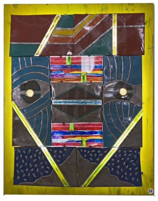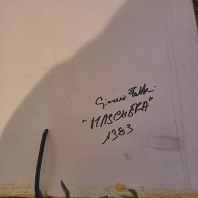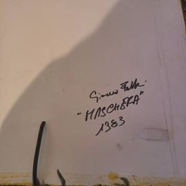 Sculpture in shaped sheet metal and plexiglass painted with neon, titled "MASCHERA". Signed, dated 1983, and titled on the back.