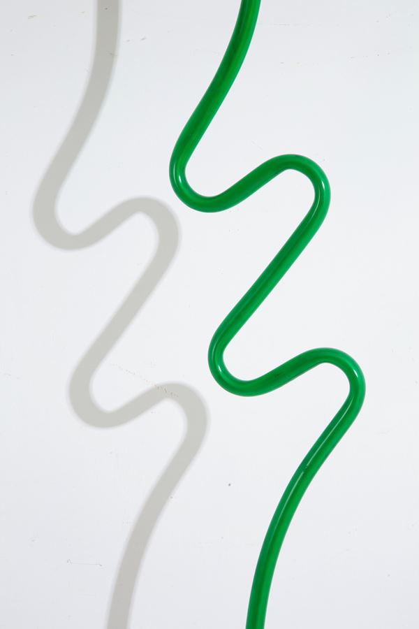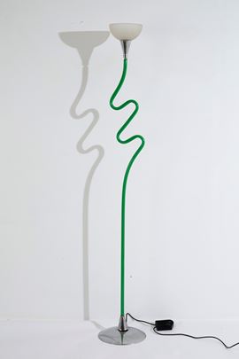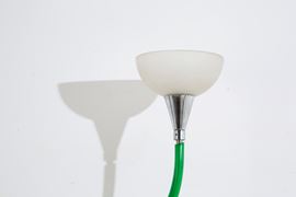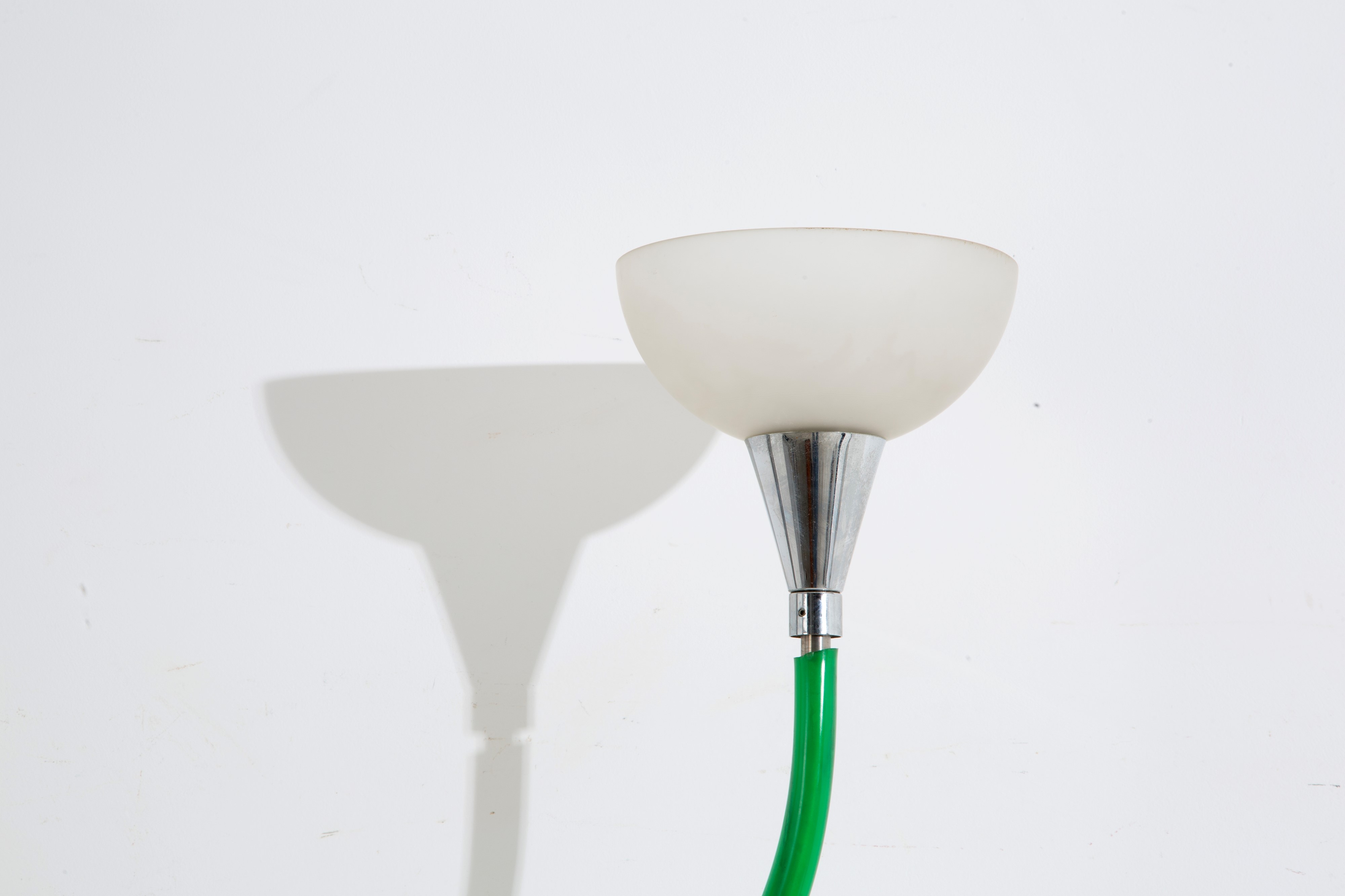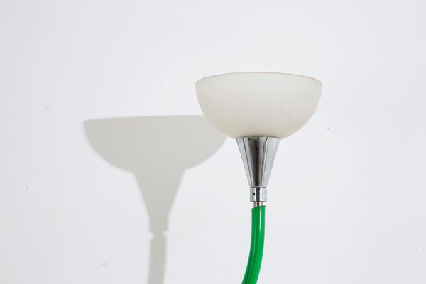 Tubular floor lamp in chromed metal, plastic, and glass. 1980s. Shows signs of wear and tear.