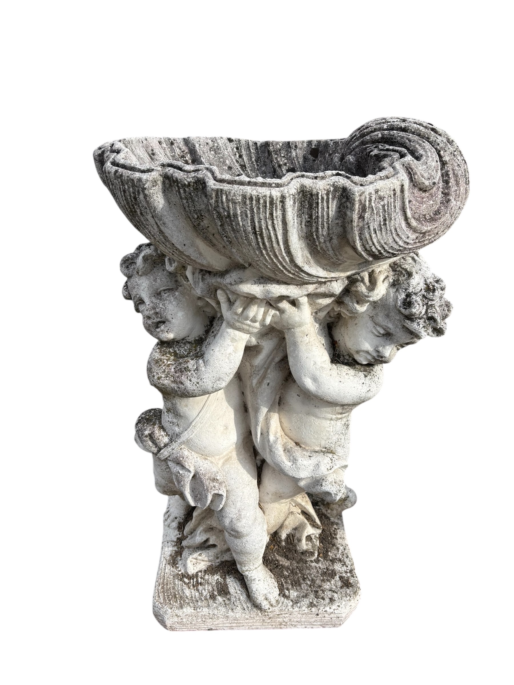 Flowerpot in agglomerate stone supported by a pair of cherubs.