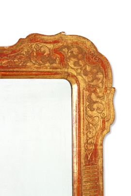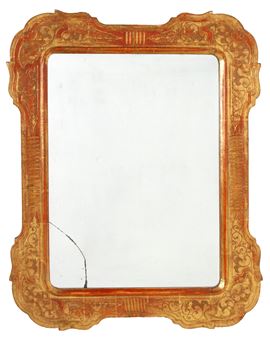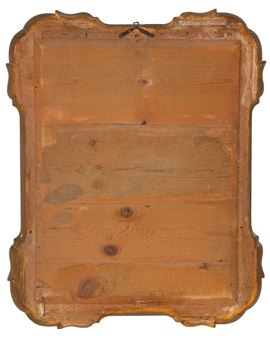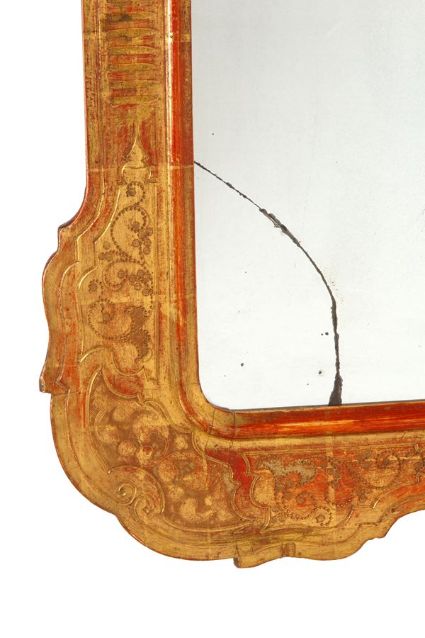 Pyrographed and gilded wooden tray frame with mirror. 19th century. Minor defects and broken mirror.