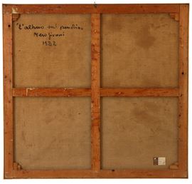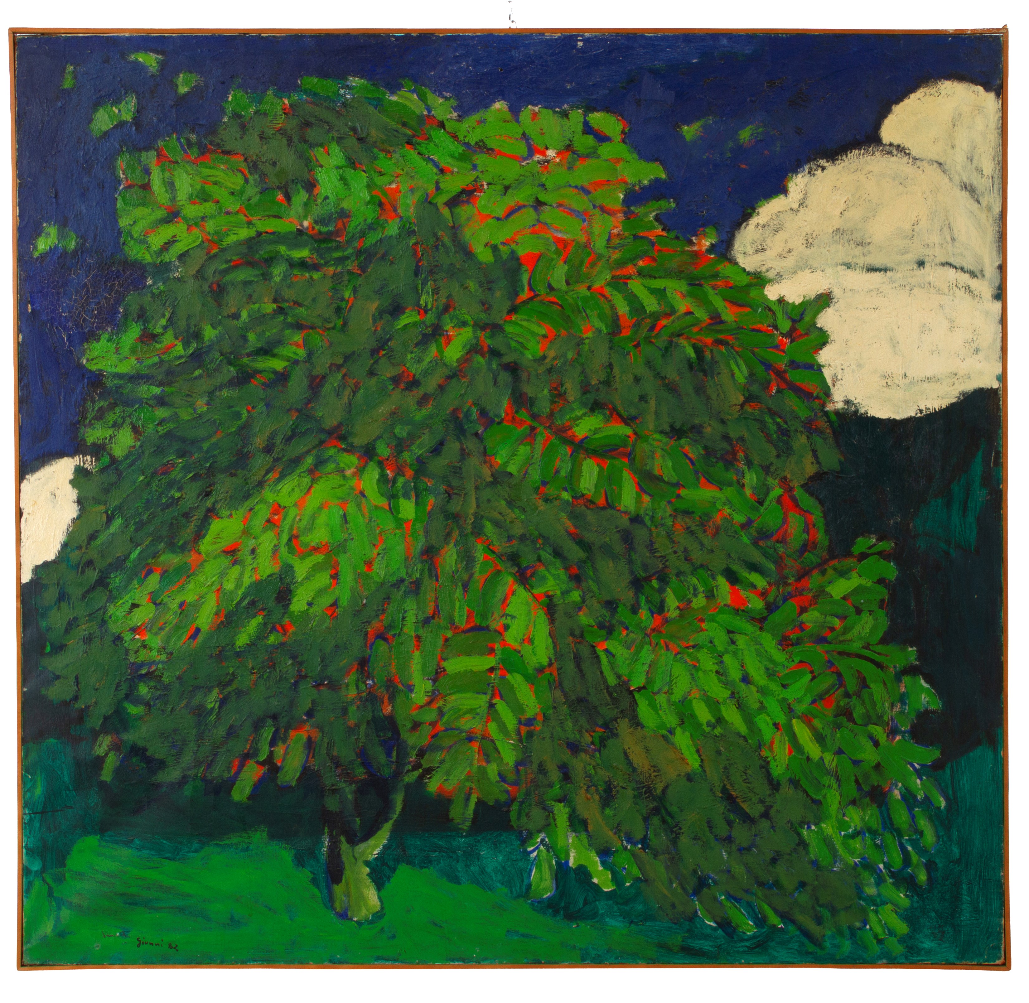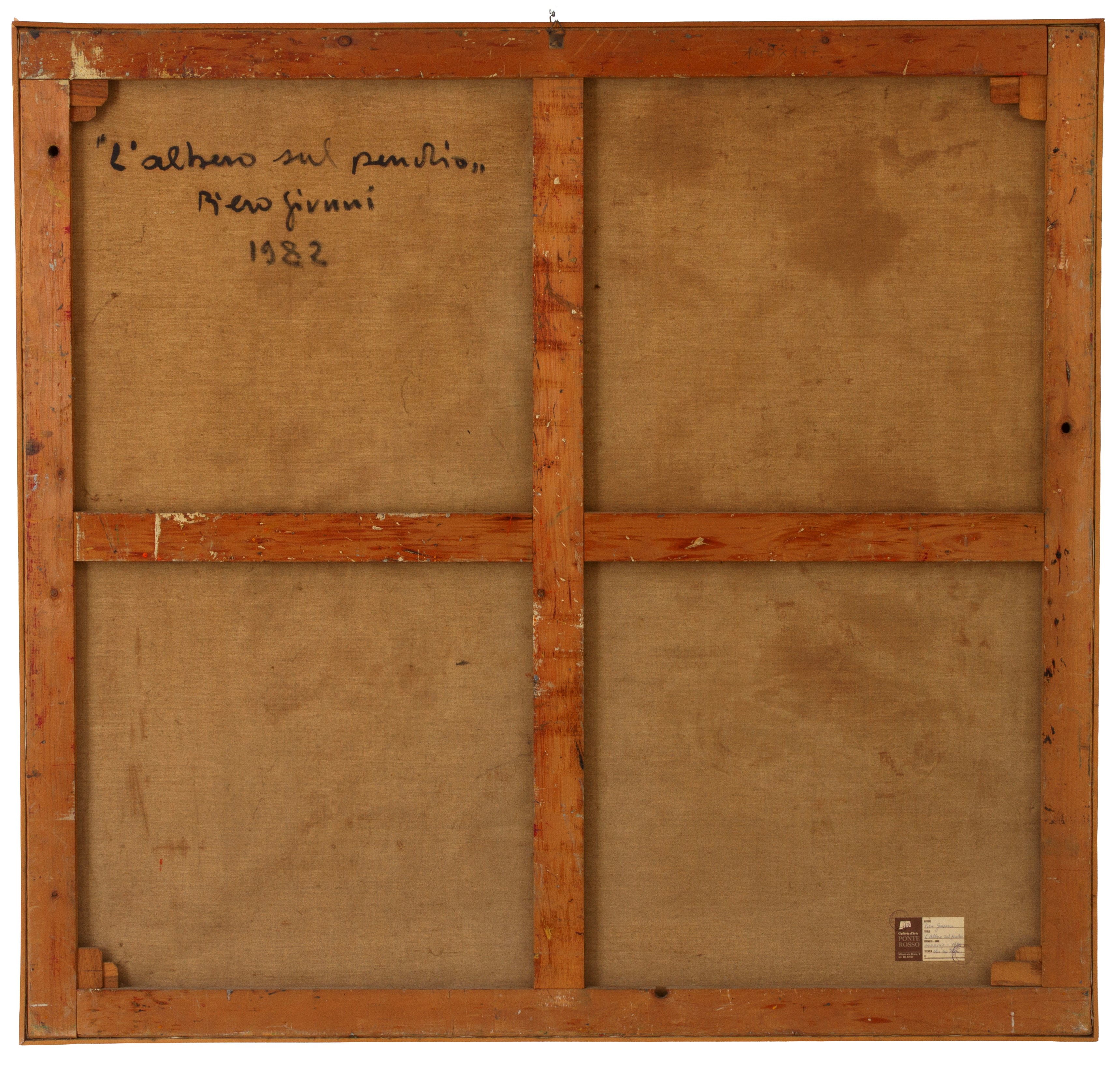 Oil on canvas titled "L'ALBERO SUL PENDIO". Signed and dated 82 lower left. Countersigned, titled, dated, and labeled by the Galleria d'Arte Ponte Rosso, Milan, on the reverse.