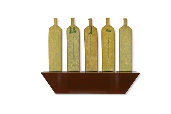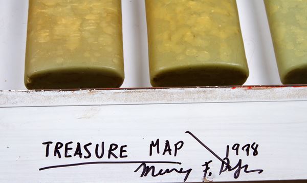 Hanging wooden sculpture with five wax bottles titled "TREASURE MAP". Title, unidentified signature, and date 1998 on the back.