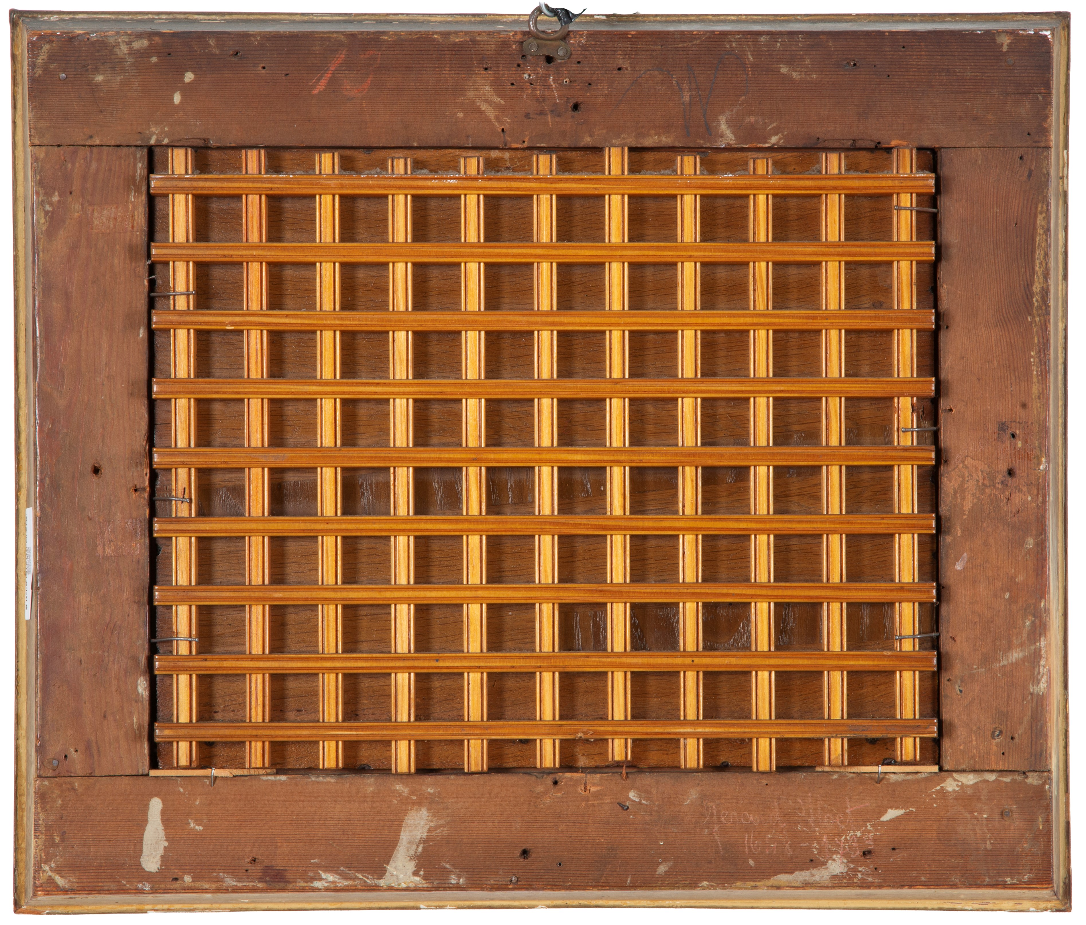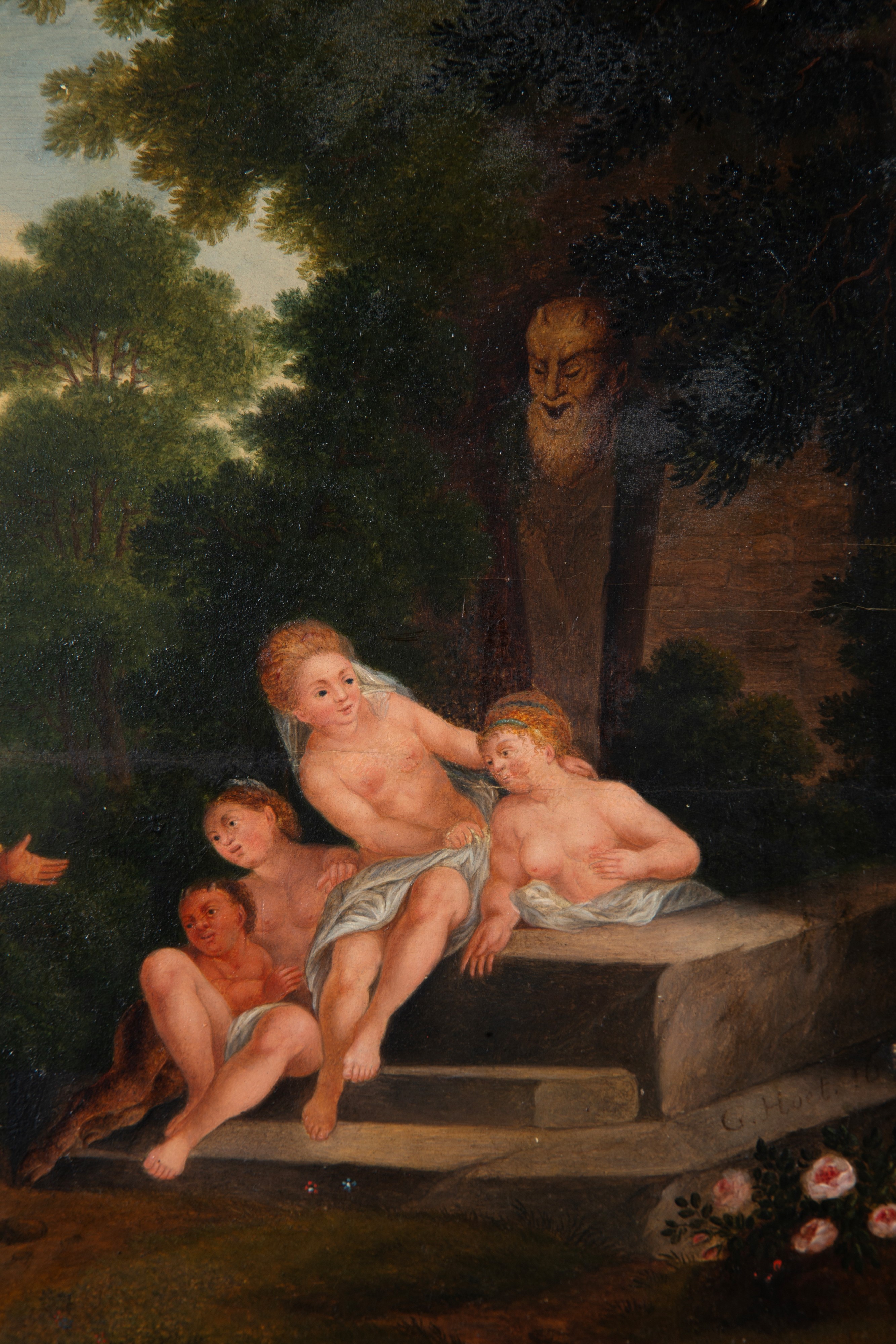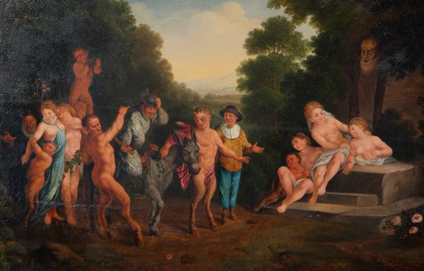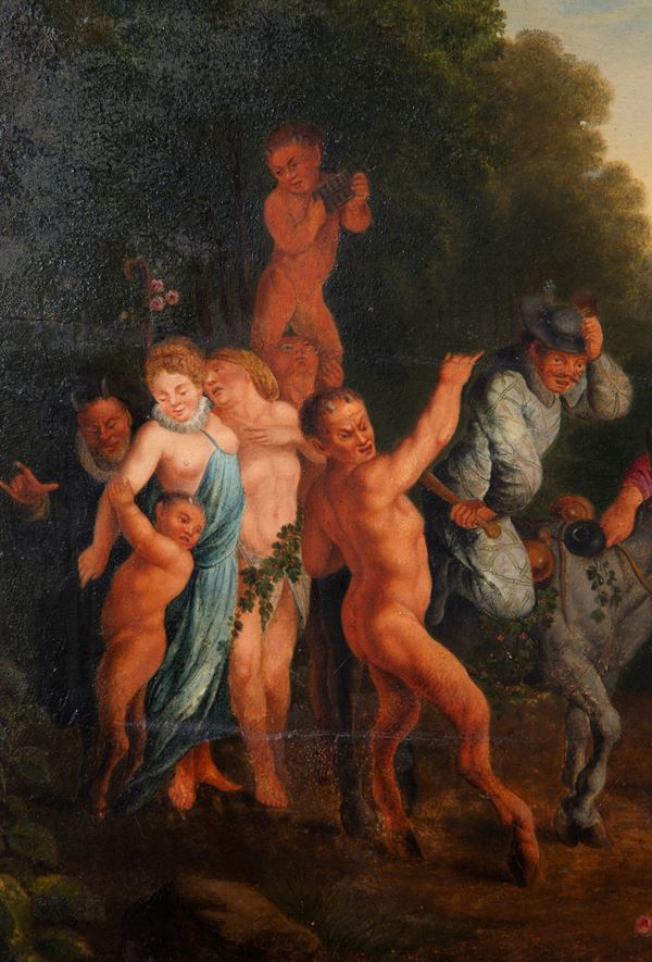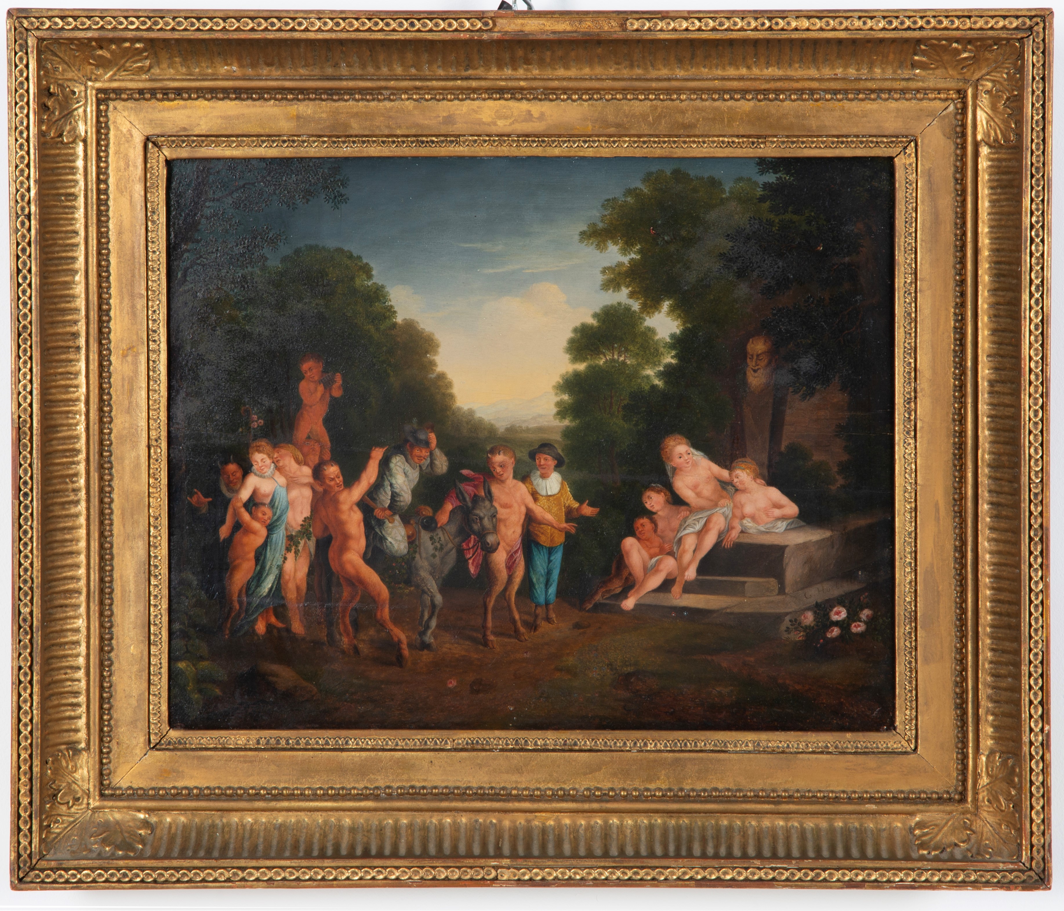 Oil painting on panel depicting "BACCHANALE". Signed on the monument on the right. In a 19th-century frame. Minor defects.