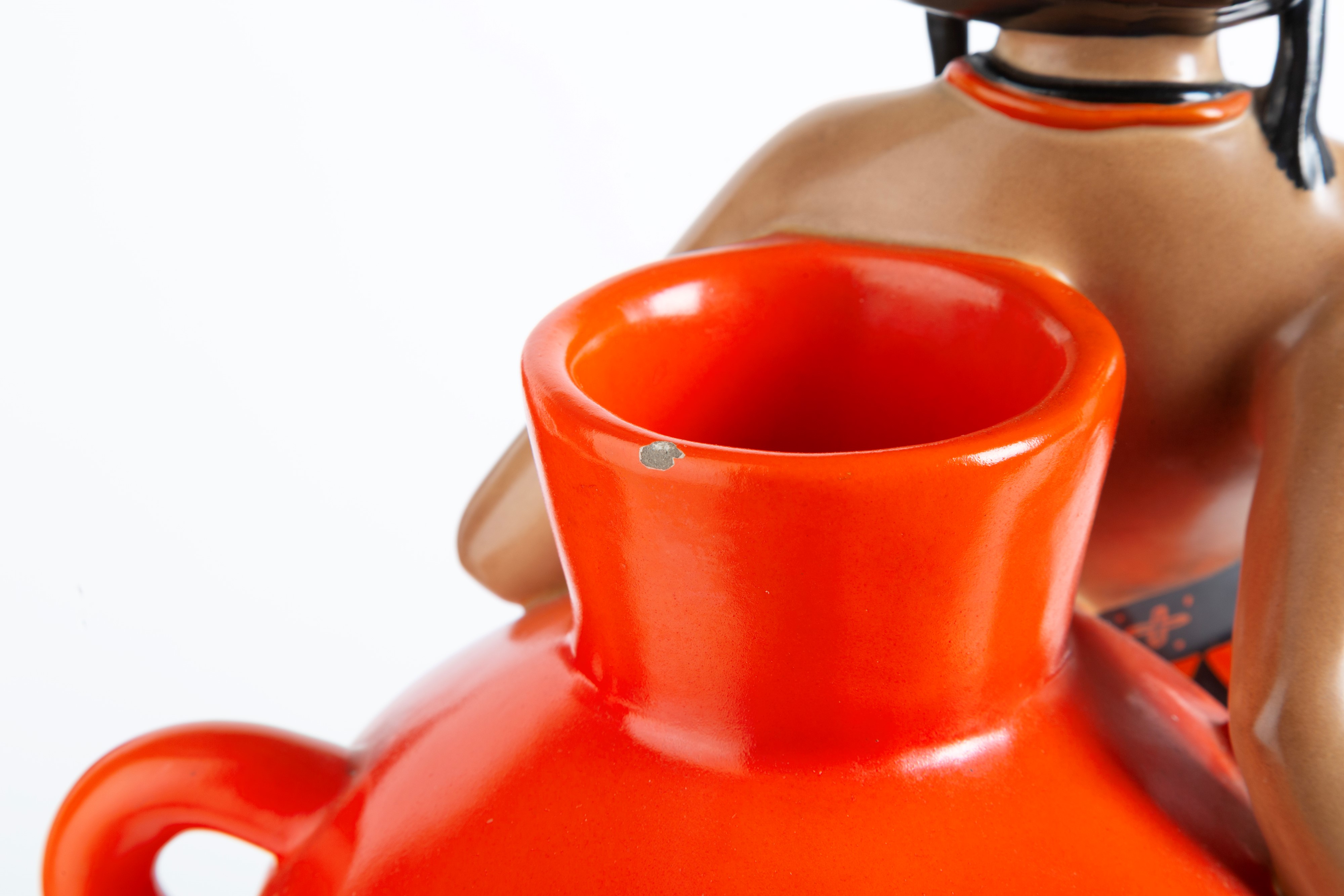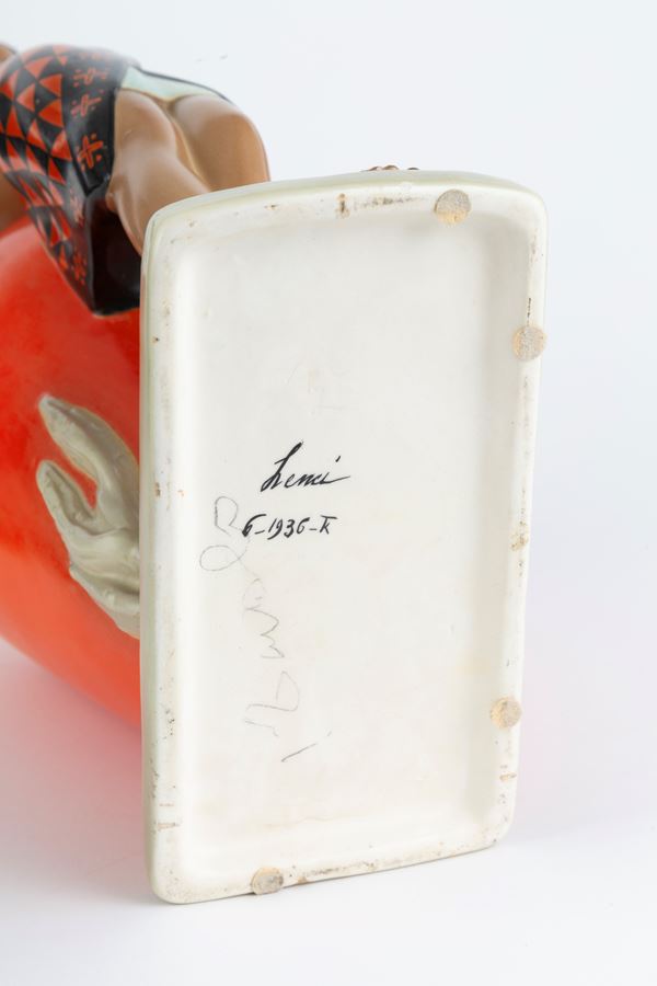 Ceramic sculpture depicting "ABYSSINIAN GIRL LEANING ON AN AMPHORA". Made by LENCI. Marked on the bottom. Defects.