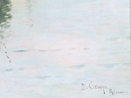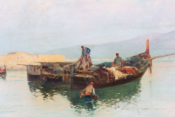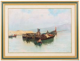 Oil on canvas depicting "BOATS WITH FISHERMEN". Signed lower right. Framed.