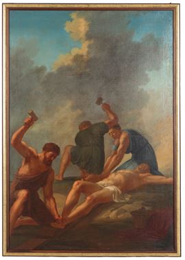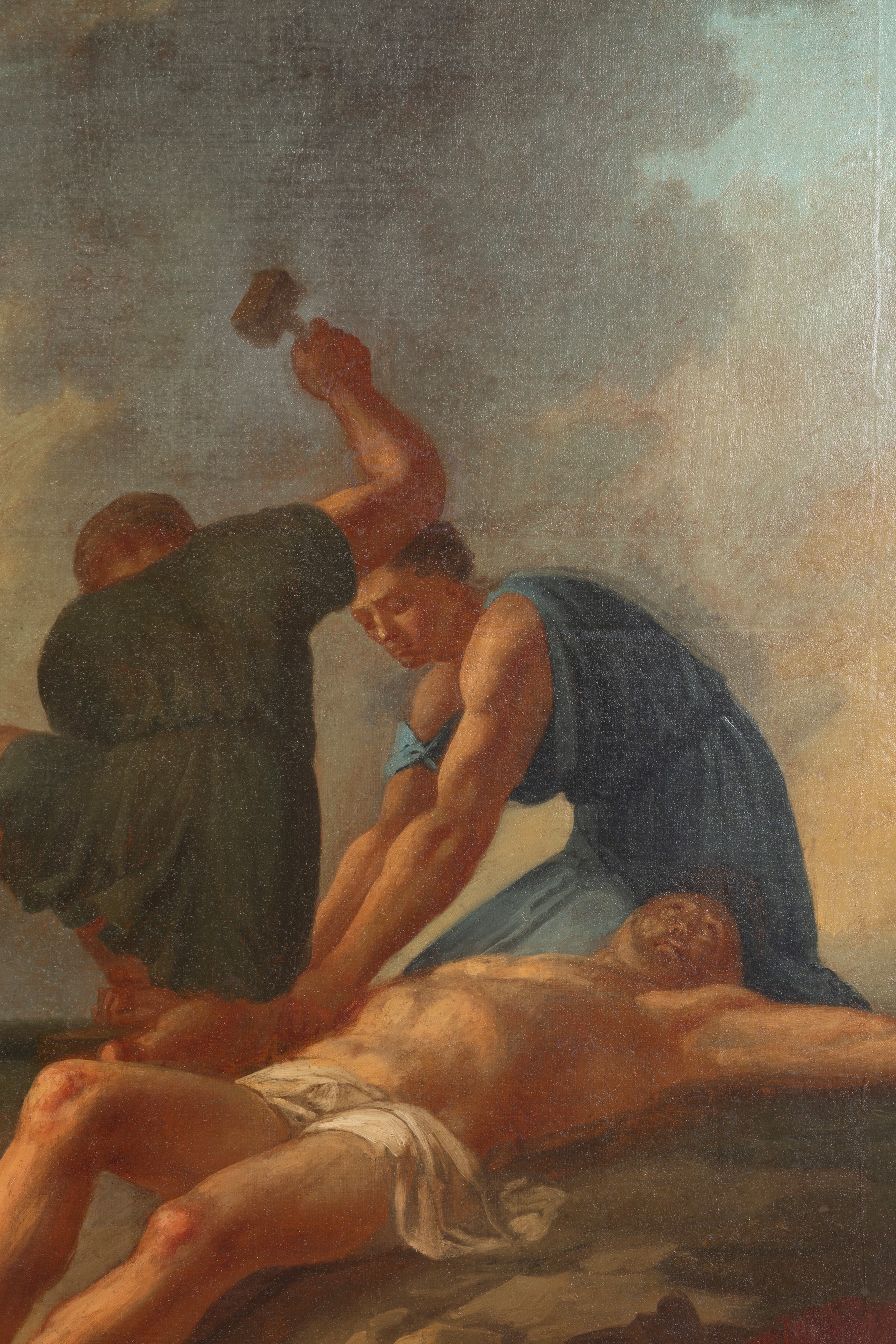 Oil painting on canvas depicting "CRUCIFIXION". Early 19th century. Framed. Restored. Already relined and restretched.