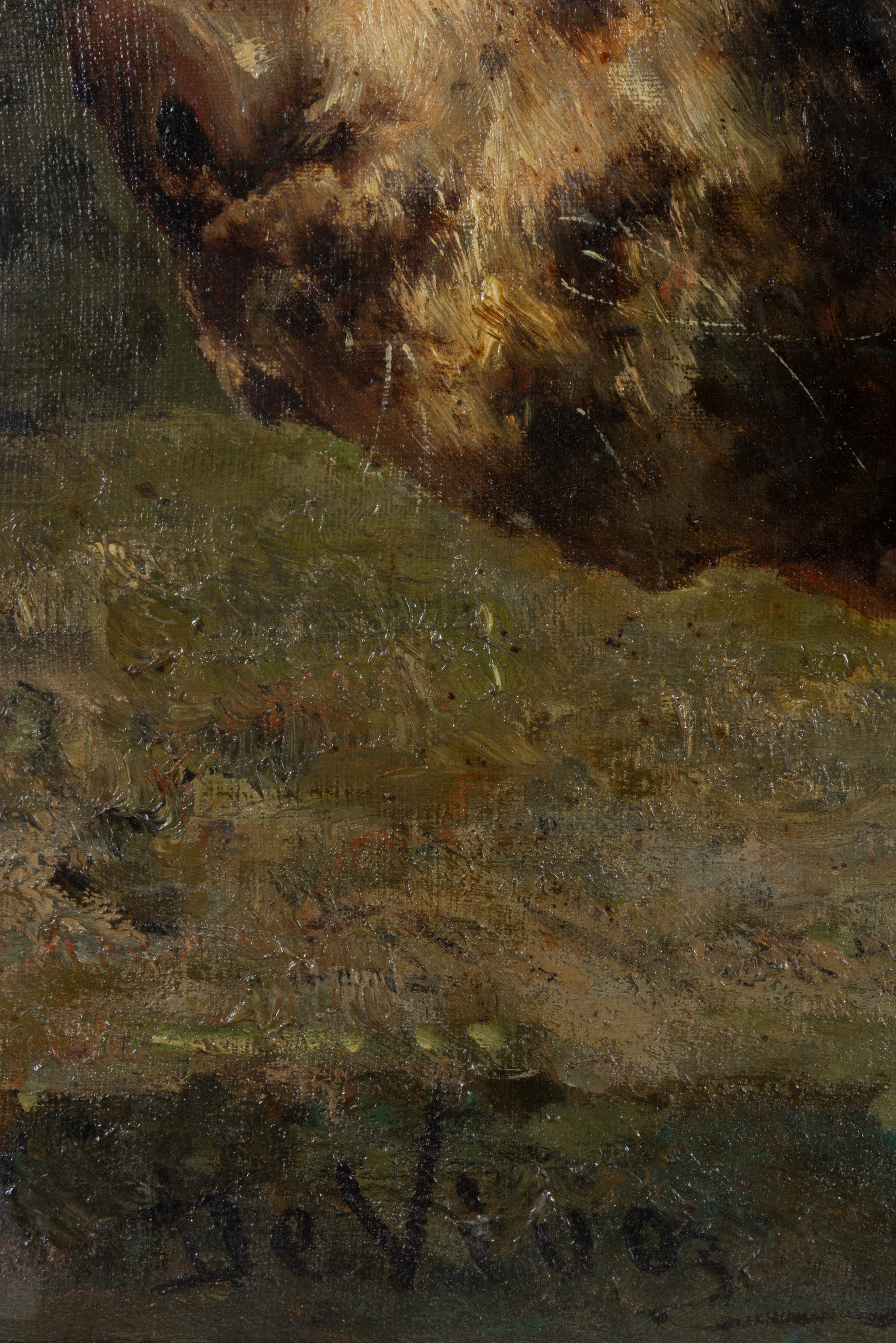 Oil on canvas depicting "GAME WITH HOUNDS". Signed DE VIVO lower left. 19th century. Framed.