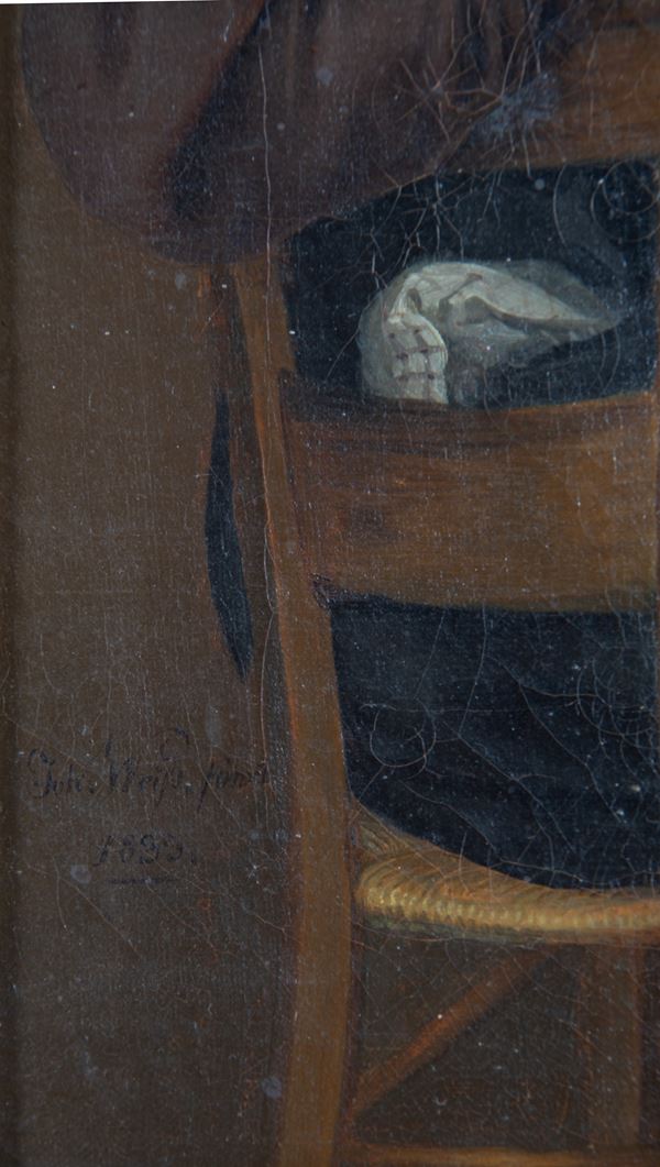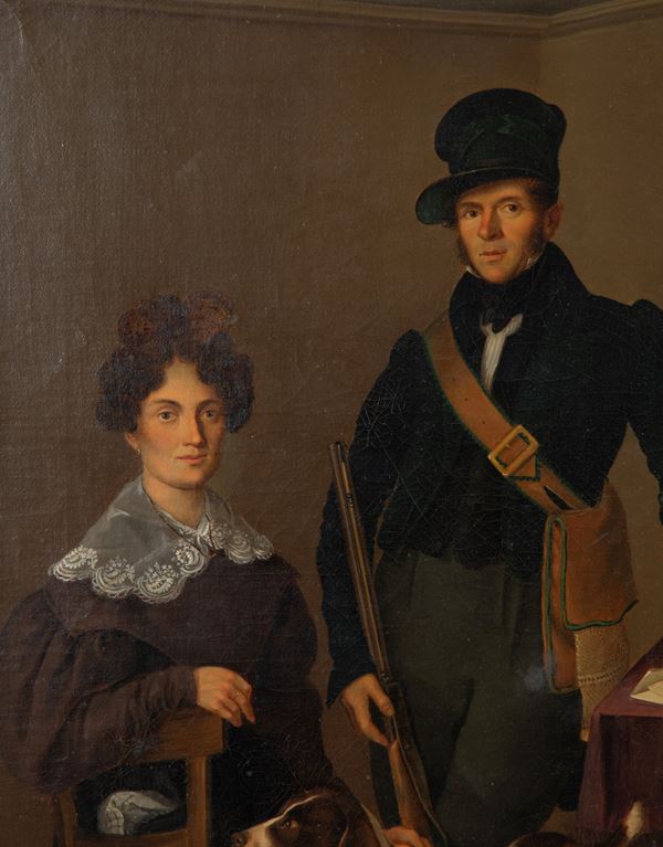 Oil on canvas depicting "INDOOR SCENE WITH A GENTLEWOMAN, HUNTER, AND DOG". Unidentified signature and dated 1833 lower left. In a contemporary frame. Already relined.