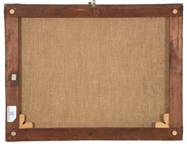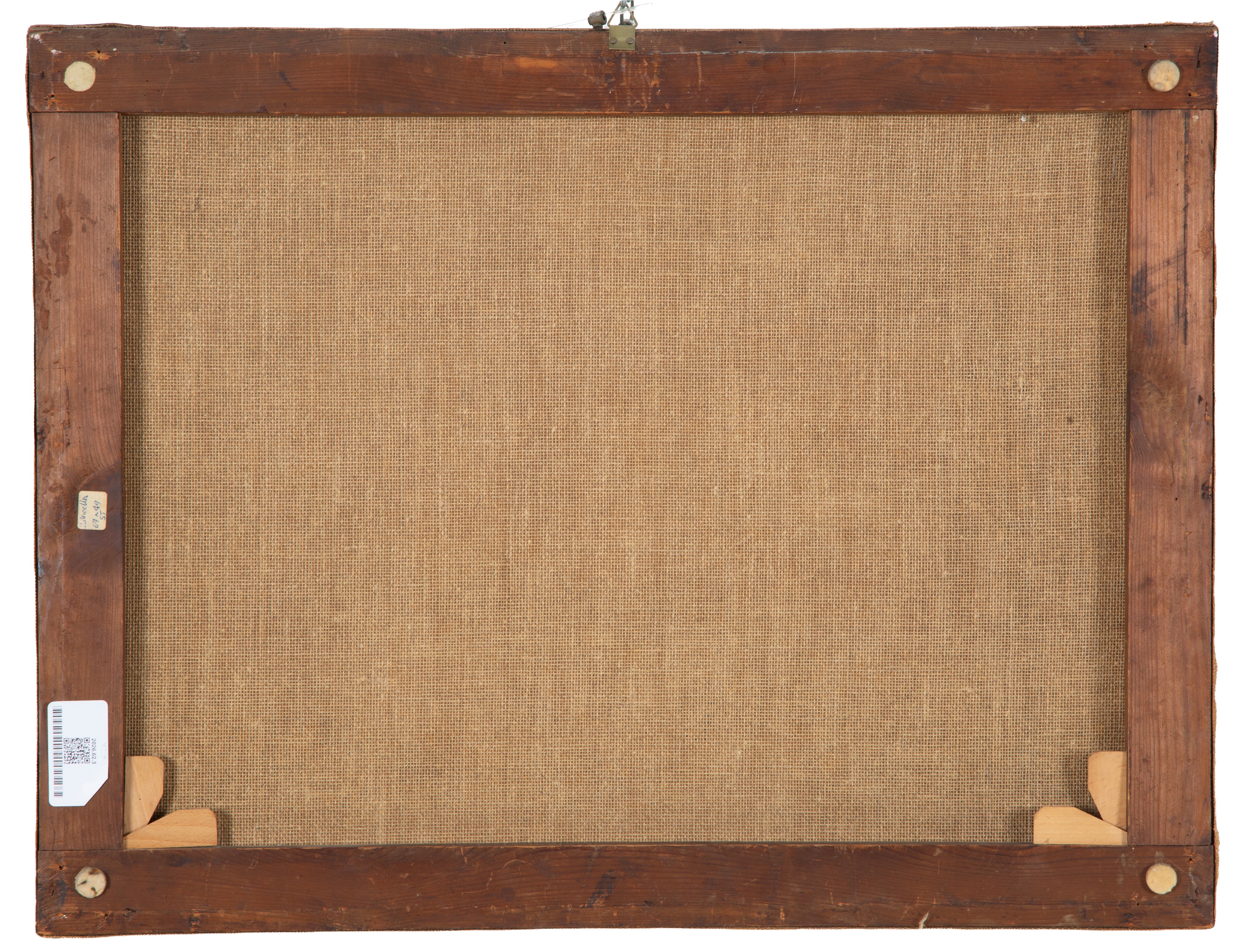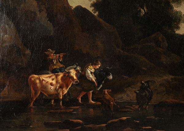 Oil painting on canvas depicting "RIVER LANDSCAPE WITH SHEPHERDS". 18th century. Already re-stretched and re-lined.