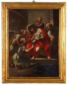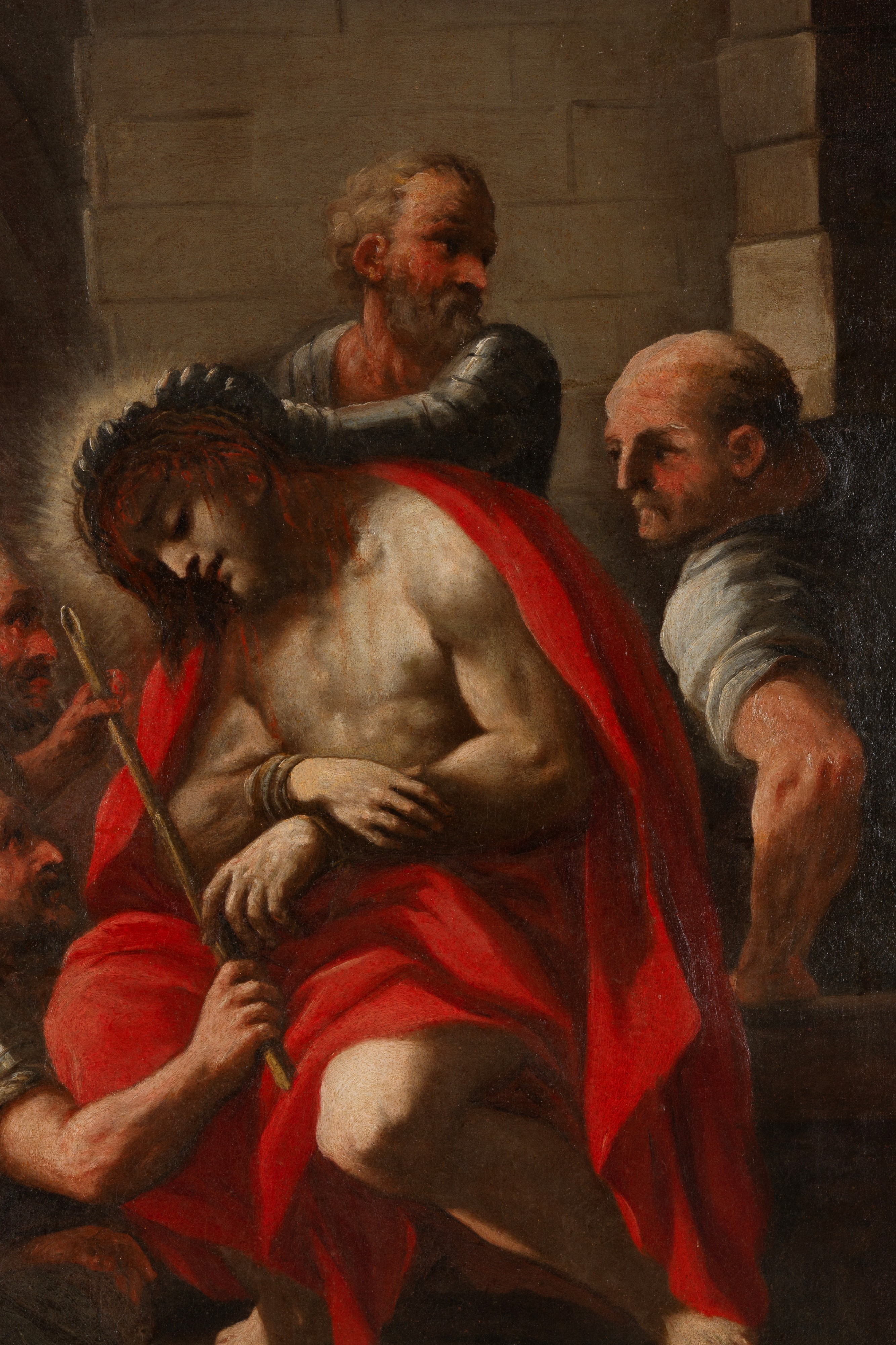 Oil painting on canvas depicting "THE CROWNING WITH THORNS." 17th century. In a gilded frame. Already re-stretched and re-lined. Restored.