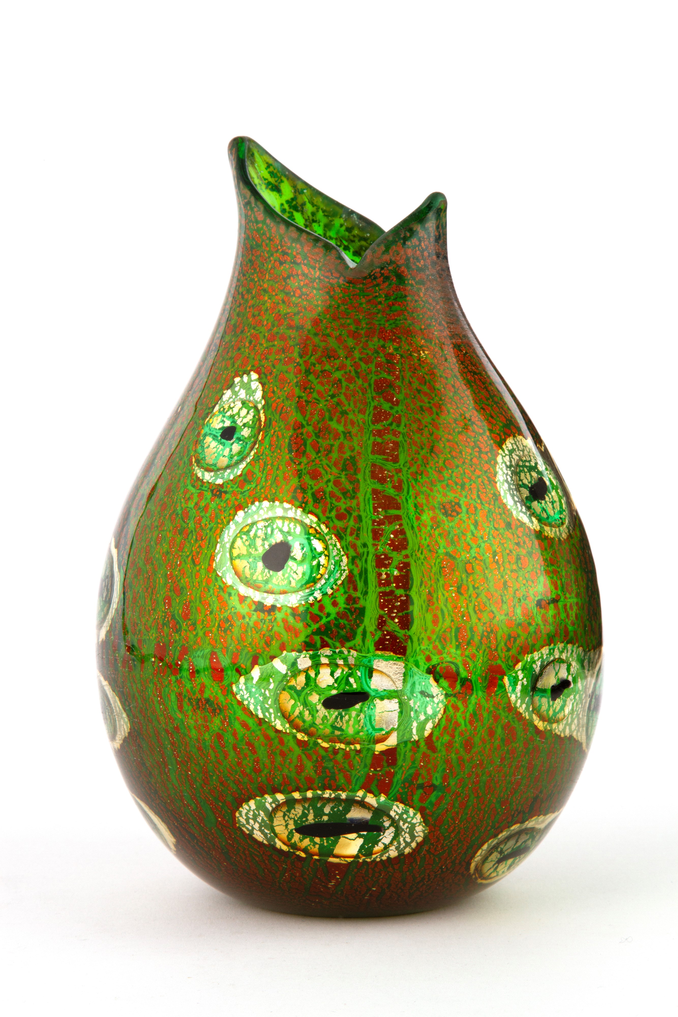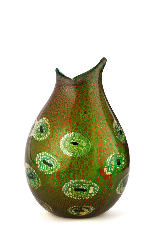 Reazioni Policrome vase in polychrome blown glass decorated with large murrine and gold leaf. Produced by A.V.E.M. in 1952. Technique presented at the XXVI Venice Biennale in 1952.