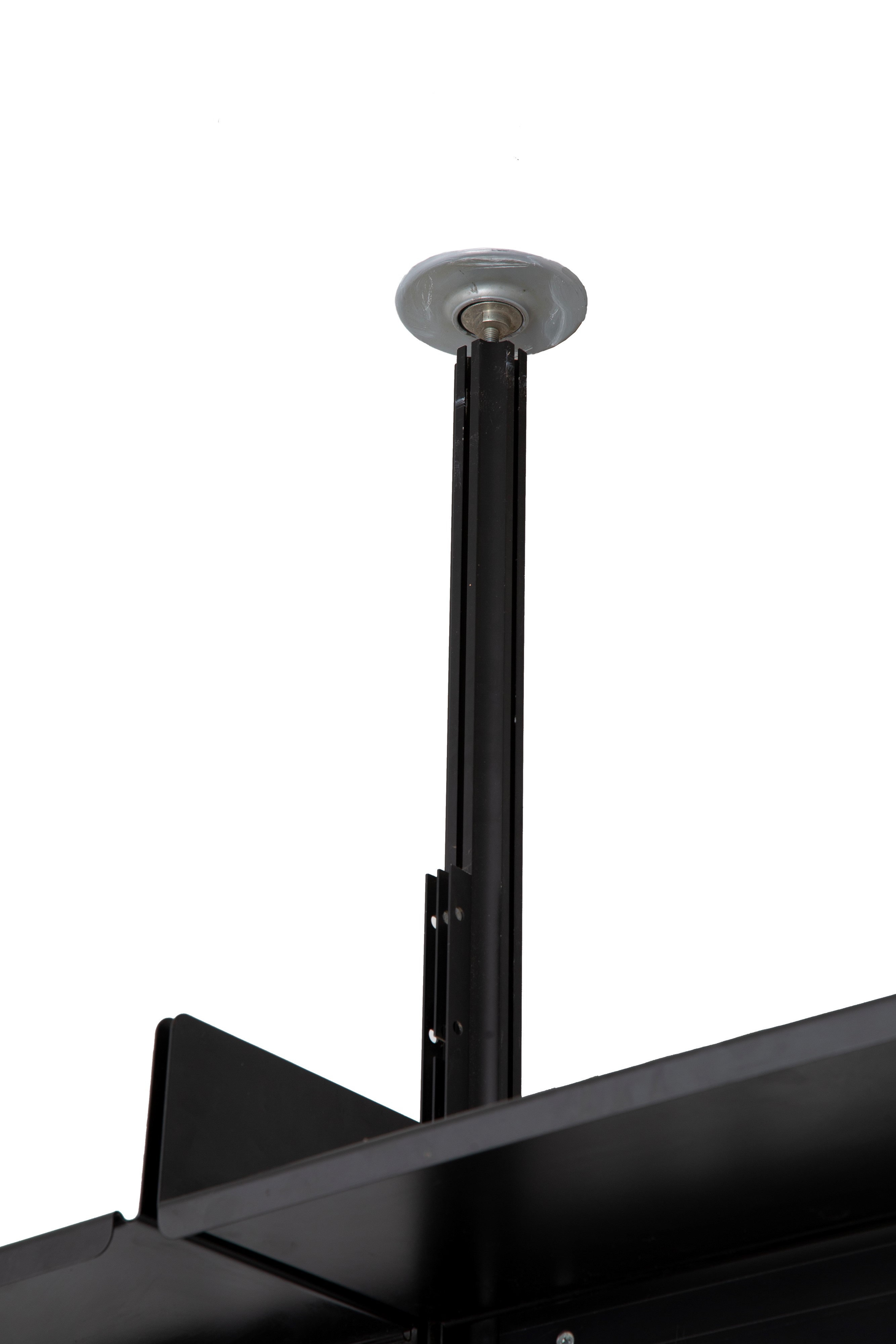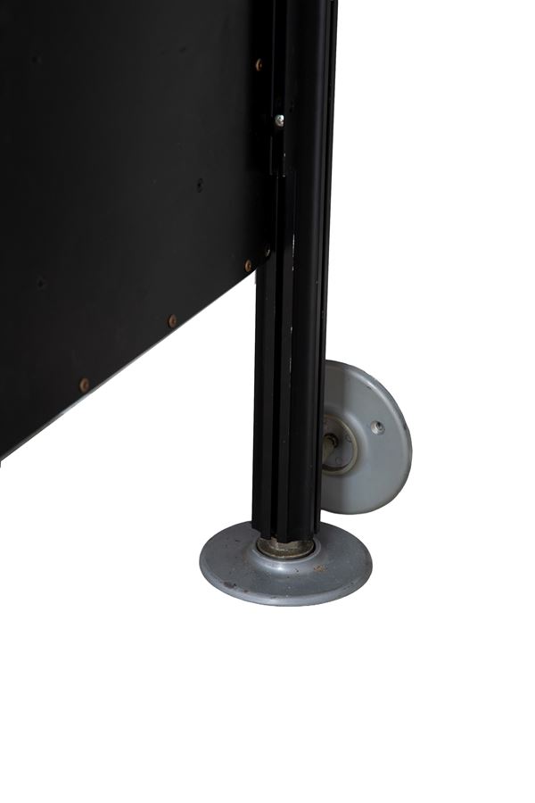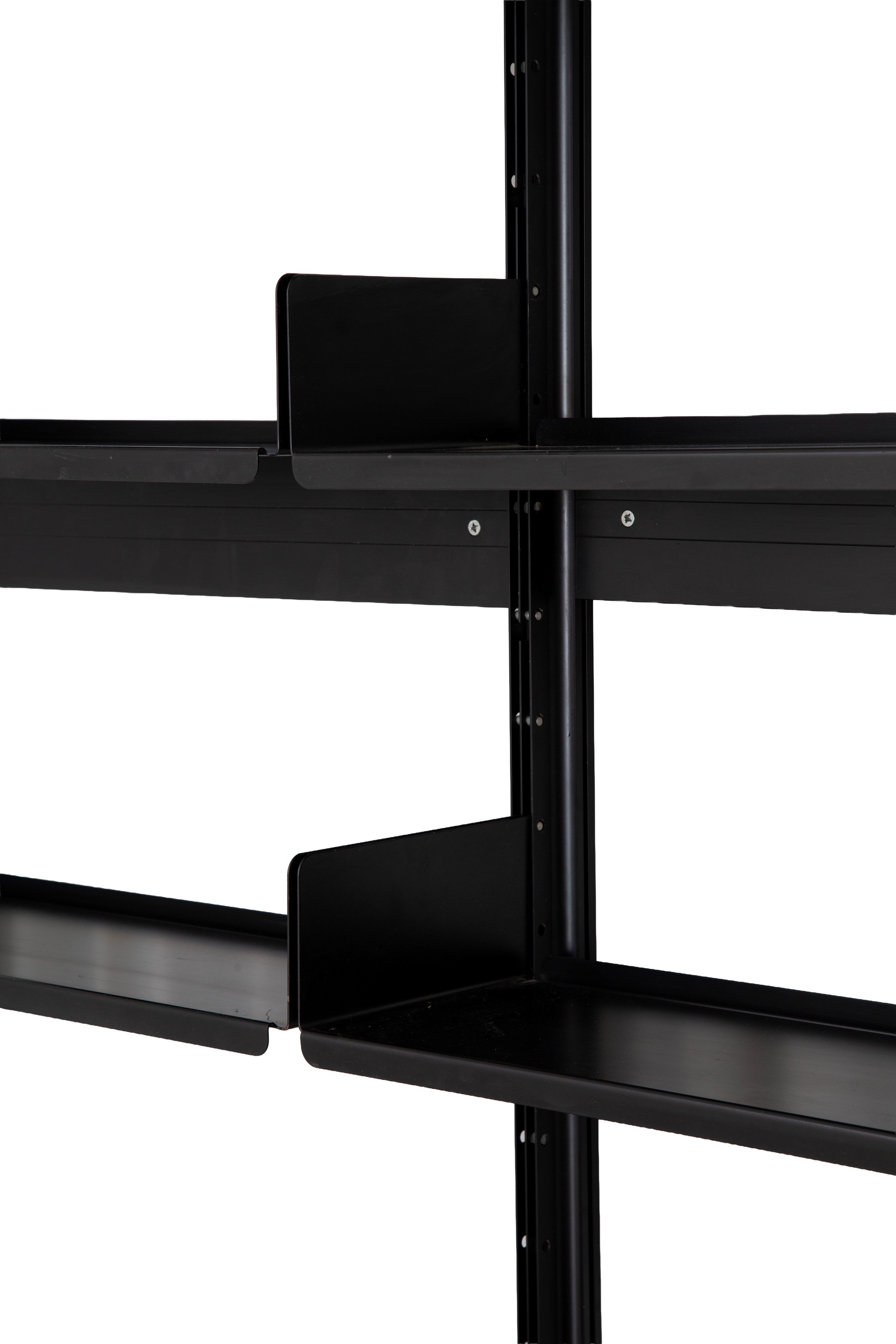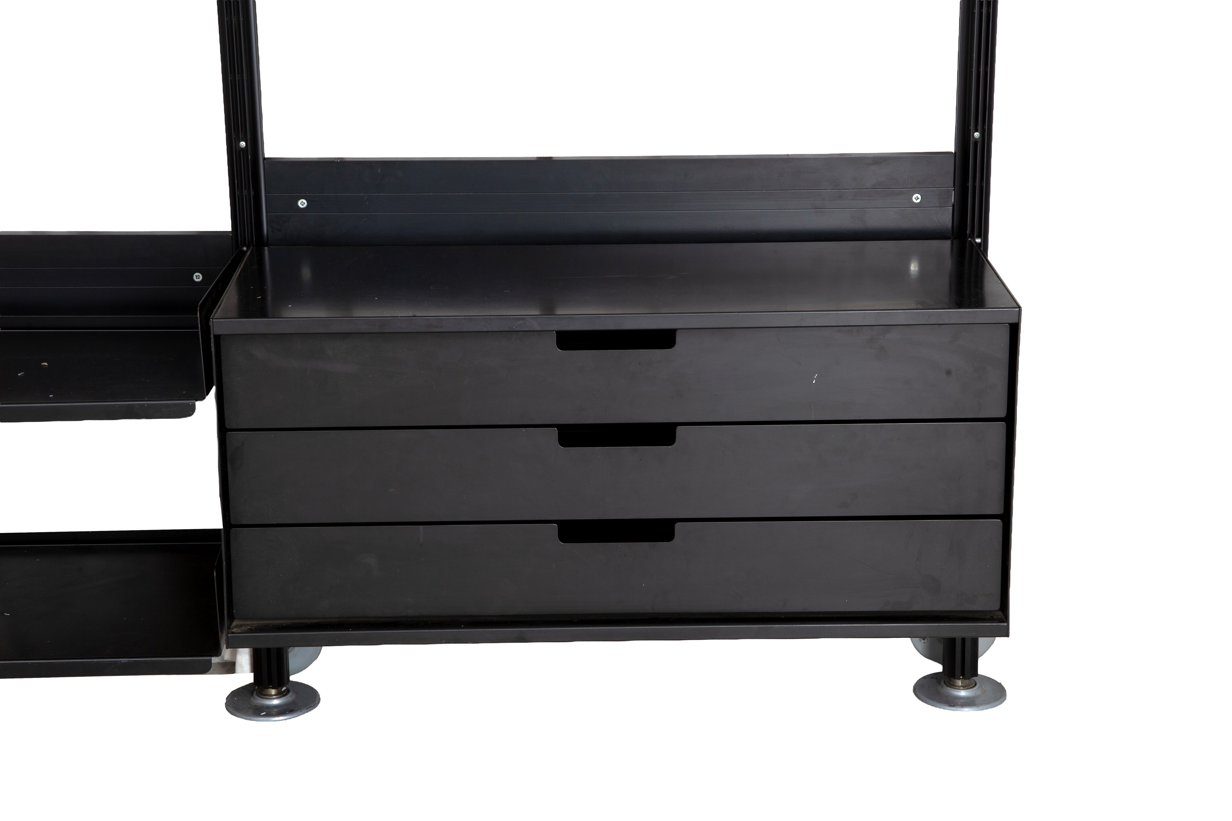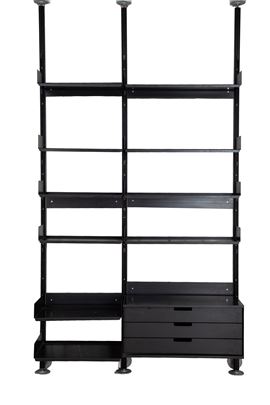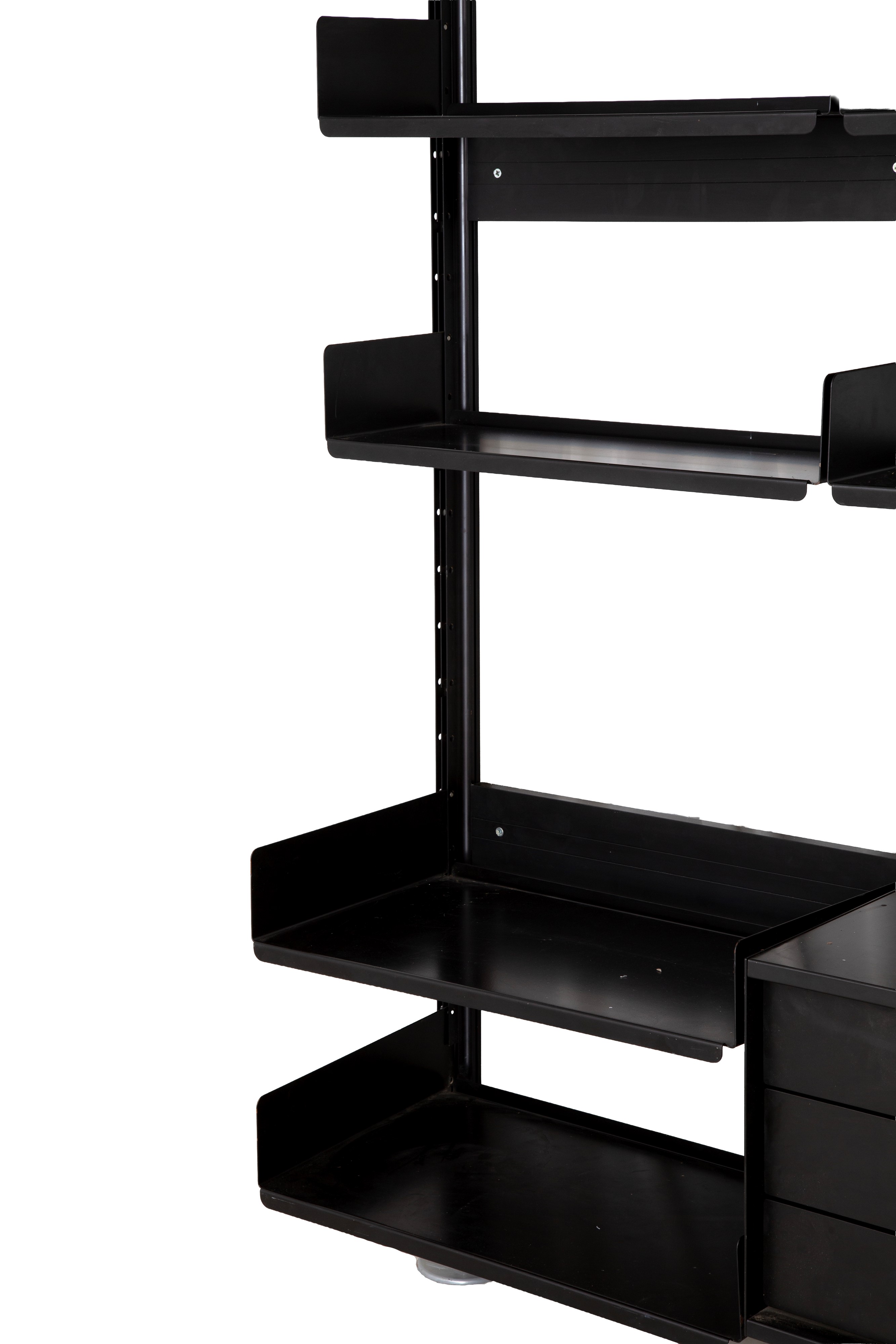 Model 606 Universal Shelving System bookcase with ten shelves and three drawers in black lacquered metal. Made by DE PADOVA (Attr.). Shows signs of wear and tear.