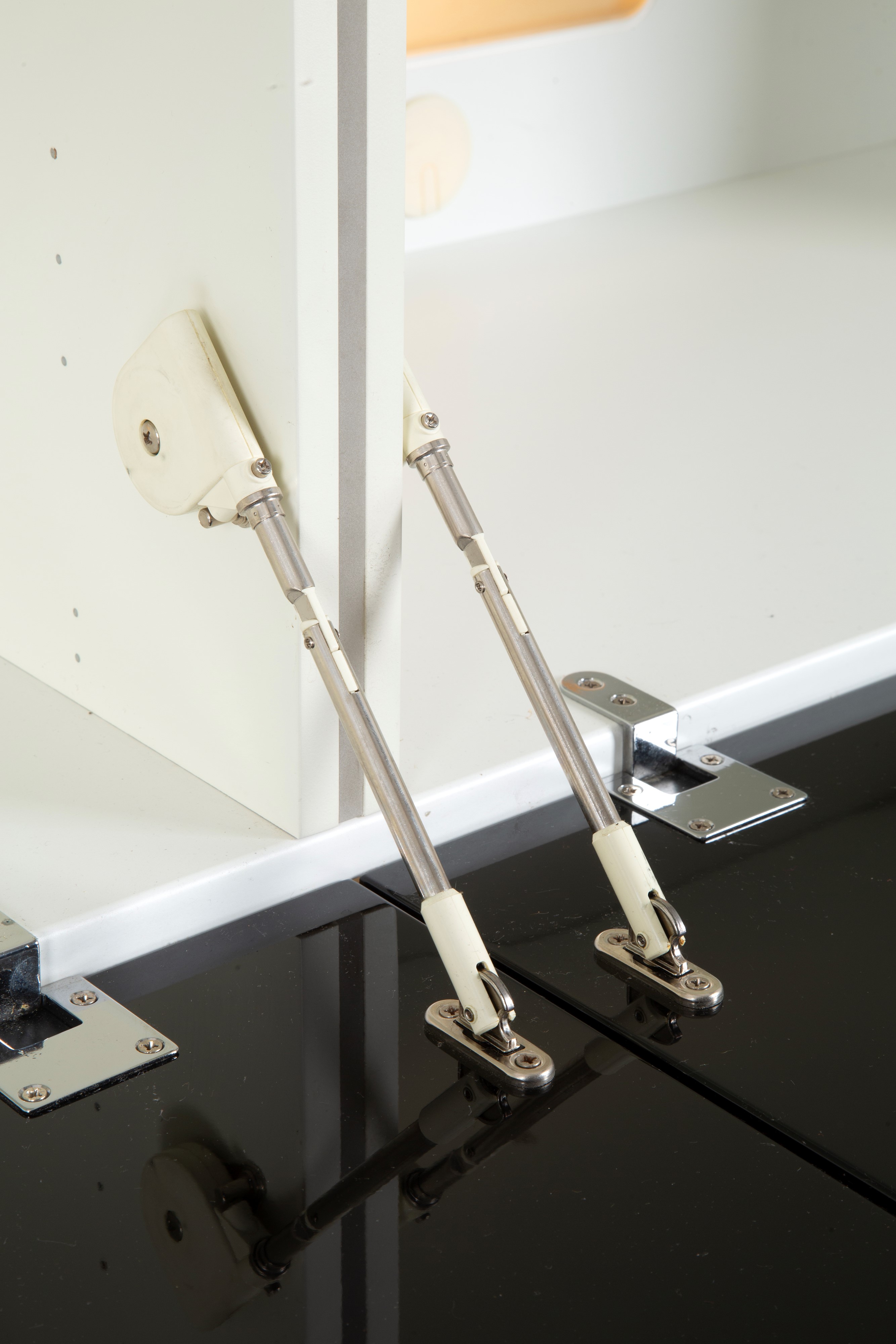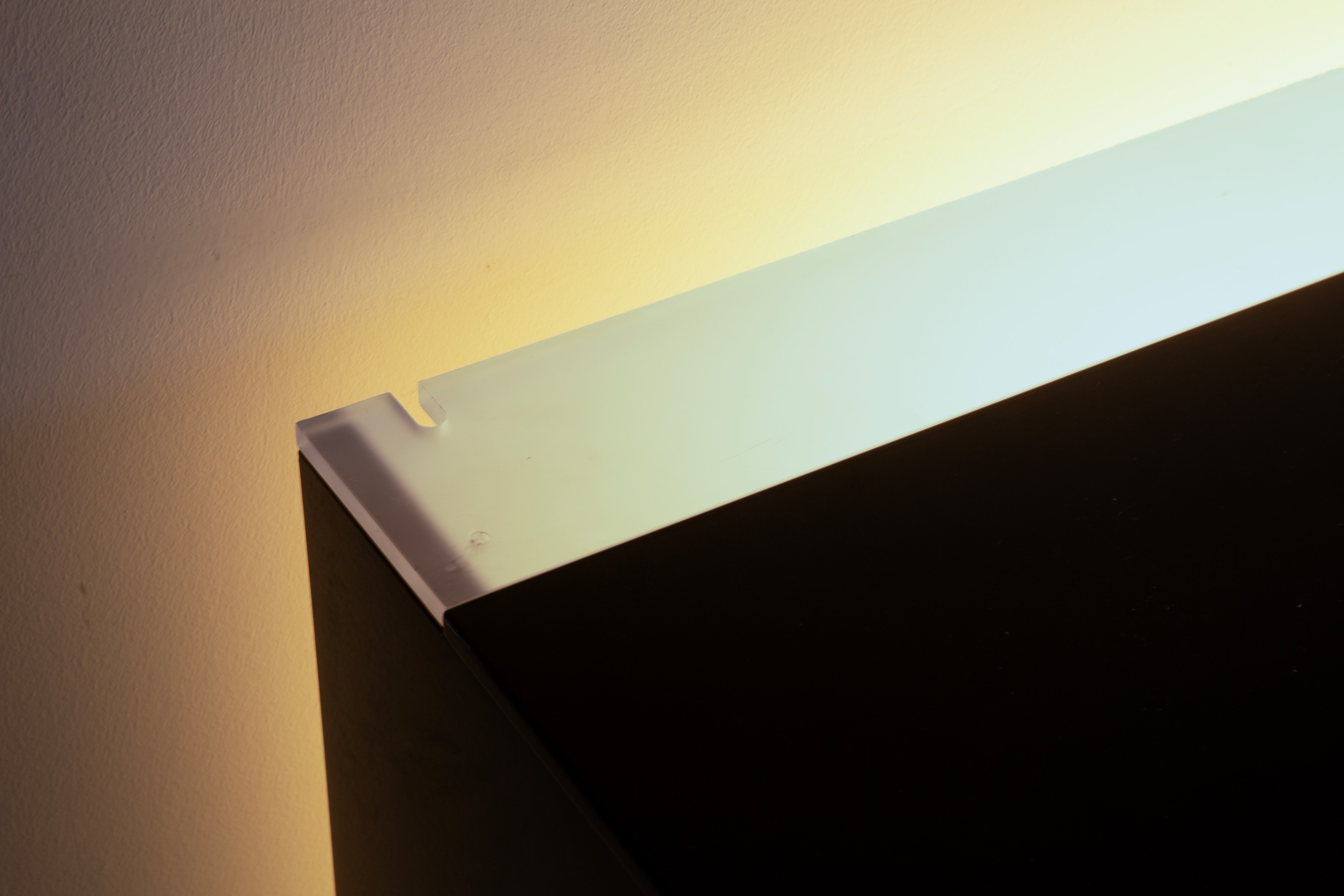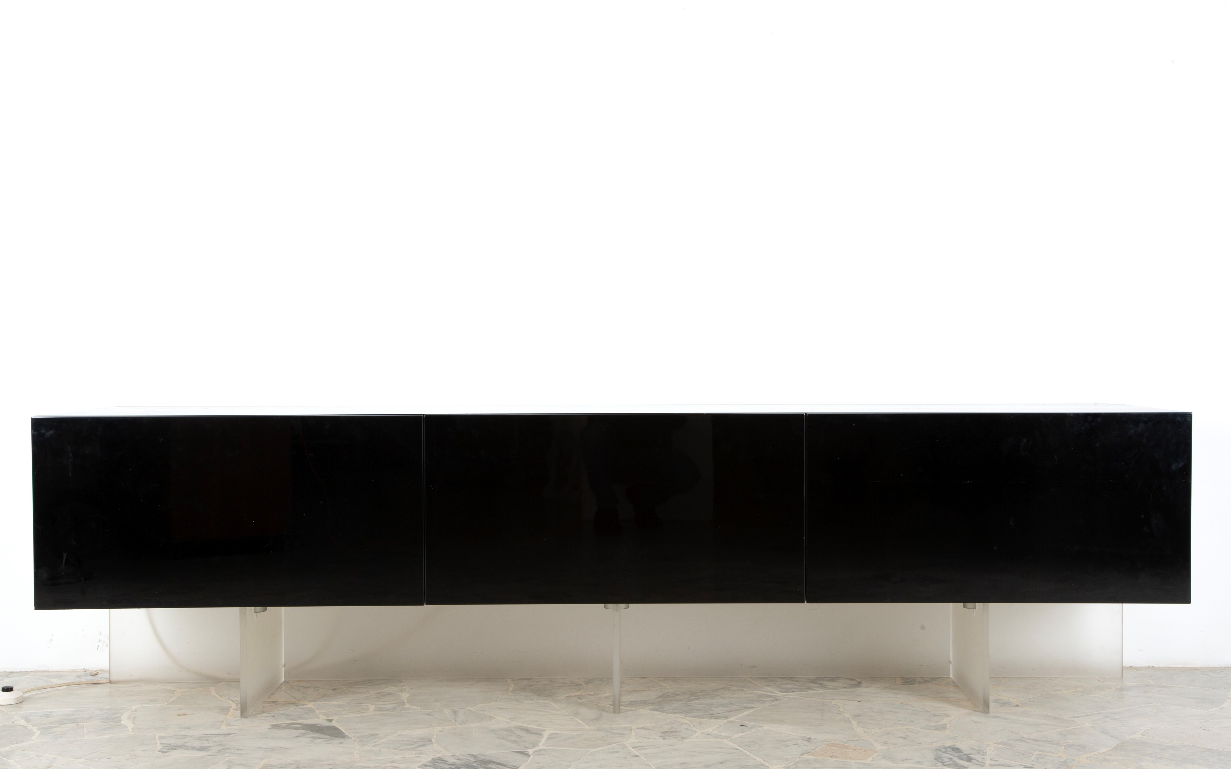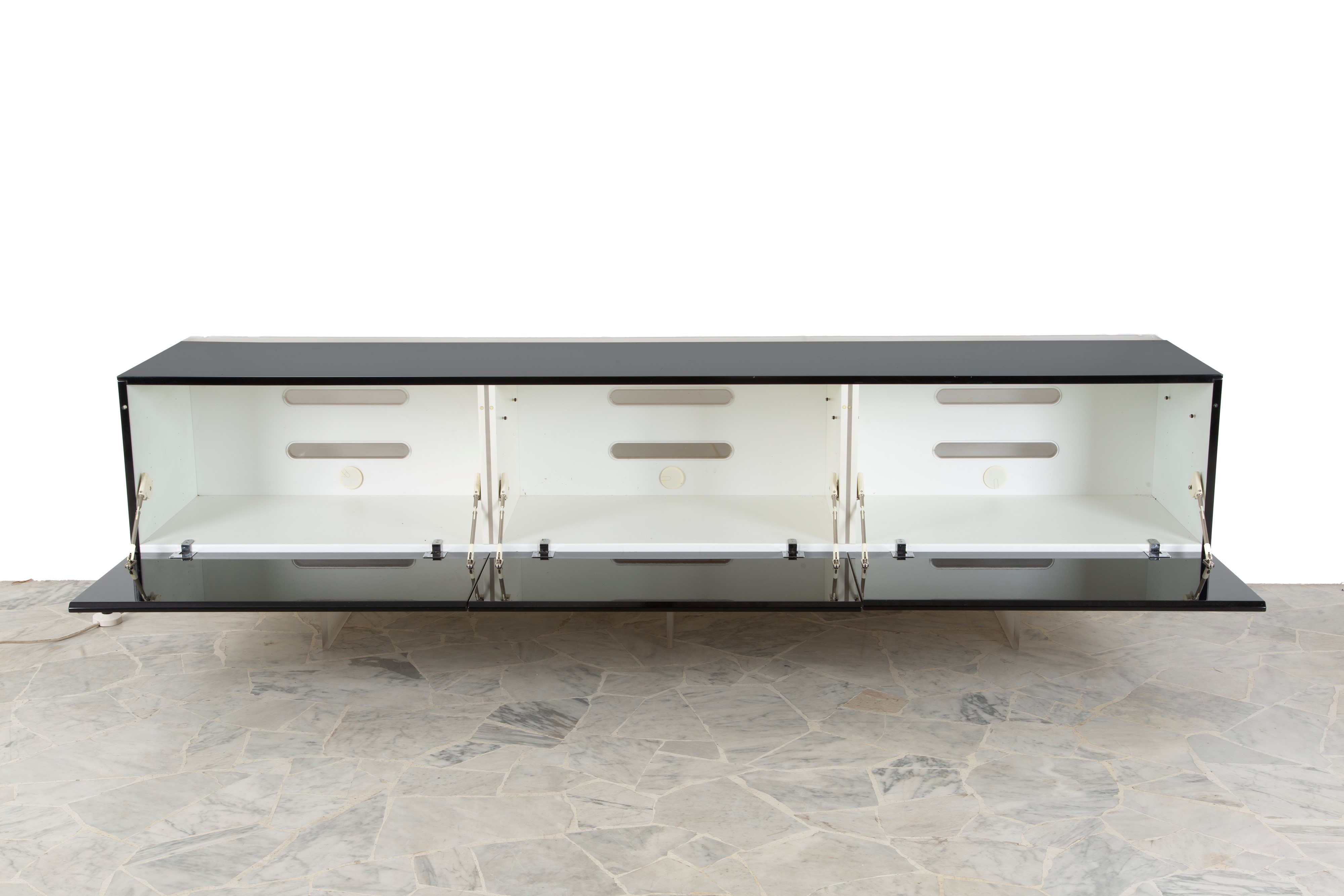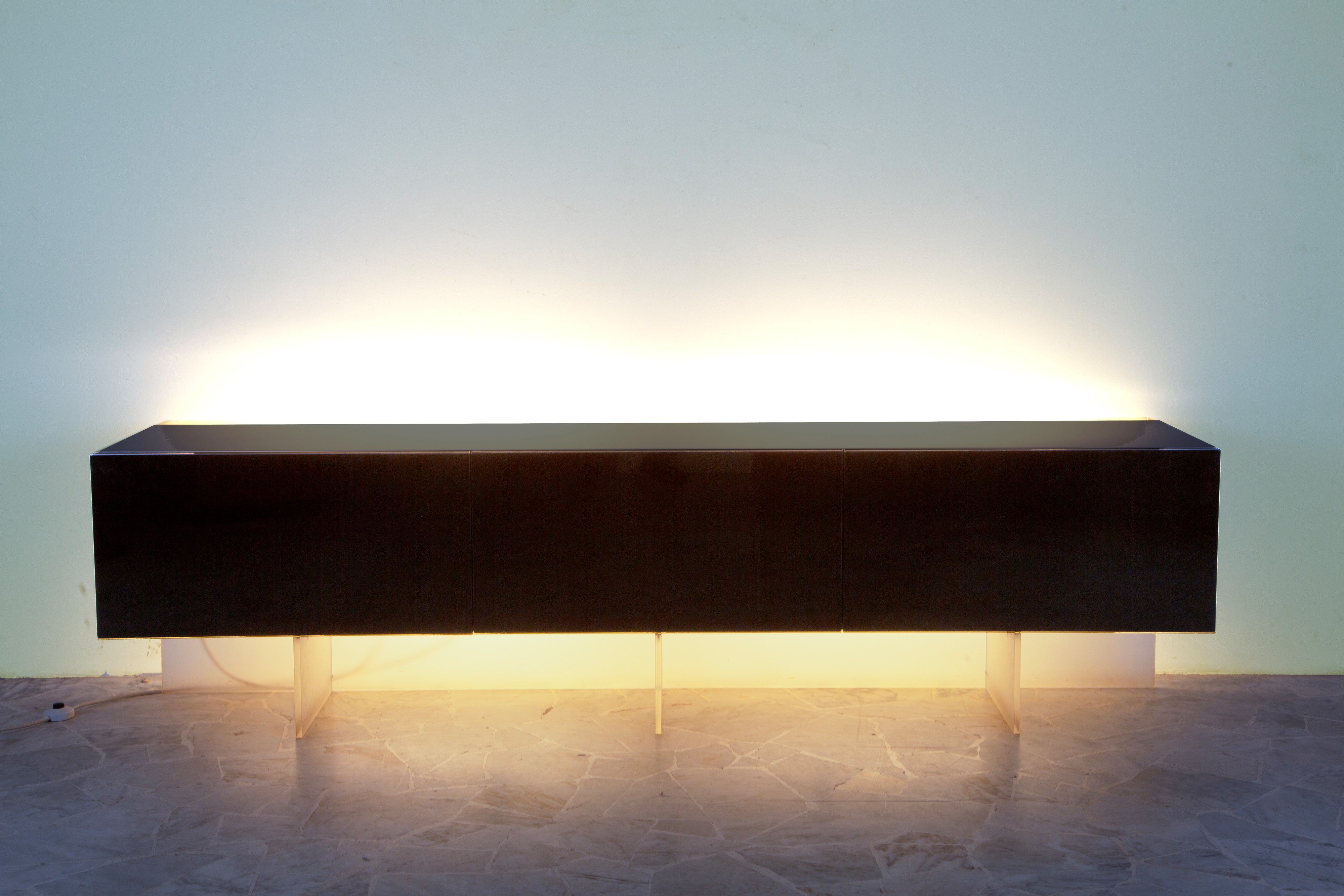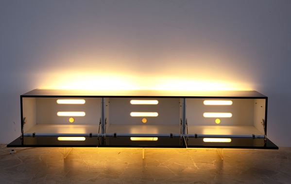 Sideboard in black lacquered wood and plastic with two backlit glass shelves. Manufactured by ACERBIS (Attr.). 1990s. Signs of wear and tear.