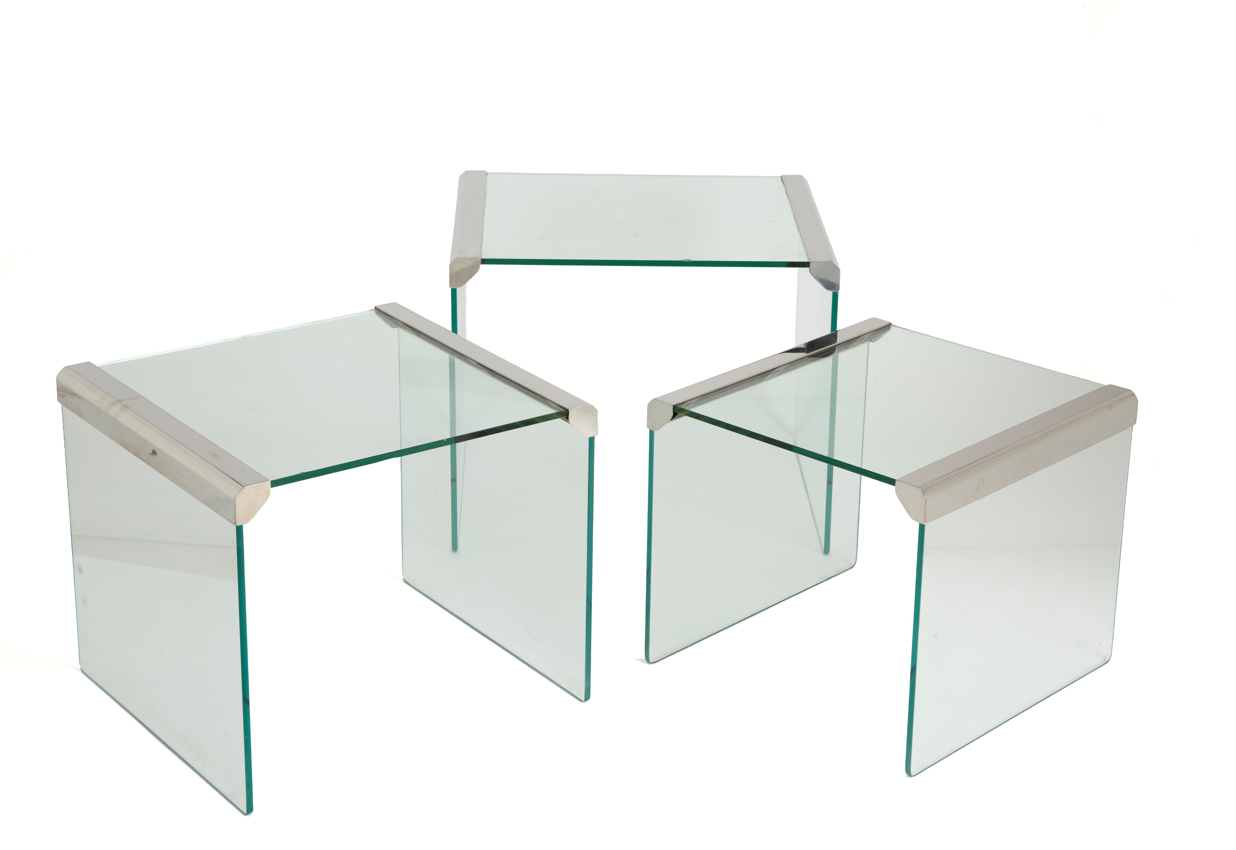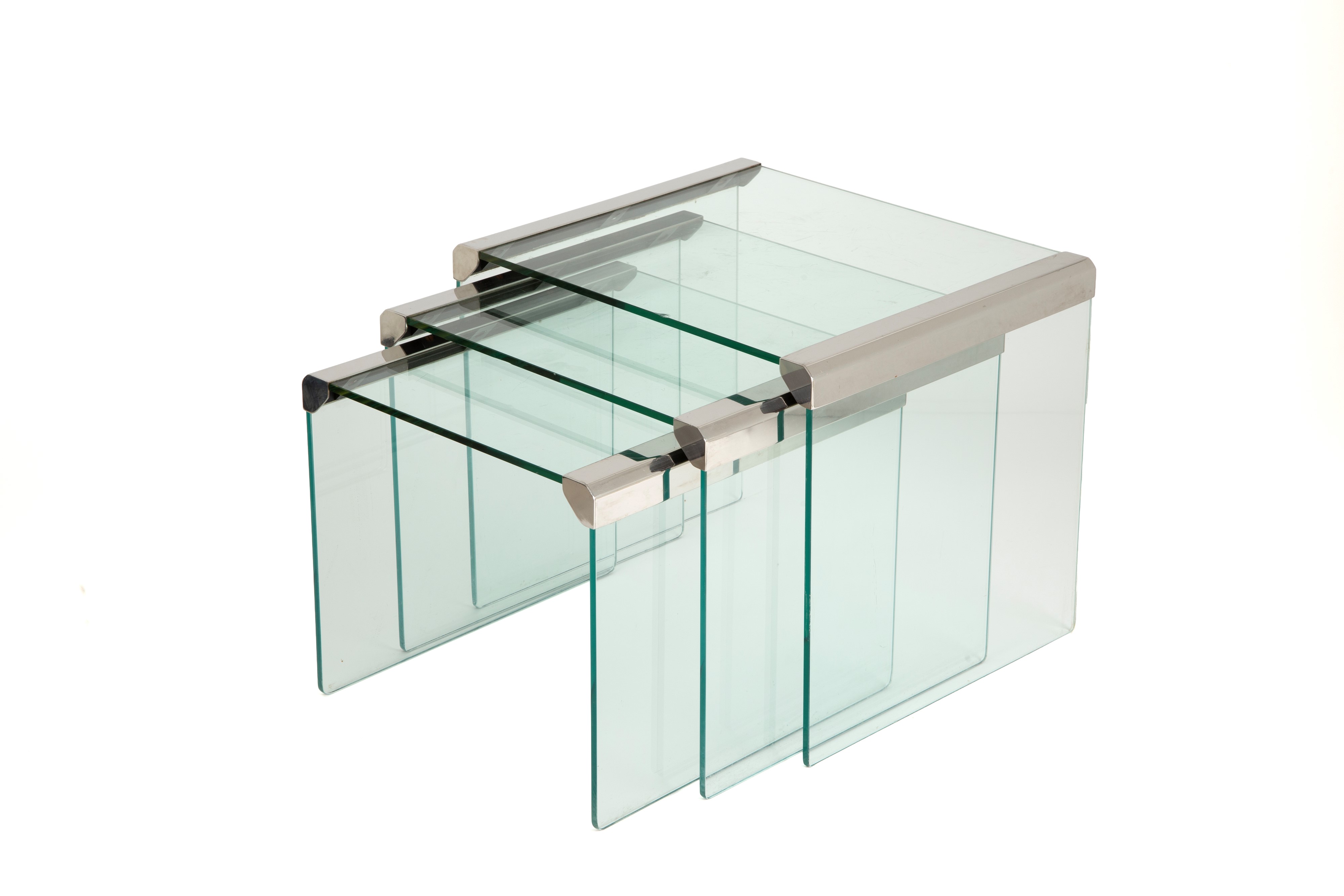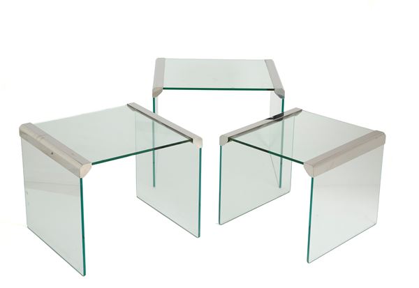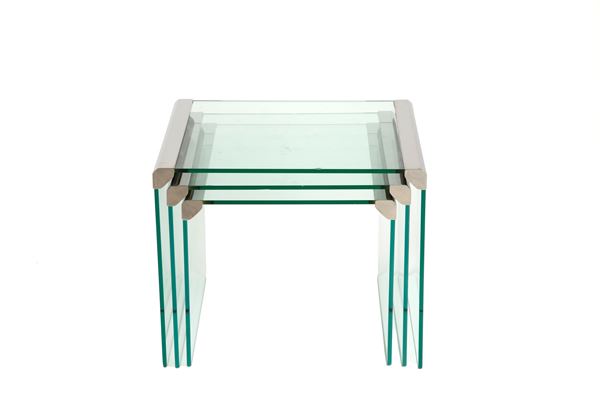 Three nesting tables in glass and nickel-plated brass. Made by Gallotti & Radice. 1970s. Defects and signs of wear.