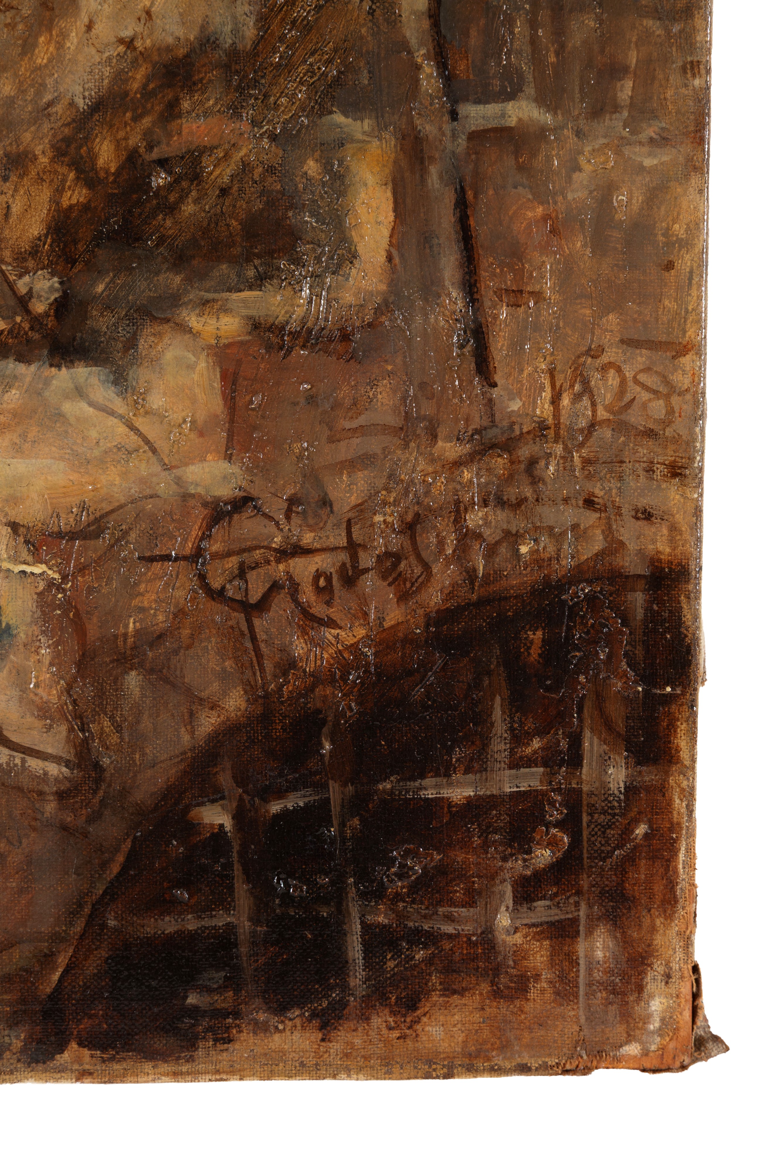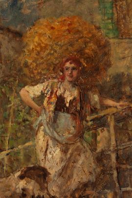 Oil on canvas depicting "PEASANT WOMAN". Signed and dated 1928 lower right. With a stamp of authenticity from a gallery in Bordighera. Framed.