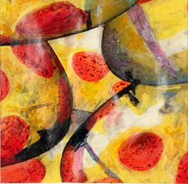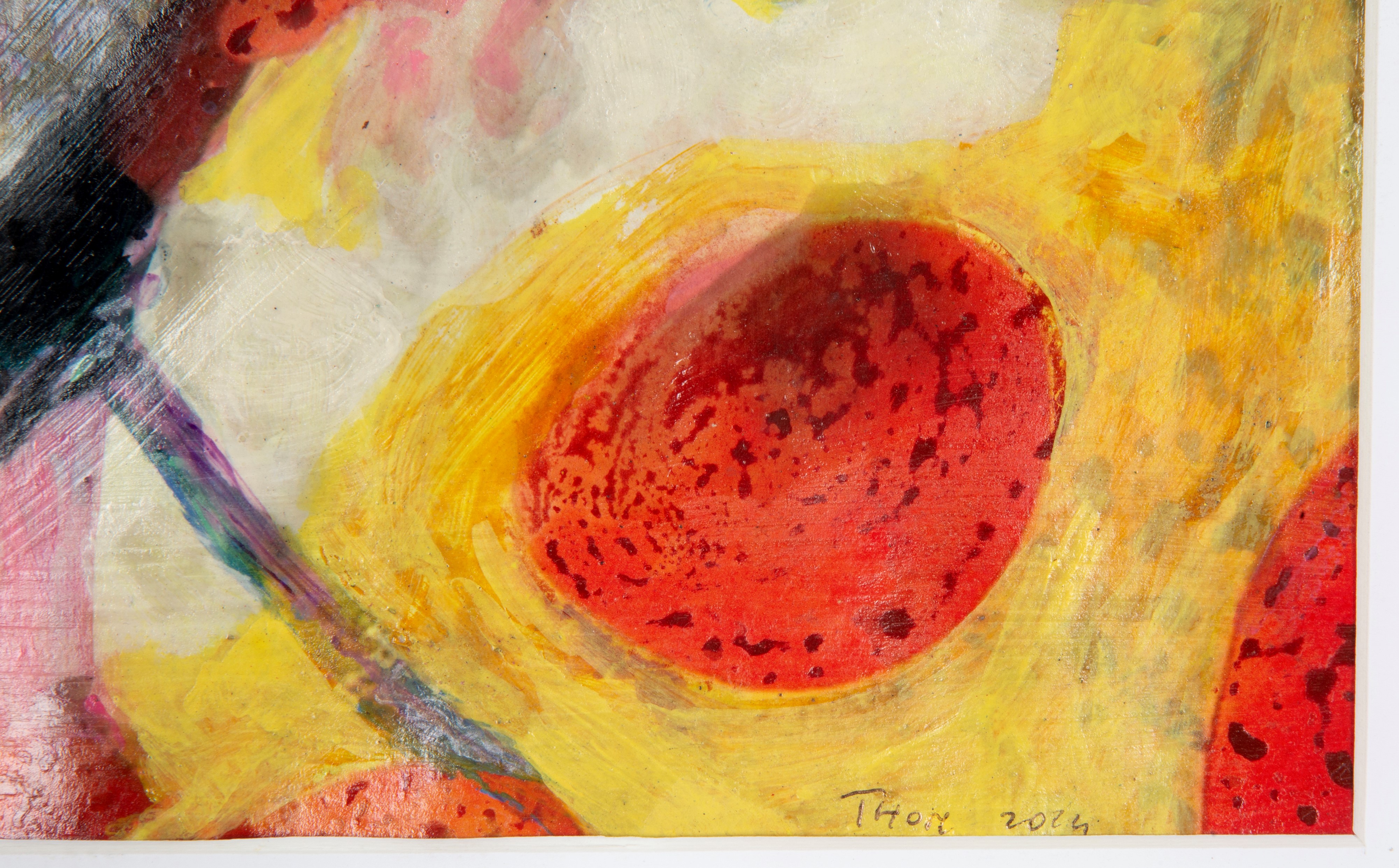 Mixed media on paper depicting "COLIMBO'S EGG." Signed and dated 2024 lower right. Framed.